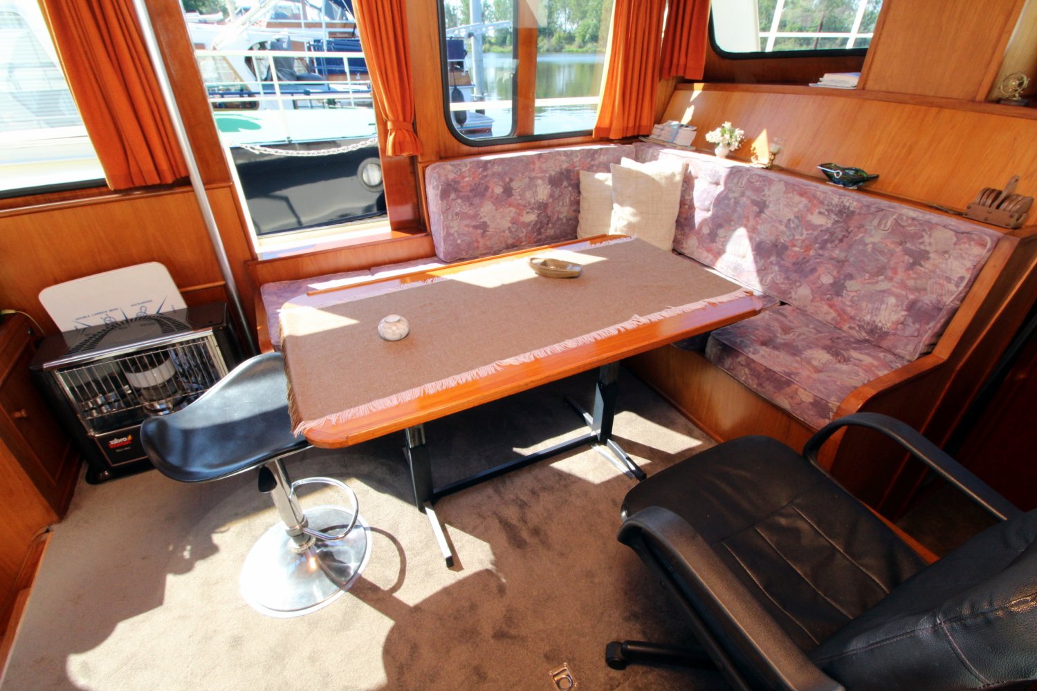 Vanaf de op het achterdek gelegen buiten stuurstand heeft u aan boord van deze Helenakruiser 1120 AK een goed overzicht op het schip en het vaarwater. Voldoende brede gangboorden zorgen er voor dat men zich prettig en veilig over het schip kan bewegen. Schuifdeuren geven toegang tot de salon, waar door grote ramen gezellig veel daglicht naar binnen schijnt. Een comfortabele bank nodigt hier uit om plaats te nemen en te genieten van het uitzicht. In het vooronder treft men een zeer ruime kombuis met een dinette aan, die men kan veranderen in een slaapplaats voor 4 personen! Verder heeft men een heerlijk bed in de eigenaars hut tot zijn beschikking en een verrassend ruim toilet met wastafel.