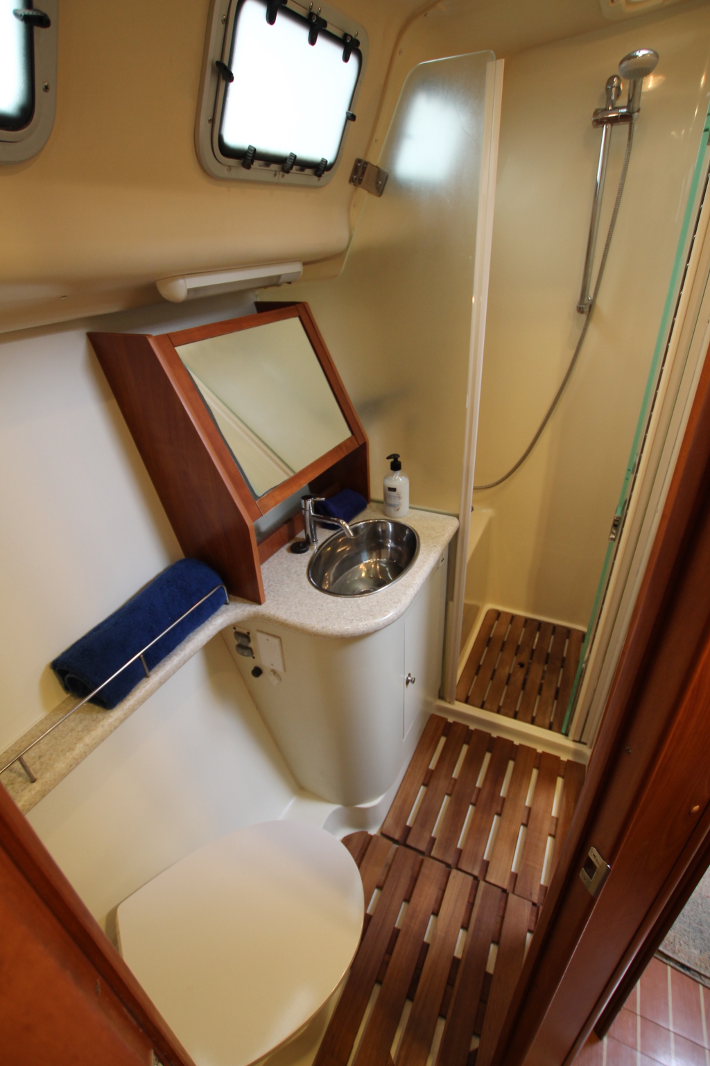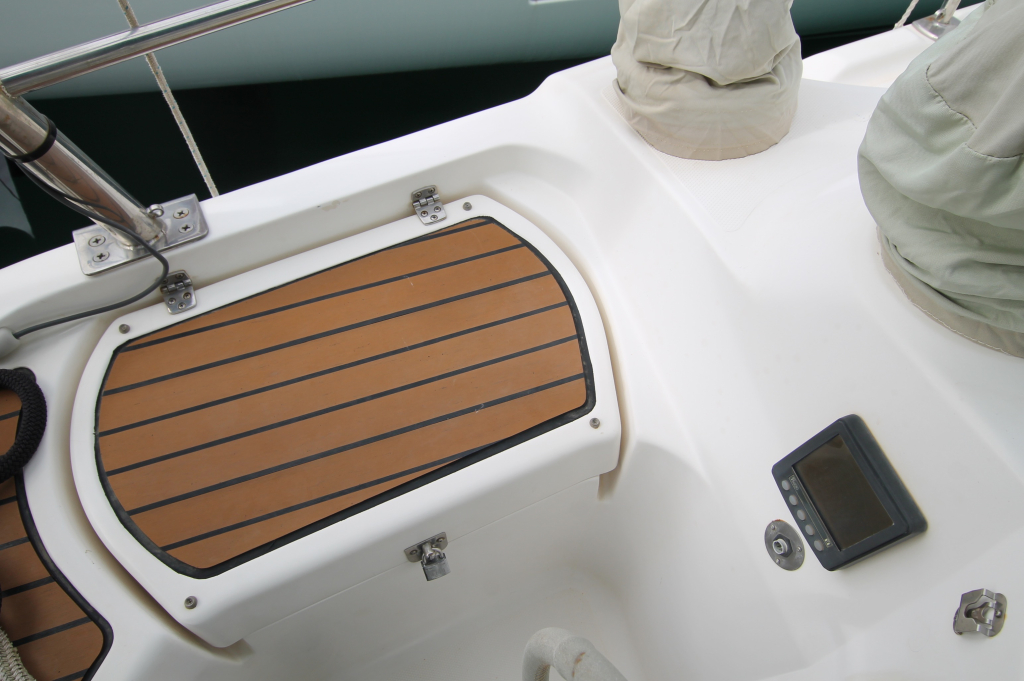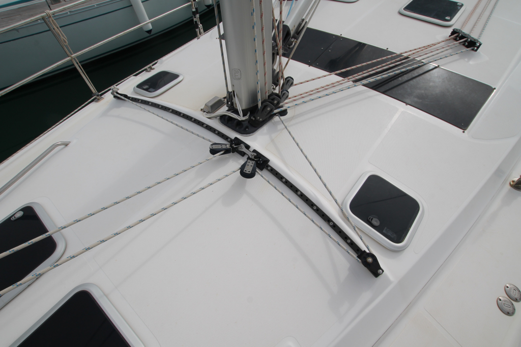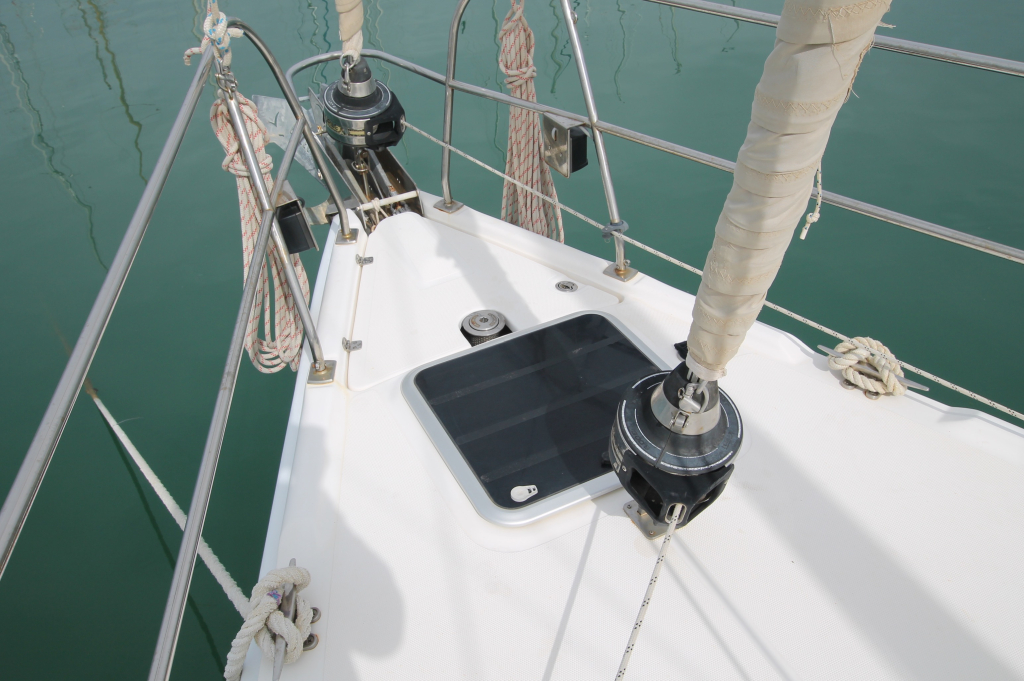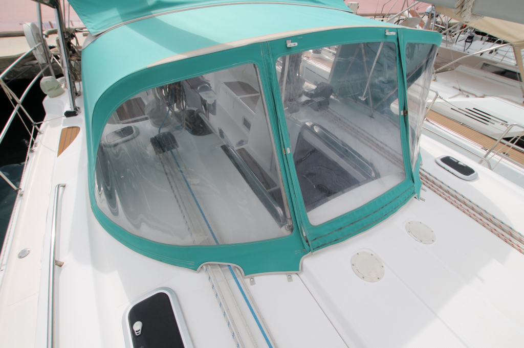 COCKPIT. Green colored Bimini and Spray-hood (2022). Bimini construction is a Harker Design in Stainless Steel. Stainless steel dinghy davits in-line with top of Bimini construction. Six solar panels installed in stainless steel frame above Bimini totaling 930w. Wheel: 2 helms covered in leather. Cockpit table: Folding with cup holders. Transom style: Walk through transom from swim platform and integrated swimming ladder. Folding Teak and Stainless Steel 2.3m pasarelle for use when mooring stern to in the Mediterranean. Transom shower with hot and cold water. Cockpit cushions in good condition. Cockpit Cover: Bimini, Dodger, Connector, Side Covers. In green colored ‘Sunbrella” fabric. Other covers: reasonable condition covers for all the hatches, windows, winches and Raymarine Instruments, Shade cover for 3/4 of deck (fits over boom & around mast). No wheel covers. Light and accessory sockets and VX-502 Bluetooth Stereo with 2 marine speakers. Stern rail seats: two seats with cushions and back rail cushions. Other: 4 throw cushions.