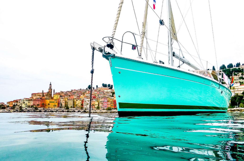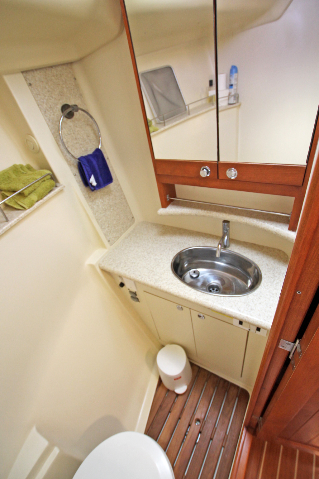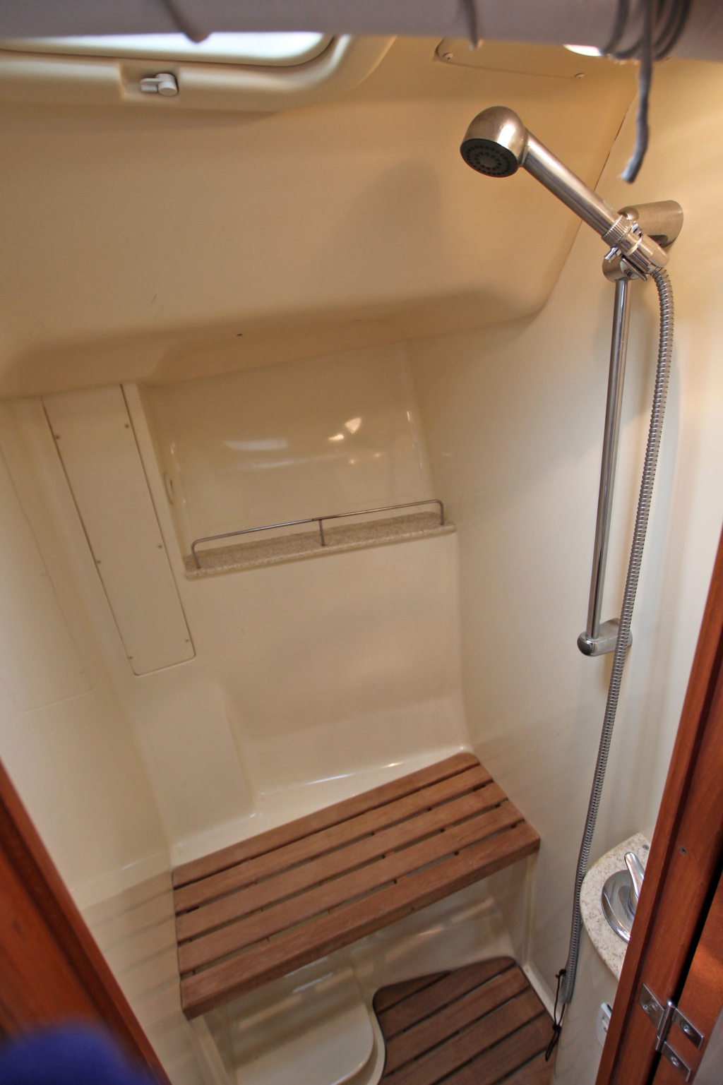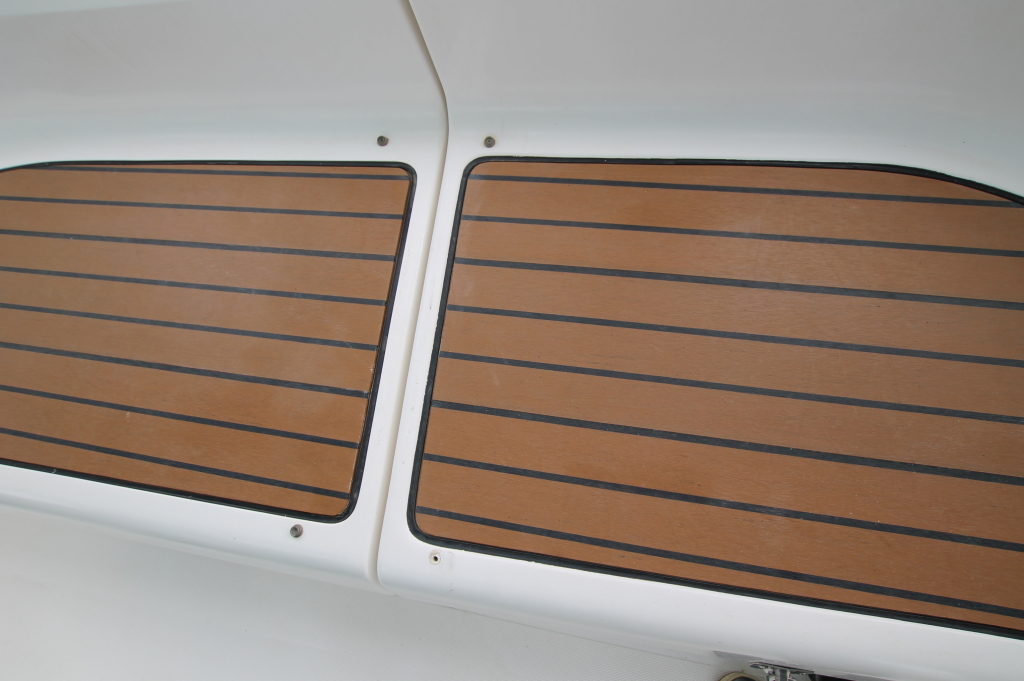 COCKPIT. Green colored Bimini and Spray-hood (2022). Bimini construction is a Harker Design in Stainless Steel. Stainless steel dinghy davits in-line with top of Bimini construction. Six solar panels installed in stainless steel frame above Bimini totaling 930w. Wheel: 2 helms covered in leather. Cockpit table: Folding with cup holders. Transom style: Walk through transom from swim platform and integrated swimming ladder. Folding Teak and Stainless Steel 2.3m pasarelle for use when mooring stern to in the Mediterranean. Transom shower with hot and cold water. Cockpit cushions in good condition. Cockpit Cover: Bimini, Dodger, Connector, Side Covers. In green colored ‘Sunbrella” fabric. Other covers: reasonable condition covers for all the hatches, windows, winches and Raymarine Instruments, Shade cover for 3/4 of deck (fits over boom & around mast). No wheel covers. Light and accessory sockets and VX-502 Bluetooth Stereo with 2 marine speakers. Stern rail seats: two seats with cushions and back rail cushions. Other: 4 throw cushions.