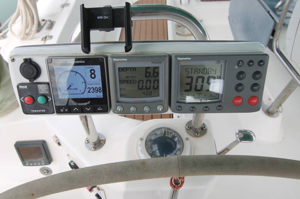 OUTSIDE: Raymarine Axiom 12 Pro Networked Display, 1x ICom Remote Control Microphone HM-157, ST60+Tridata Instruments - Depth, Speed, Wind & Close Hauled Wind , Raymarine SmartPilot Autopilot.
