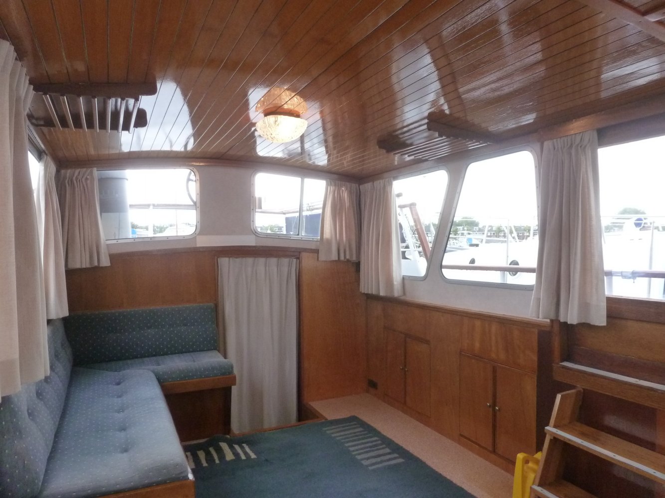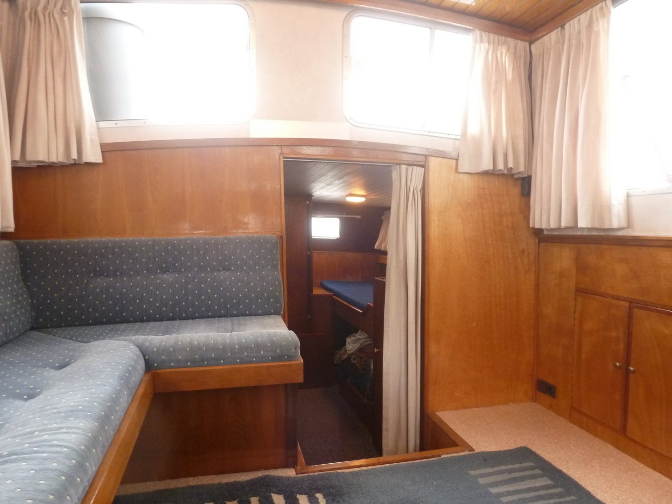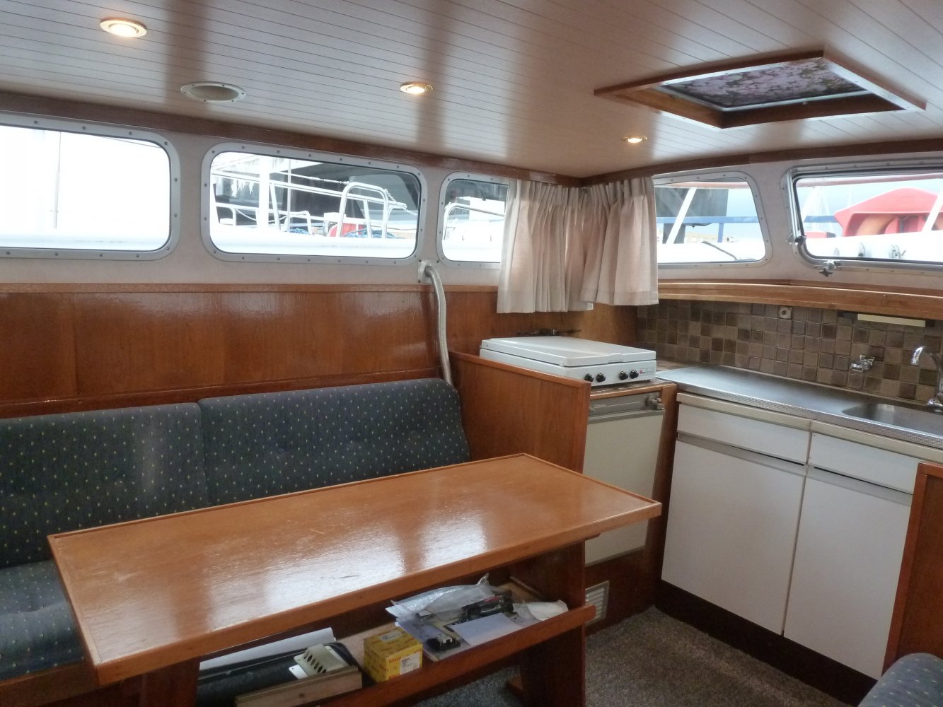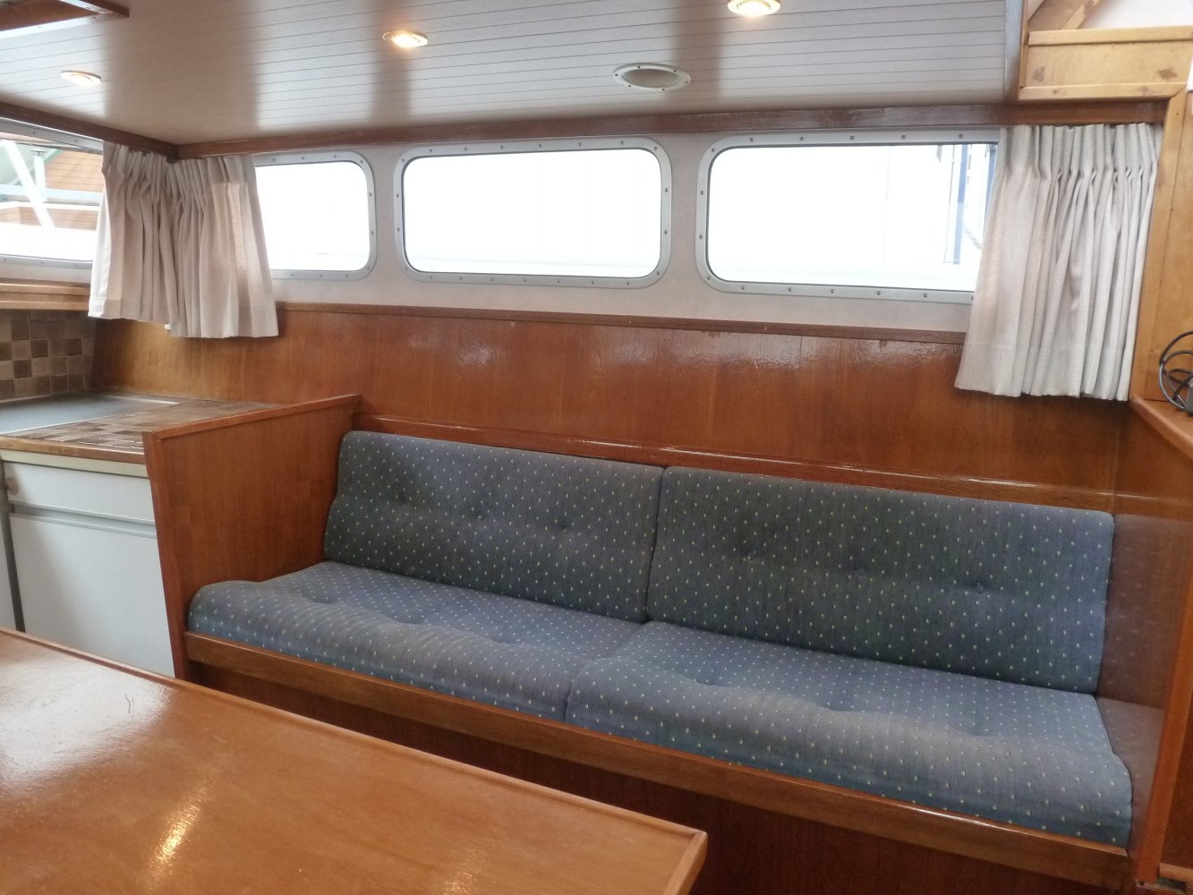 De salon met een L vormige bank heeft de enorm handige zij uitgangen wat het schip geschikt maakt om door een enkel persoon te bevaren. Je legt het schip bijvoorbeeld vanuit het midden vast in een sluis. De salon heeft een prachtig hoogglans blank gelakt plafond wat echt in nieuw staat is.