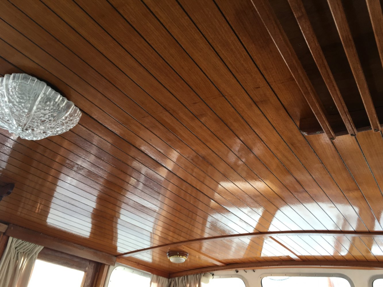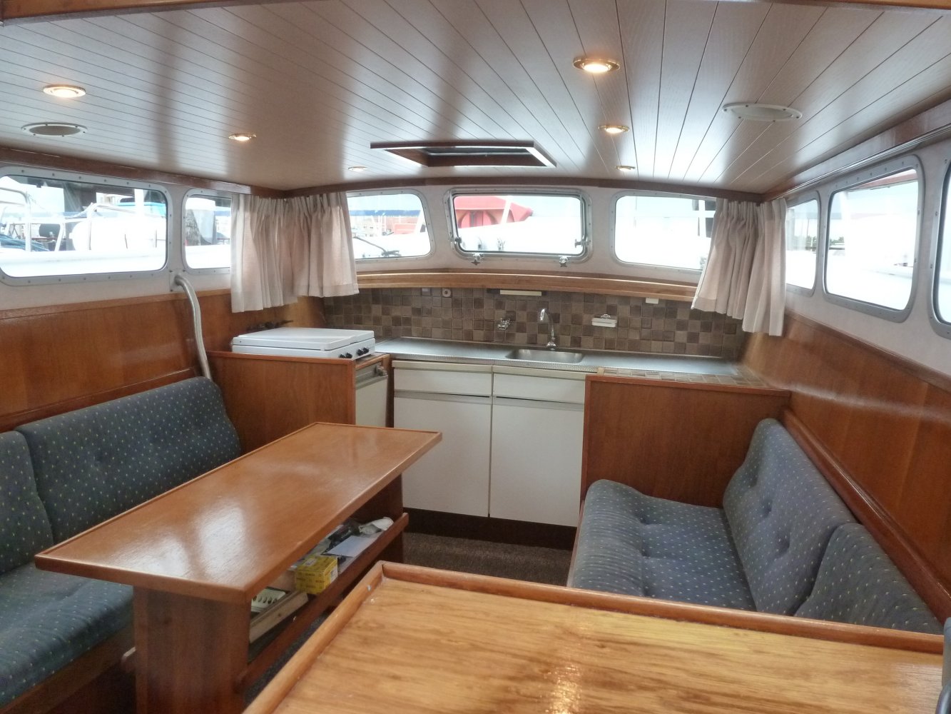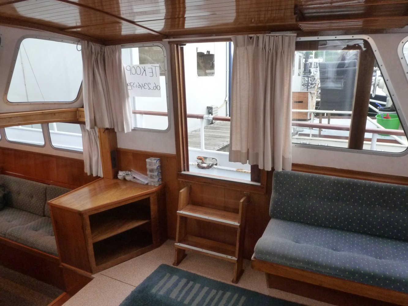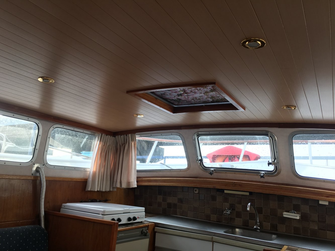 De salon met een L vormige bank heeft de enorm handige zij uitgangen wat het schip geschikt maakt om door een enkel persoon te bevaren. Je legt het schip bijvoorbeeld vanuit het midden vast in een sluis. De salon heeft een prachtig hoogglans blank gelakt plafond wat echt in nieuw staat is.