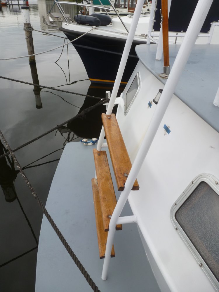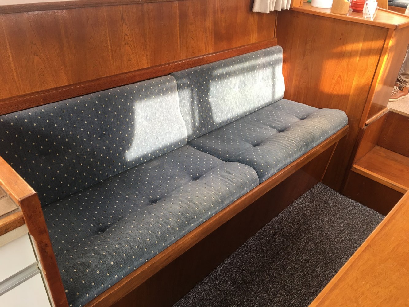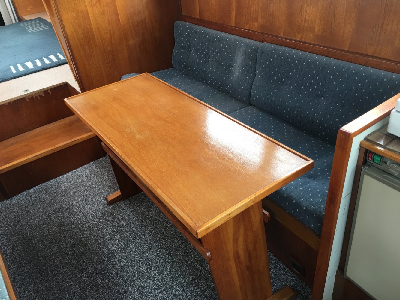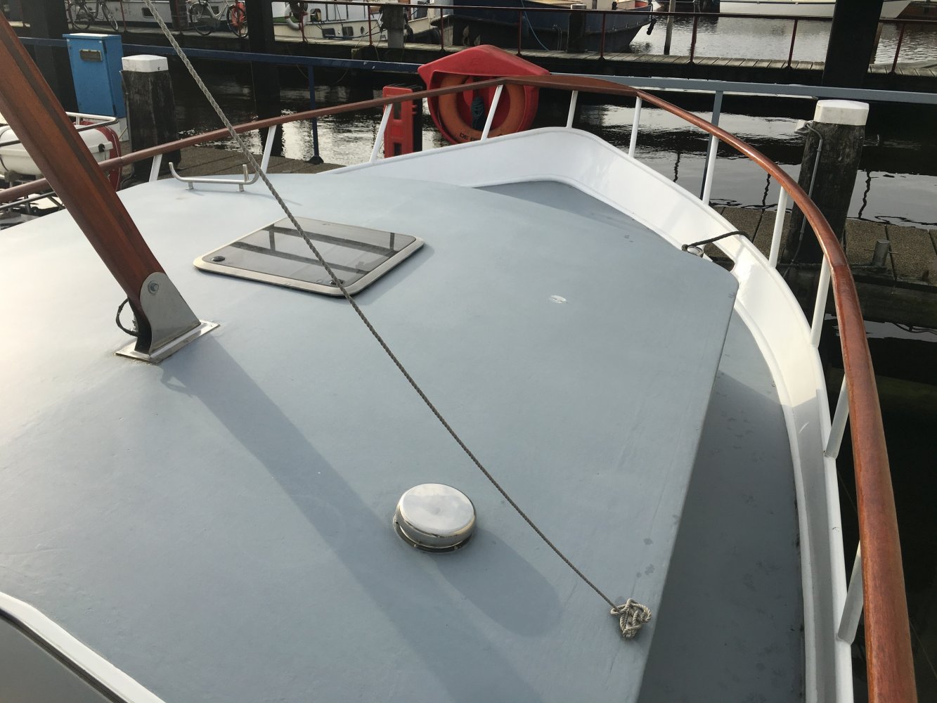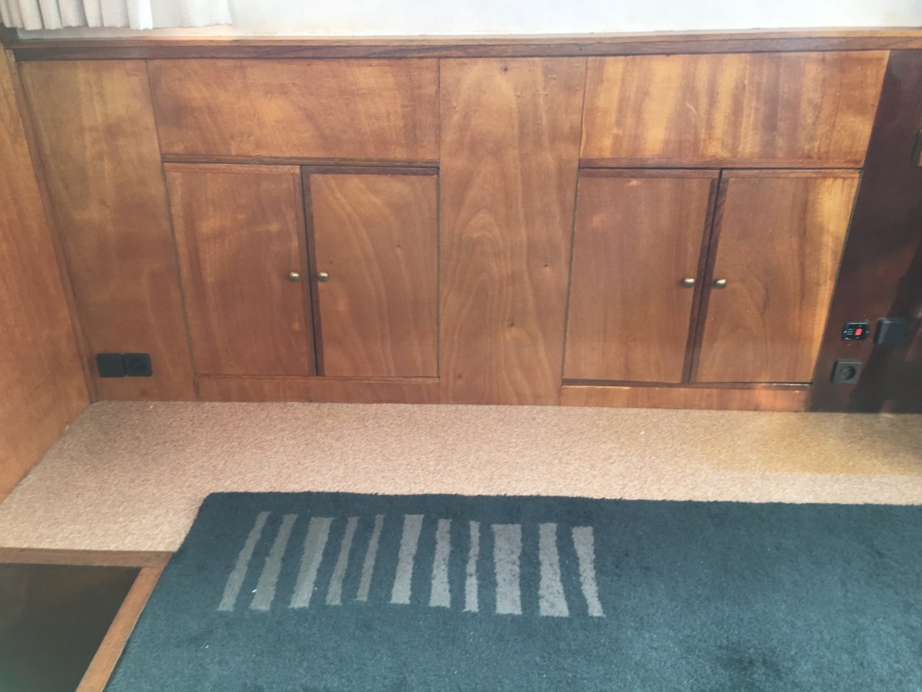 De salon met een L vormige bank heeft de enorm handige zij uitgangen wat het schip geschikt maakt om door een enkel persoon te bevaren. Je legt het schip bijvoorbeeld vanuit het midden vast in een sluis. De salon heeft een prachtig hoogglans blank gelakt plafond wat echt in nieuw staat is.