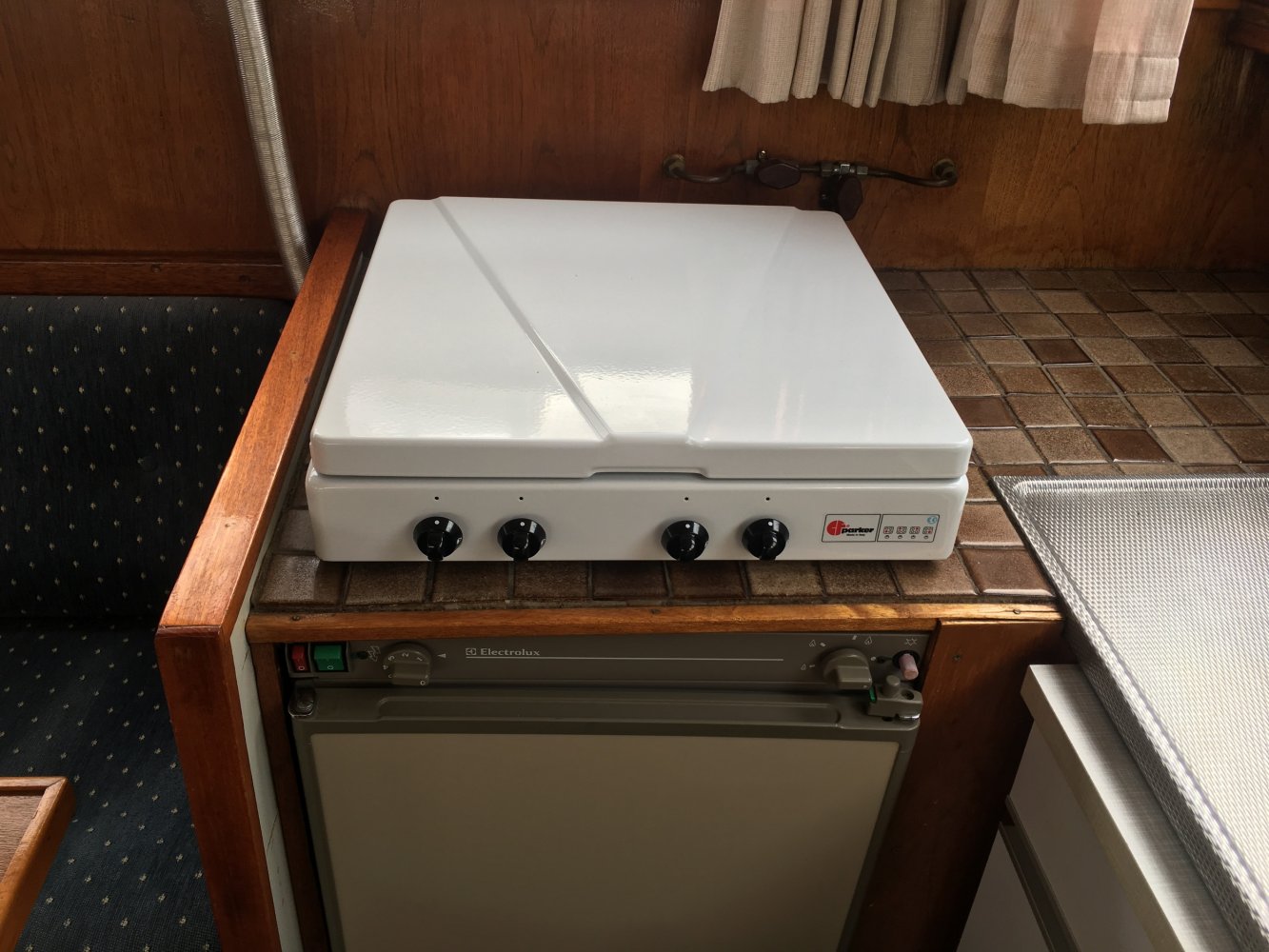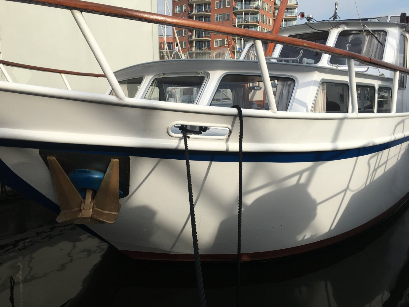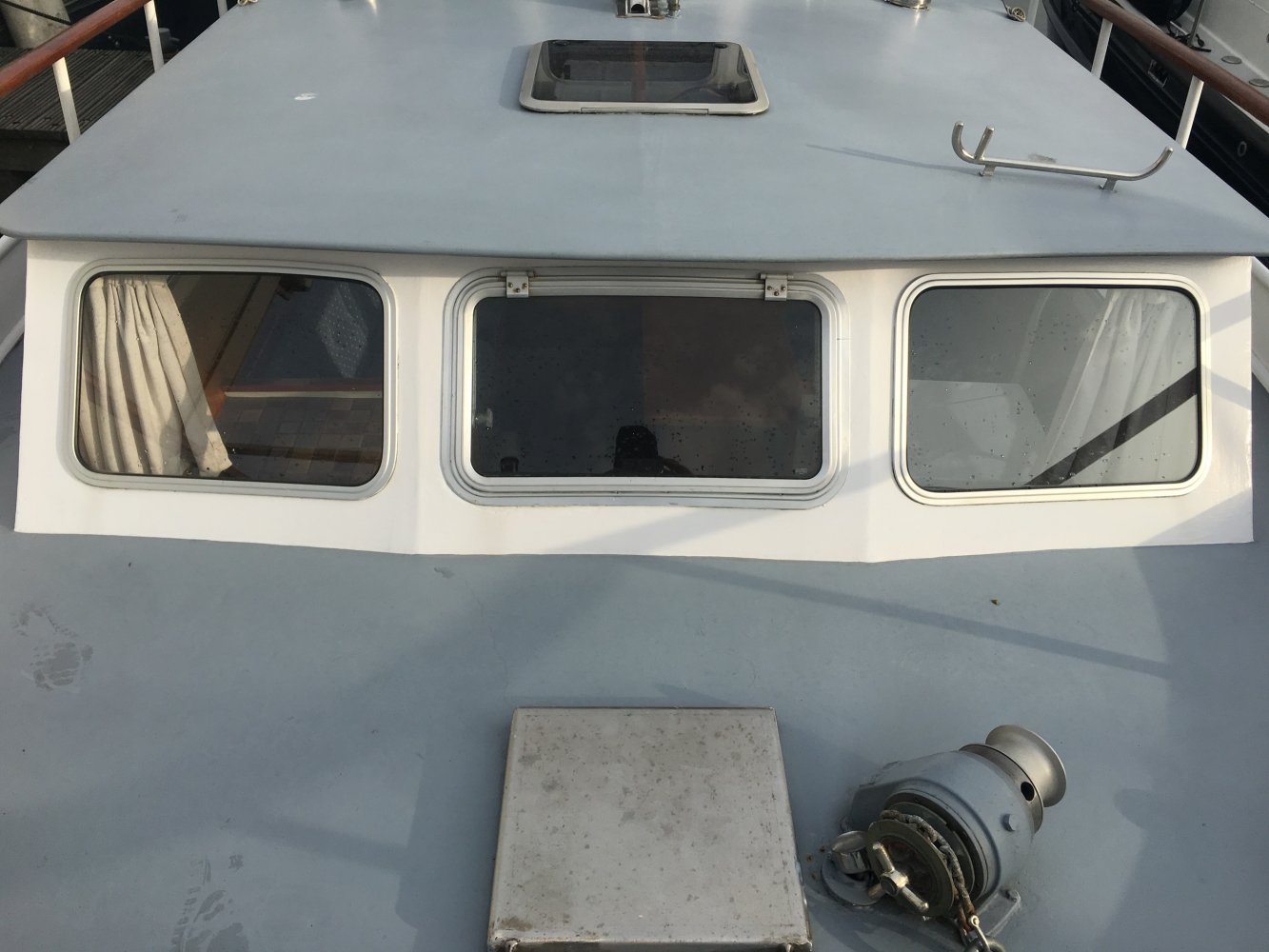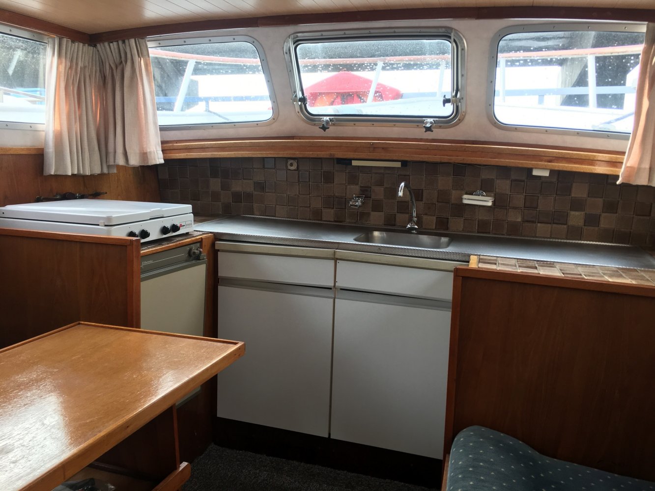 Alle ramen in de salon en in het voor schip zijn kurk droog en hebben totaal geen water schade. In de voor salon is de keuken met een lang RVS aanrecht plus nette 43 liter koelkast en 4 pits gasfornuis. Het leuke hiervan is dat je tijdens het koken heerlijk naar buiten kunt kijken. Naast de aanrecht is gelijk de kitchenette gebouwd zodat je handig vanaf de keuken het eten kunt opdienen. De kitchenette bestaat uit een mooi hoogglans blank gelakte tafel met keurige grote lange salonzitbank. Tegenover de eettafel is er nog een extra rust lounge bank. In deze voor cabine zijn ook 2 slaapplaatsen te creëren.