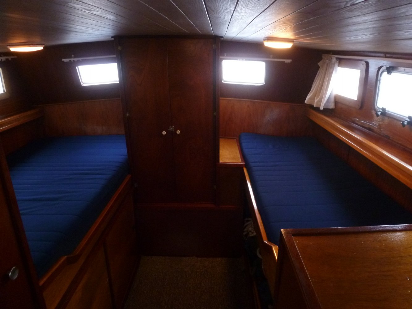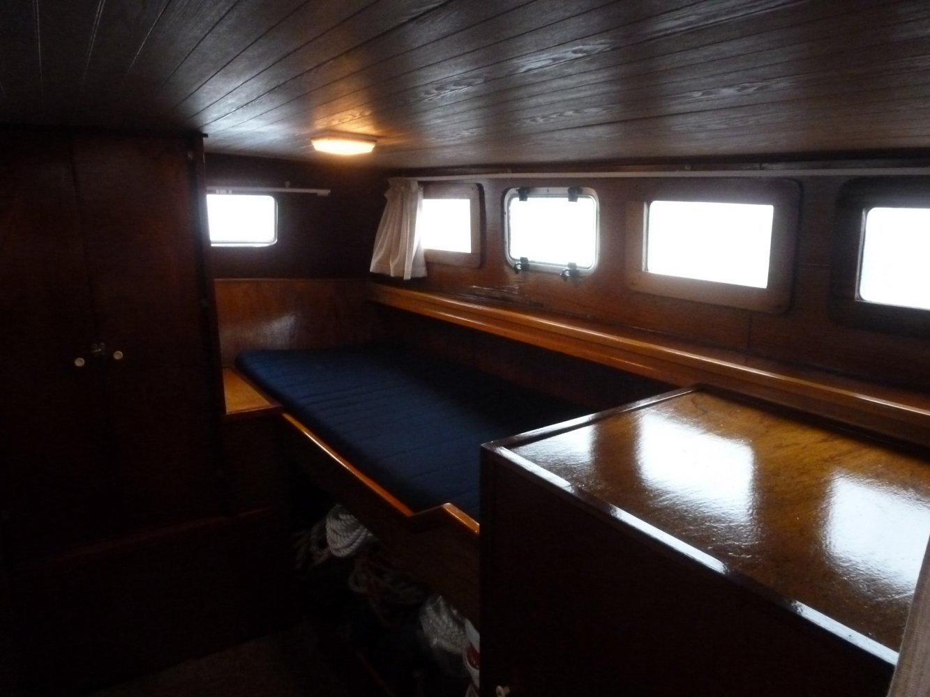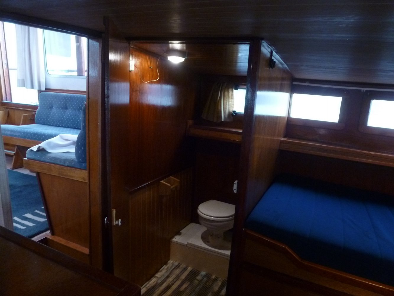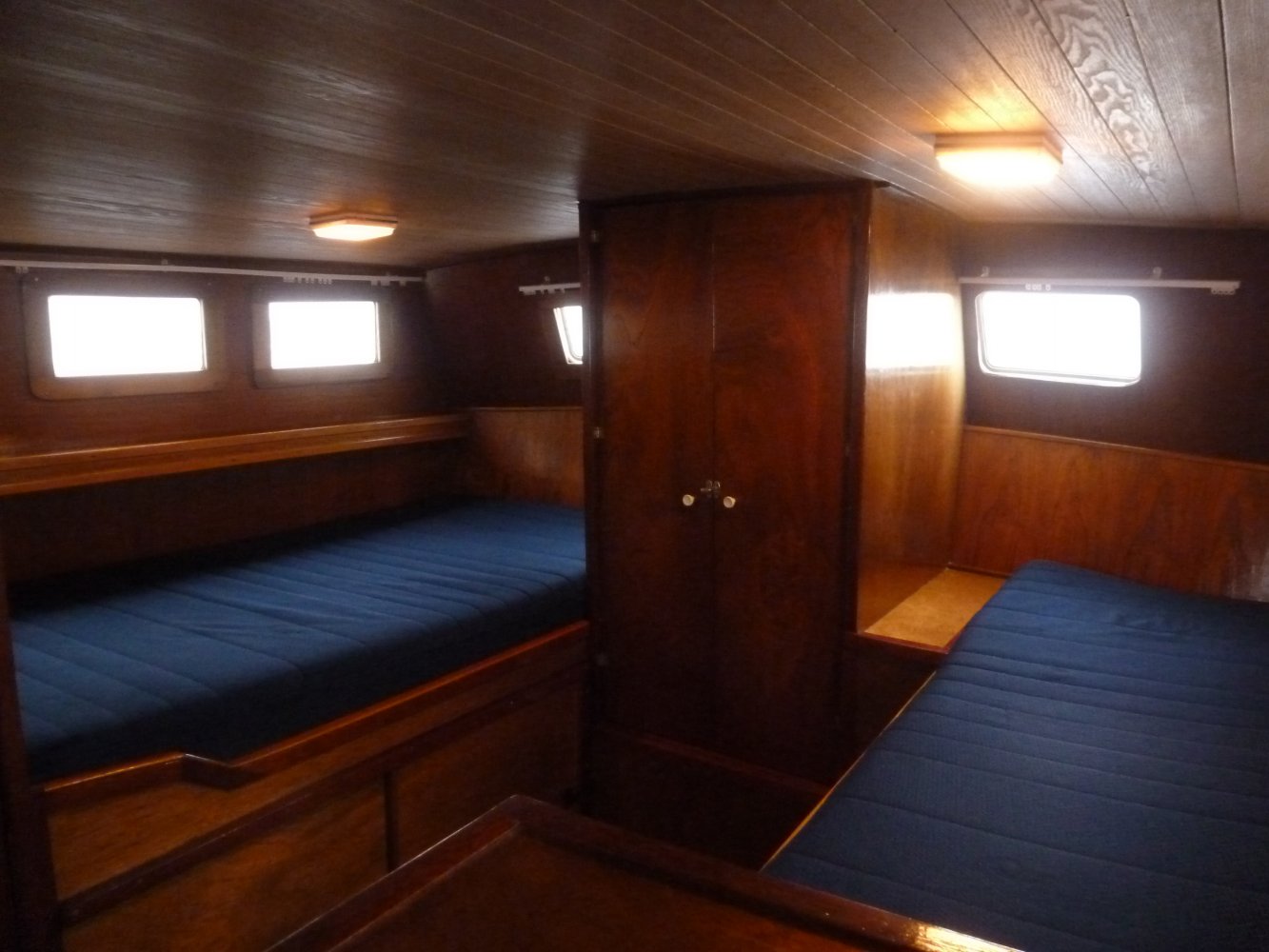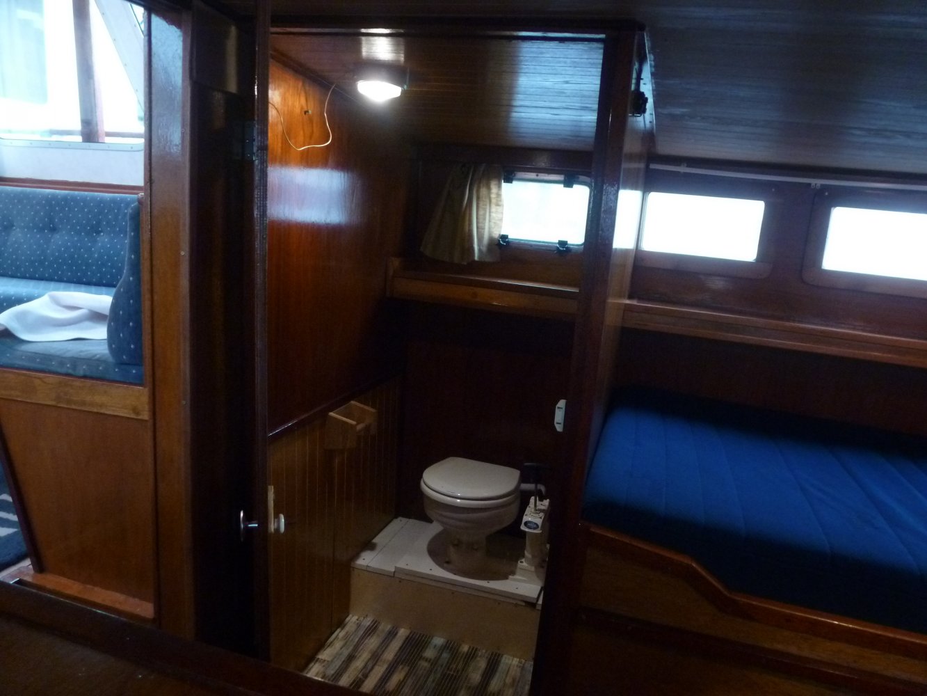 Het toilet is zeer ruim erg schoon en voorzien van daglicht en ruime ventilatie. De eigenaarscabine is lekker groot en heeft veel kastruimtes en naast 2 bedden een stapelbed en grote onmisbare hangkast. De achtercabine de eigenaarscabine heeft een teakhouten interieur wat is afgewerkt met hoogglans blanke lak. Onder de bedden zijn kasten gemaakt op dingen op te bergen. De eigenaars cabine heeft ongeveer 10 ramen dus heel veel daglicht en voldoende ventilatie mogelijkheden.
