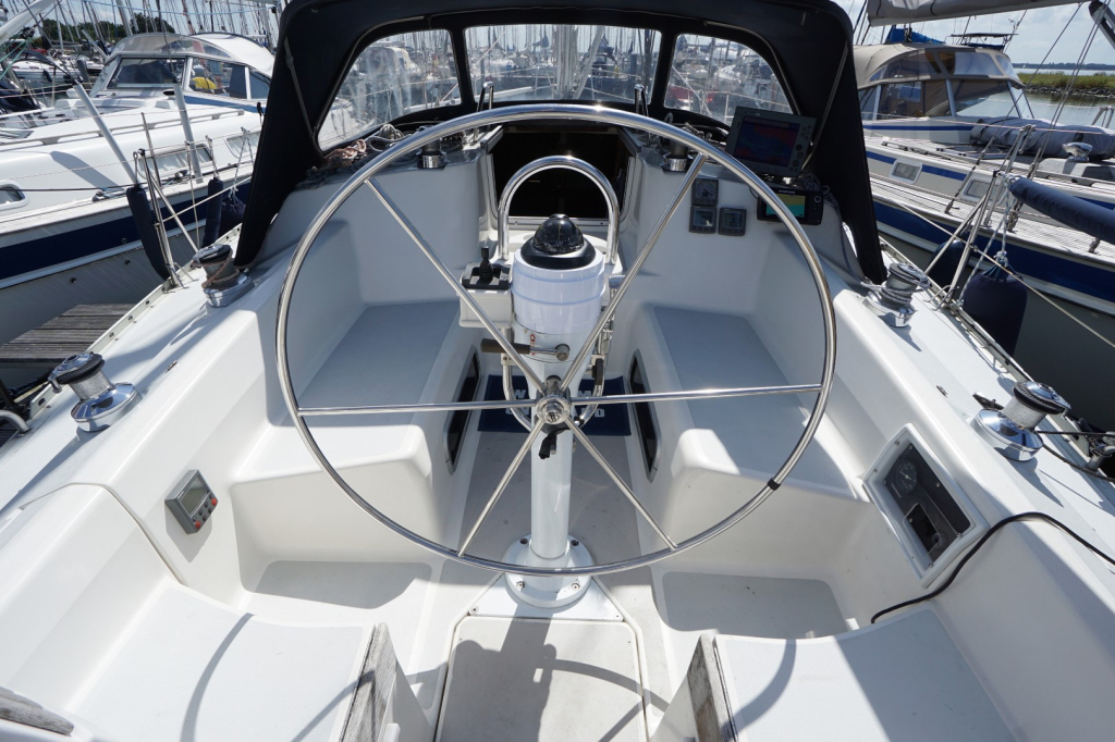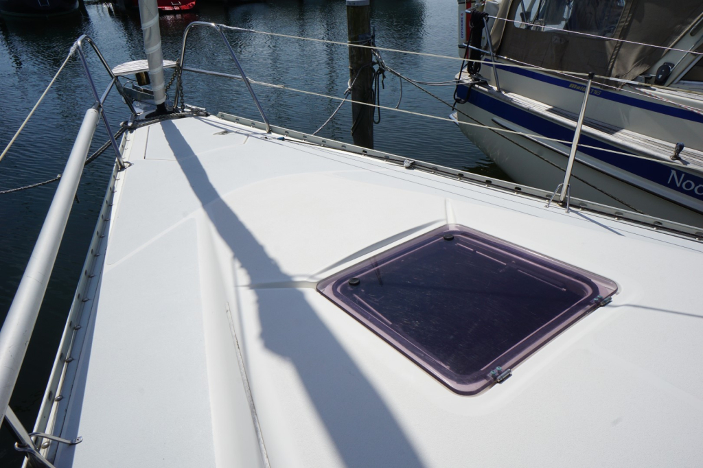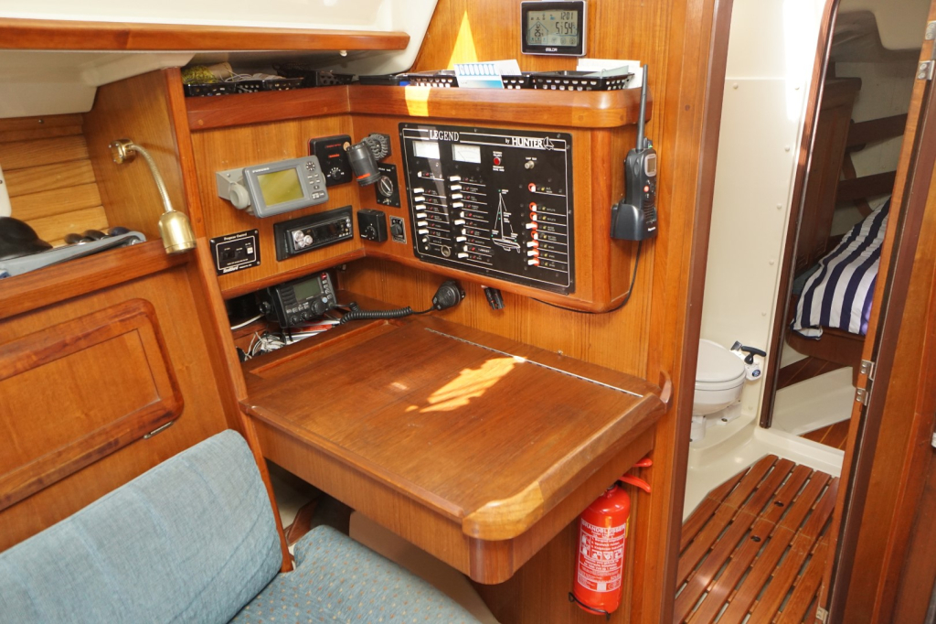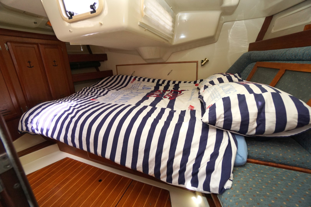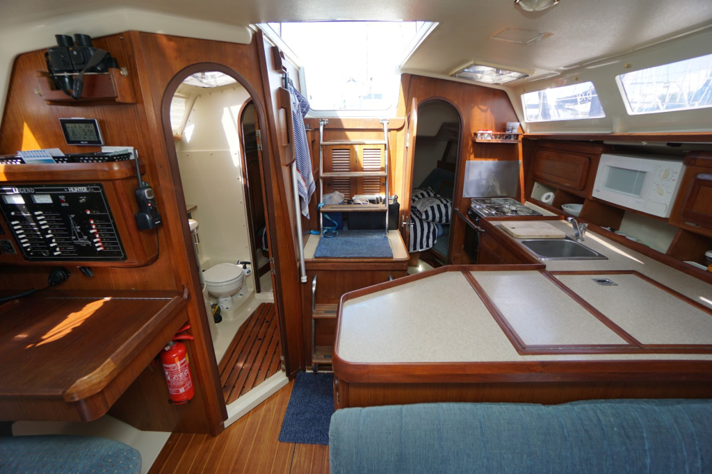 Under sail, this Hunter truly reveals its character. The rudder responds smoothly and directly, and thanks to the lead keel, the boat is pleasantly stable despite its limited draft of 1.50 meters. The rigging is easy to handle, even with a small crew. The Yanmar engine is reliable and well-maintained, and the bow thruster allows for worry-free maneuvering in harbors and locks.