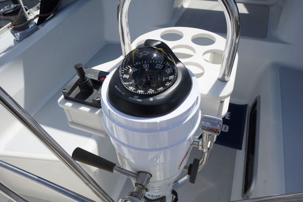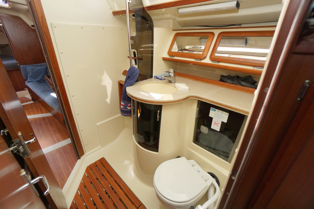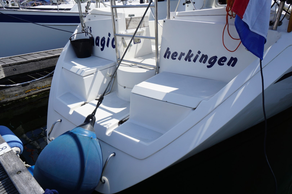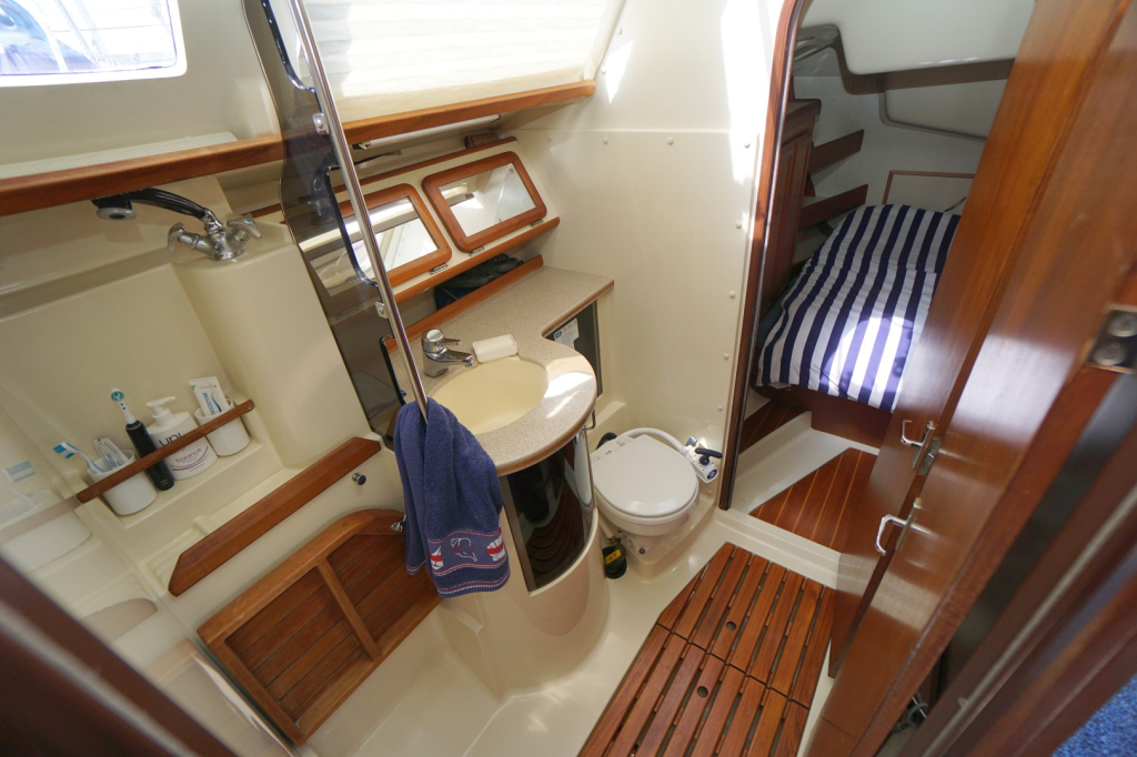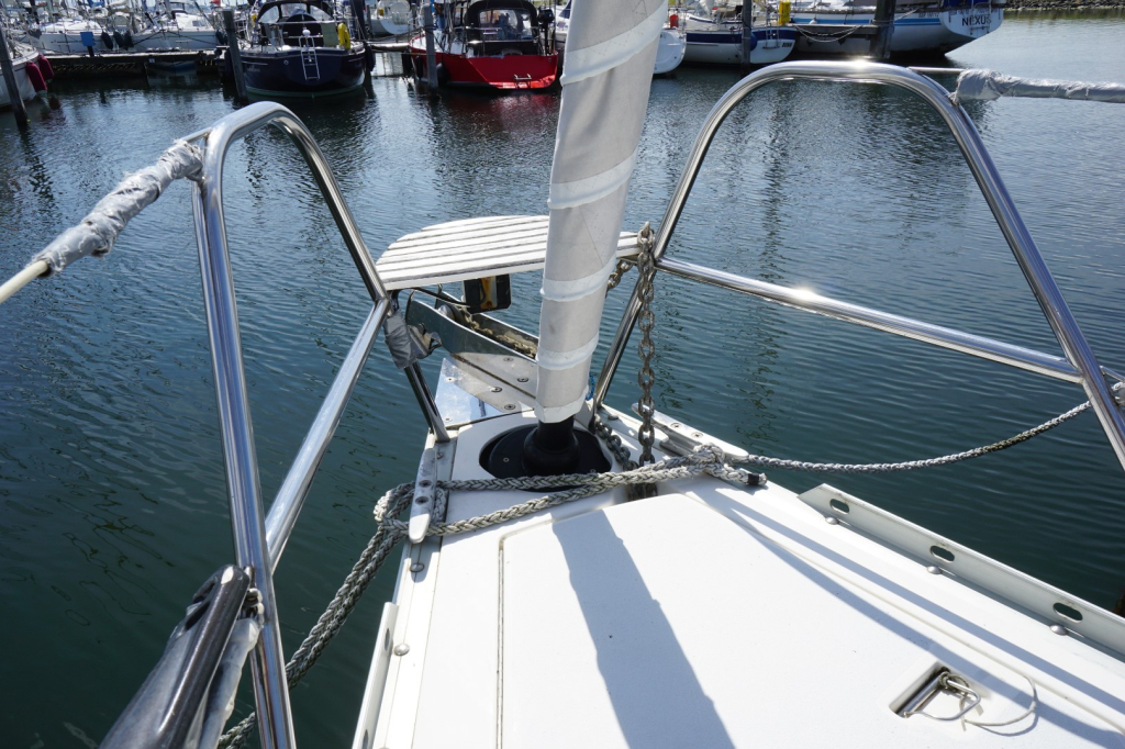 Under sail, this Hunter truly reveals its character. The rudder responds smoothly and directly, and thanks to the lead keel, the boat is pleasantly stable despite its limited draft of 1.50 meters. The rigging is easy to handle, even with a small crew. The Yanmar engine is reliable and well-maintained, and the bow thruster allows for worry-free maneuvering in harbors and locks.