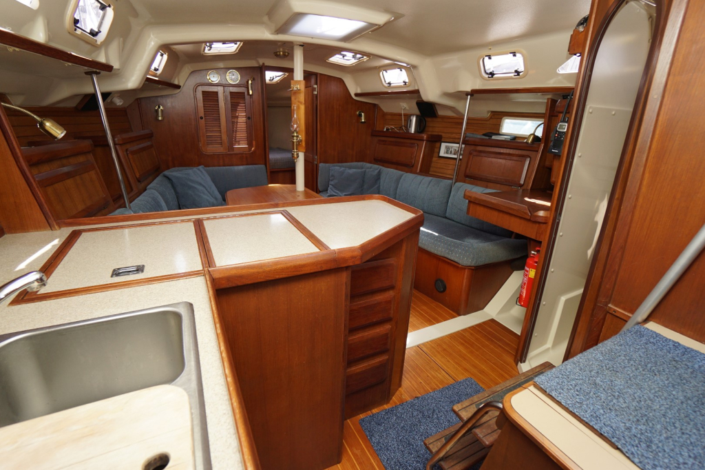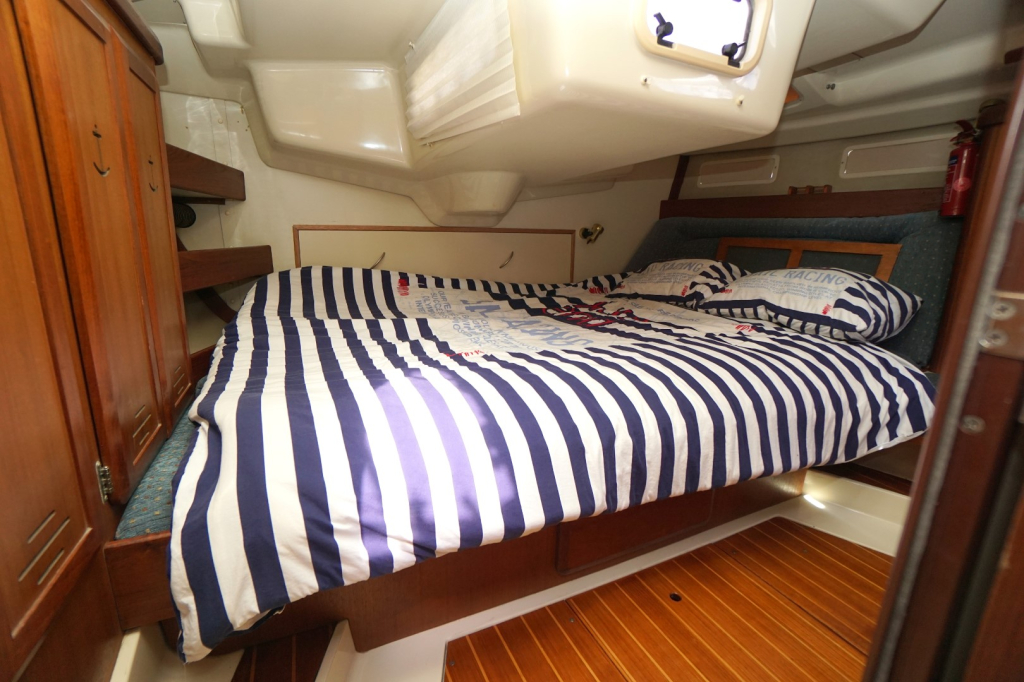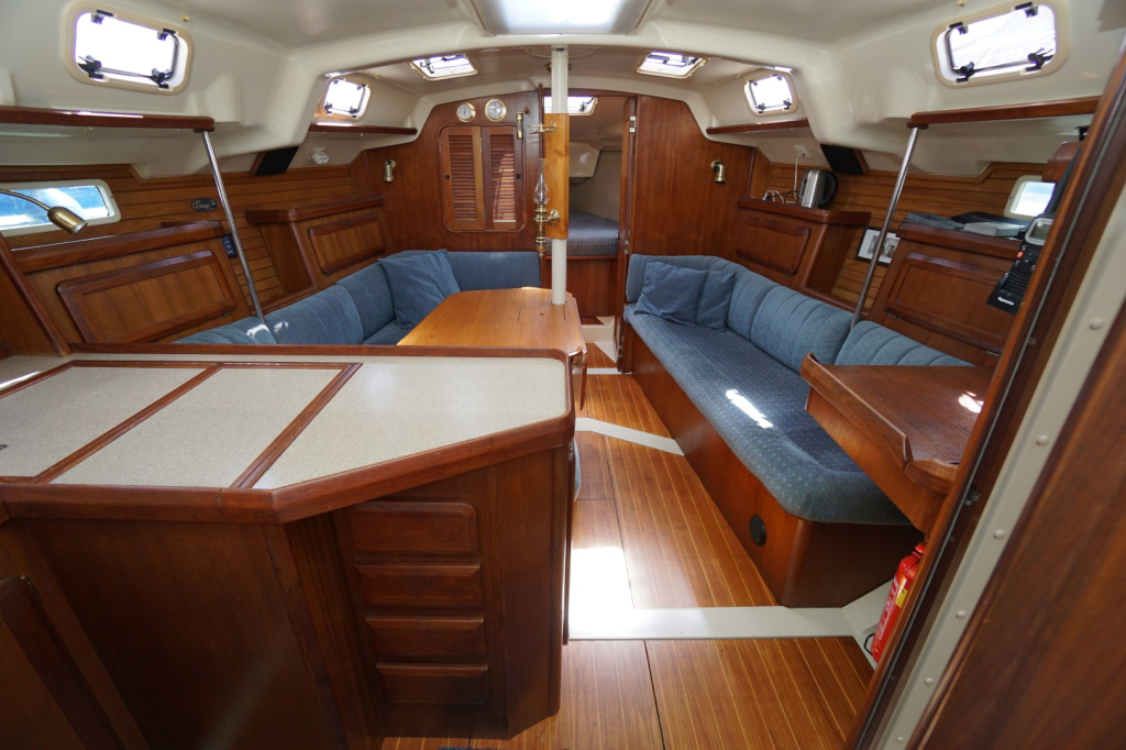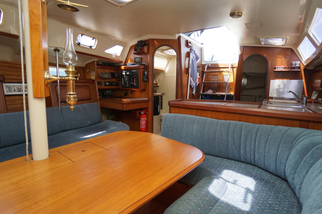 Inside, the 37.5 Legend offers a warm and nautical feel with a surprisingly spacious interior thanks to the generous windows and clever layout. The saloon is inviting, atmospheric, and beautifully finished, featuring a comfortable seating area and a large dining table that easily seats several guests. The galley is fully equipped with a gas stove, oven, sink, ample refrigeration, and ample storage space, allowing you to easily prepare delicious meals on board. The head includes a toilet, sink, and shower, with plenty of room to move around. Both the spacious aft cabin—featuring the striking detail of a generous double bed positioned across the width of the ship—and the forepeak offer comfortable sleeping accommodations for several passengers.