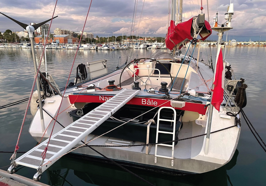 CONSTRUCTION: Built by Technimar St Malo in France in 2005. Aluminum construction, deck 3mm, bottom 10mm. 3M Deep fin keel with 3,5T lead bulb. Twin rudders. 2.2T water ballast on each side with electric pump filling, transfer by gravity, to obtain ideal 15 degree healing angle. Teak in cockpit. Stern platform housing for hard shell dinghy, giving direct access to water. Single wheel in stainless steel (covered in nylon cord).