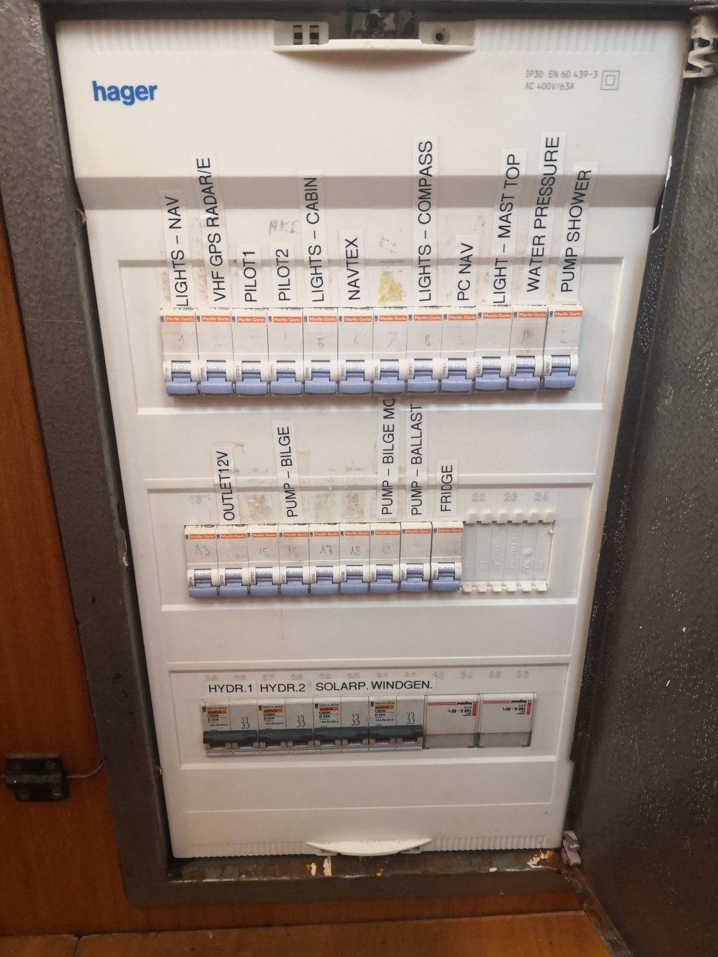 ELECTRICS: Batteries 4x Lithium 100Ah (total 400 Ah), bought new 2022, engine battery 80Ah, bought 2017, Battery charger/inverter Mastervolt 12/220V 1.500W. Shore power 220V including galvanic protection. Removable anodes and electrolysis protection for aluminum hull. 2 Solar panels and wind turbine for power generation.