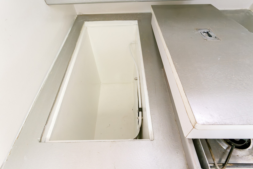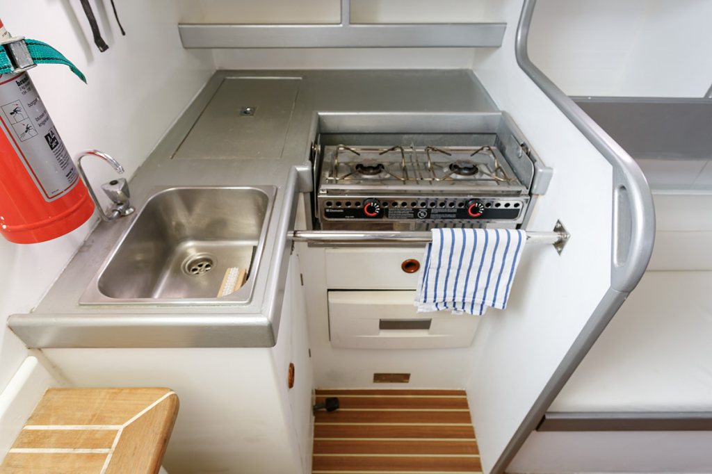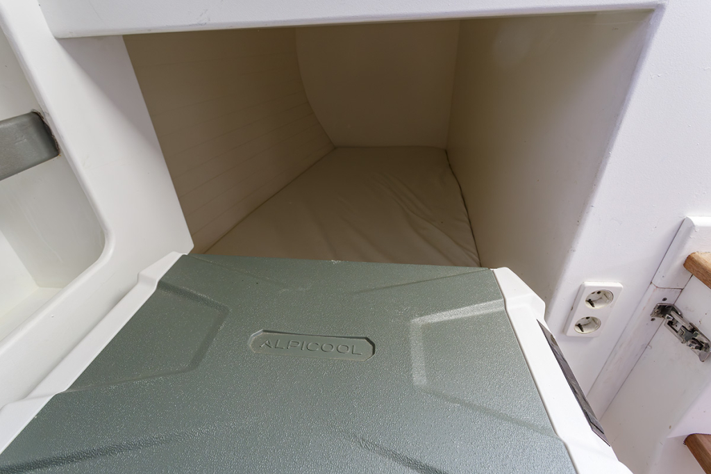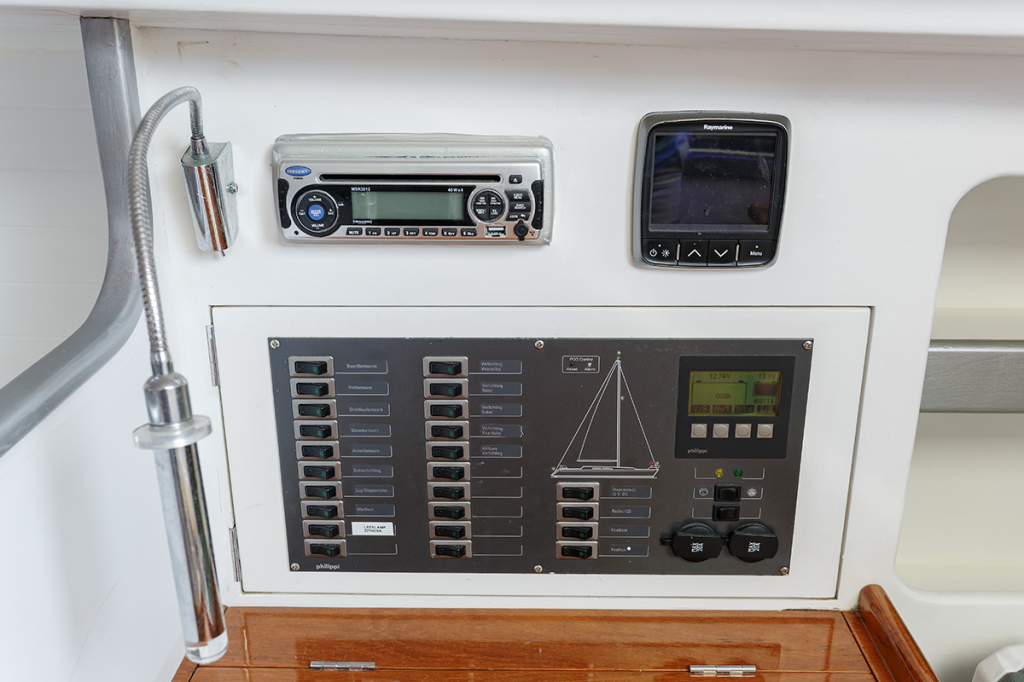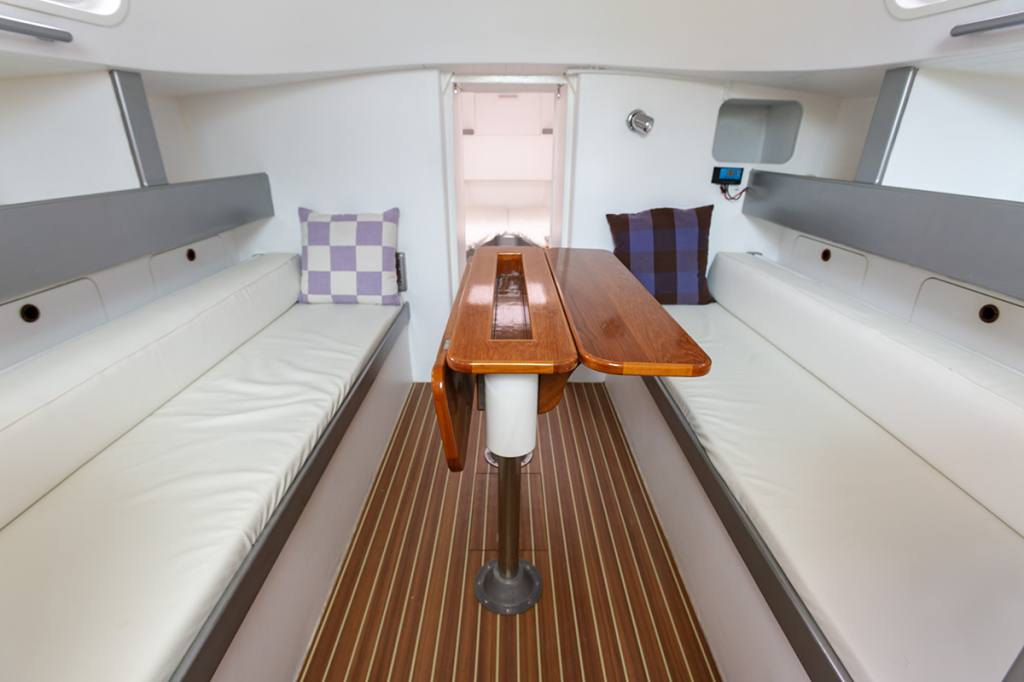 The interior features solid, no-nonsense carpentry and good upholstery. The light color scheme creates a cozy, nautical atmosphere in the saloon. Immediately to port upon entering is the galley with a two-burner stove and sink. To starboard is the navigation area. In the bow is a cabin with a double bed and ample storage space. To port is a head with an underwater toilet and holding tank.