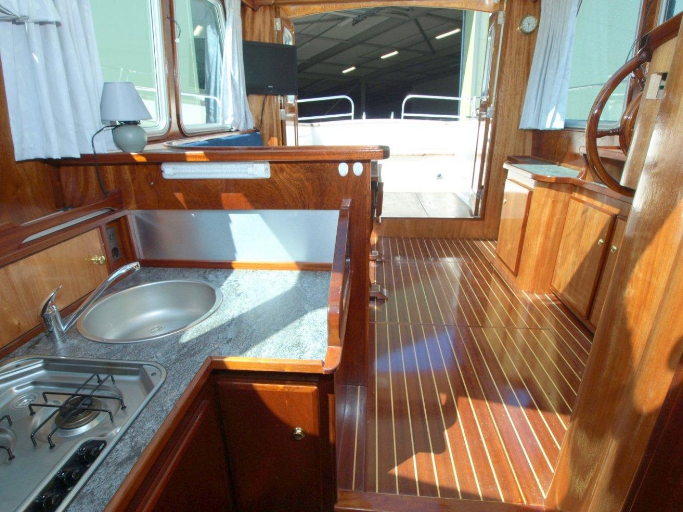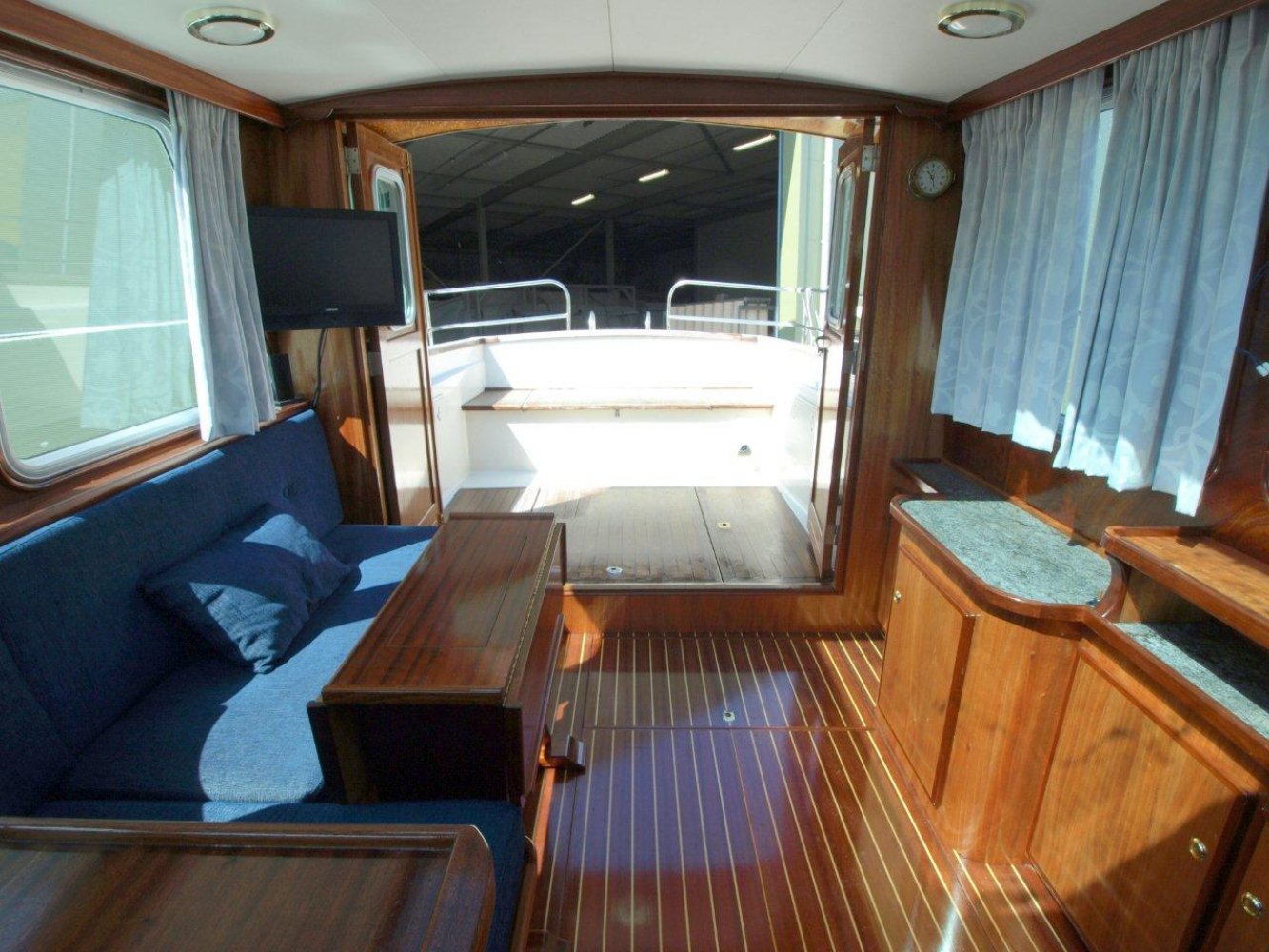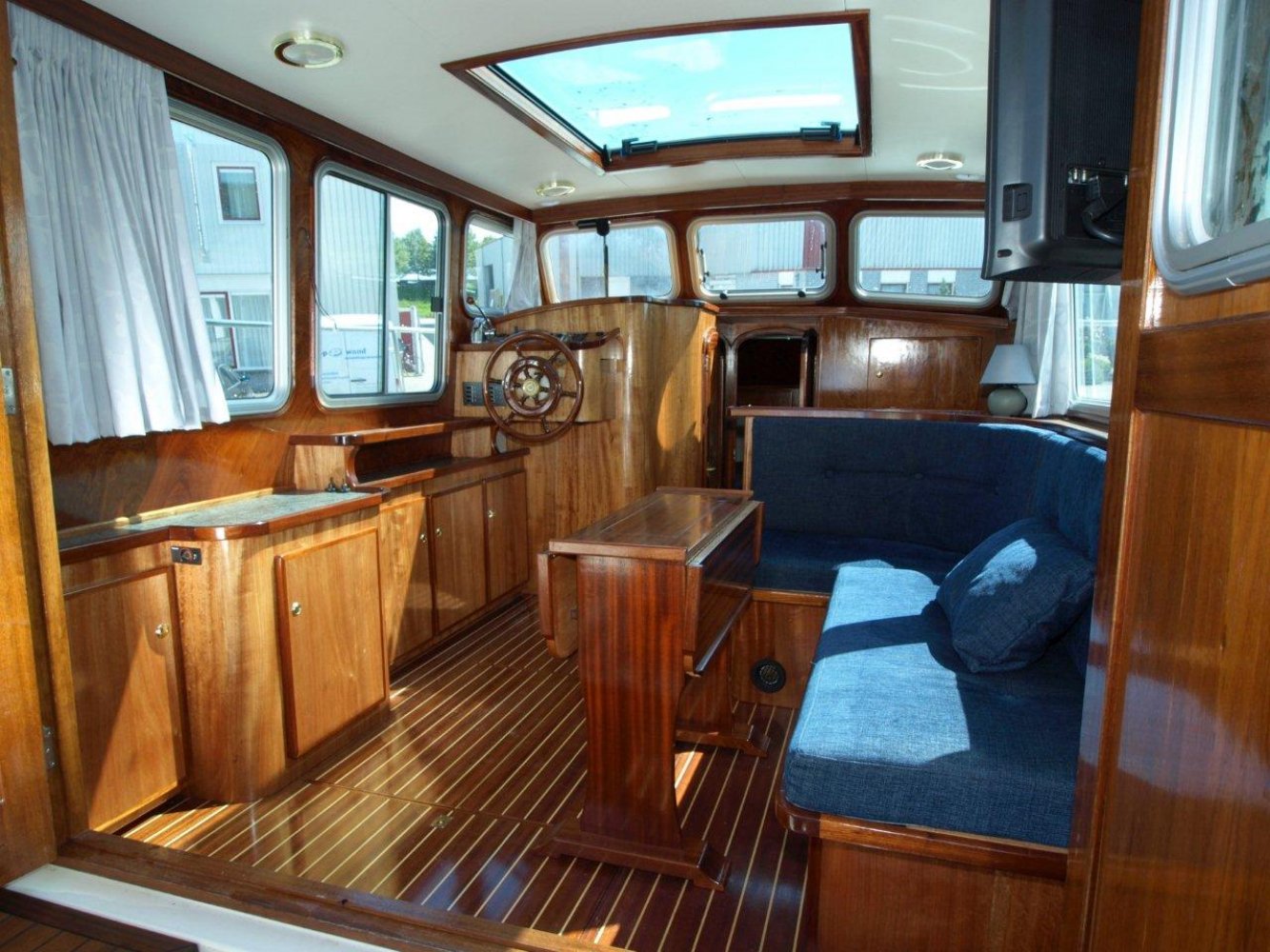 De Drammer 935 is een tijdloos schip met uitstekende vaareigenschappen. Het ontwerp en de indeling bieden de opvarenden veel comfort en bewegingsvrijheid. De ruime kuip is voorzien van de nodige bergluiken en een royale bank over de volle breedte van het schip. De gangboorden zijn goed begaanbaar, evenals het voordek. Varen met dit schip is door de krachtige Yanmar diesel in combinatie met de Vetus boegschroef erg eenvoudig. Gaat het toch verkeerd: de brede stootrand voorkomt schade. Het interieur is luxe afgewerkt in mahonie. Er zijn diverse kasten door het hele schip. Vanaf de binnenstuurstand heeft de schipper prima uitzicht rondom. Een enorm glazen dakraam zorgt voor extra licht en ventilatie. In het midden is een ruime natte cel met douchegelegenheid. Hier tegenover is de keuken geplaatst welke ook de nodige ruimte en veel licht biedt. In het voorschip is de slaaphut geplaatst met een ruim 2-persoons bed in V-vorm. Dit schip is in mooie staat, voorzien van verwarming, boegschroef, boiler, teak op de kuipvloer, zwemplatform, etc. en klaar om weg te varen. De ligplaats is binnen in een loods, waar wij alleen op afspraak terecht kunnen. Wilt u een keer komen kijken, dan horen wij dat graag.