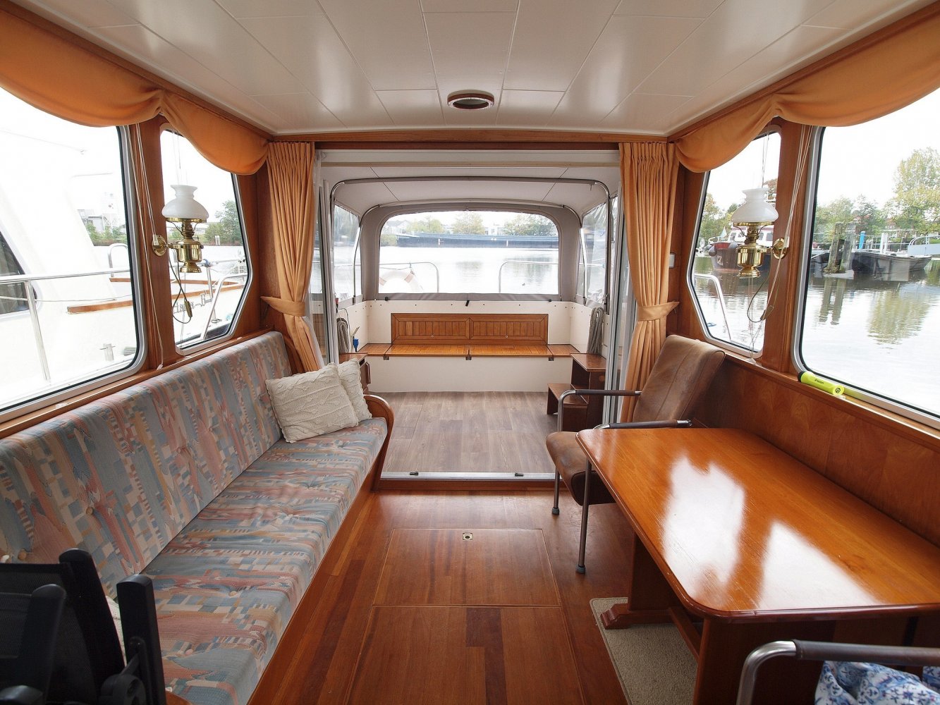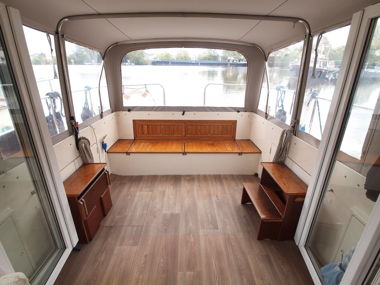Het schip is degelijk gebouwd en heeft een stoere lijn. De gangboorden zijn relatief breed en voorzien van een stevige reling. Interessant natuurlijk is de open kuip. Hier kunt u lekker van de buitenlucht genieten en als het weer wat tegen zit, er is een nieuwe buiskap geplaatst in 2014. De kuip loopt gelijkvloers over in de ruime salon. Aan stuurboord is een comfortabele bank welke eenvoudig om te toveren is naar een twee persoonsbed. Aan bakboord is over de gehele lengte van de salon de nodige bergruimte gecreerd. Een stukje naar voren is de stuurstand. Vanaf hier heeft u een goed overzicht op de omgeving en hier is uitraard ook de bediening van de mooi Sole welke in 2014 nieuw is geplaatst.
