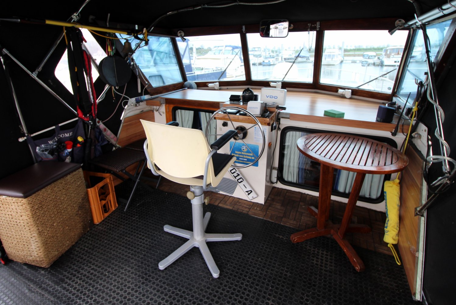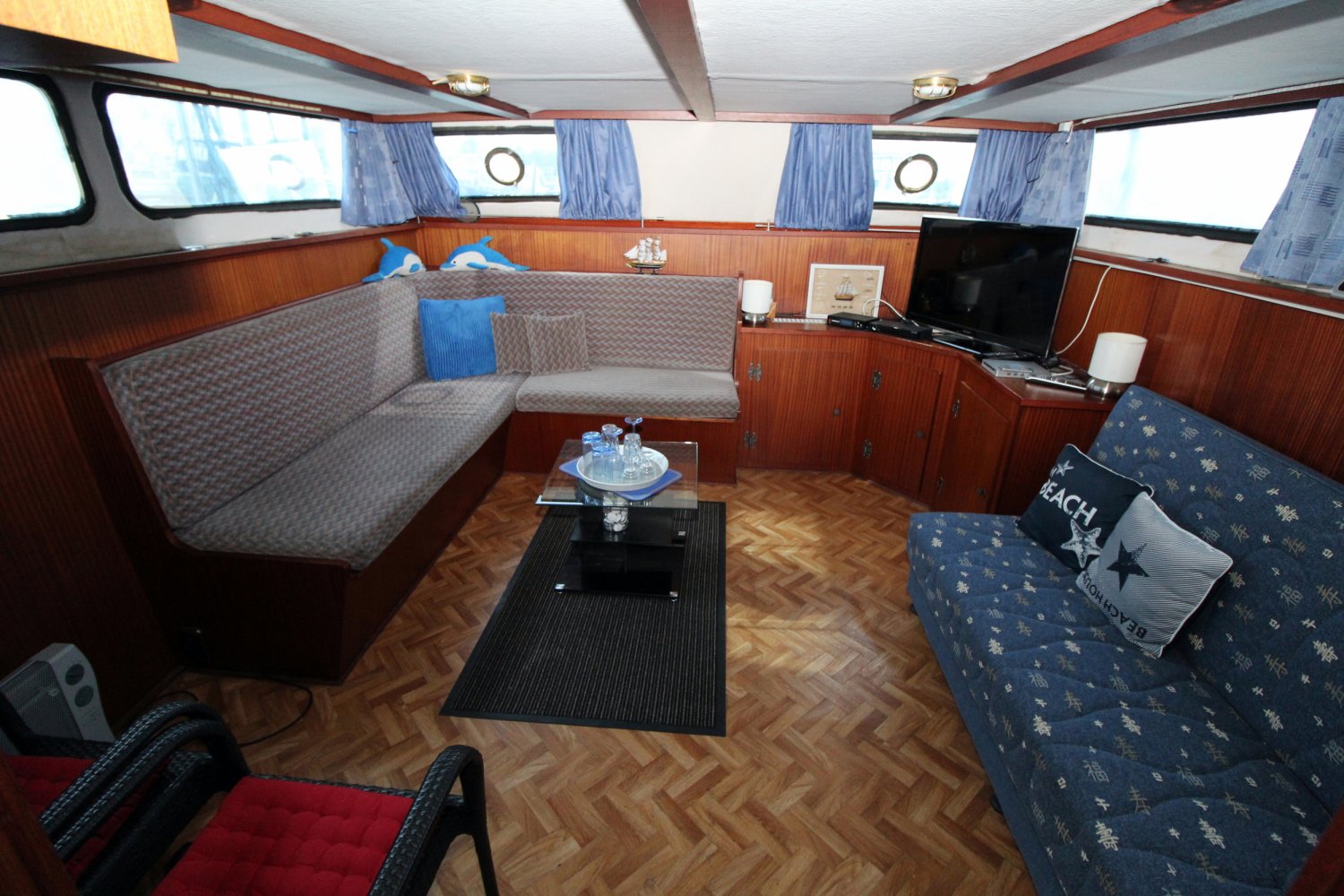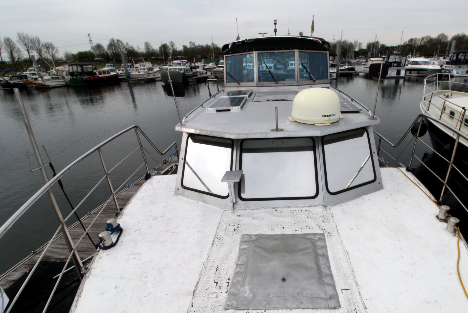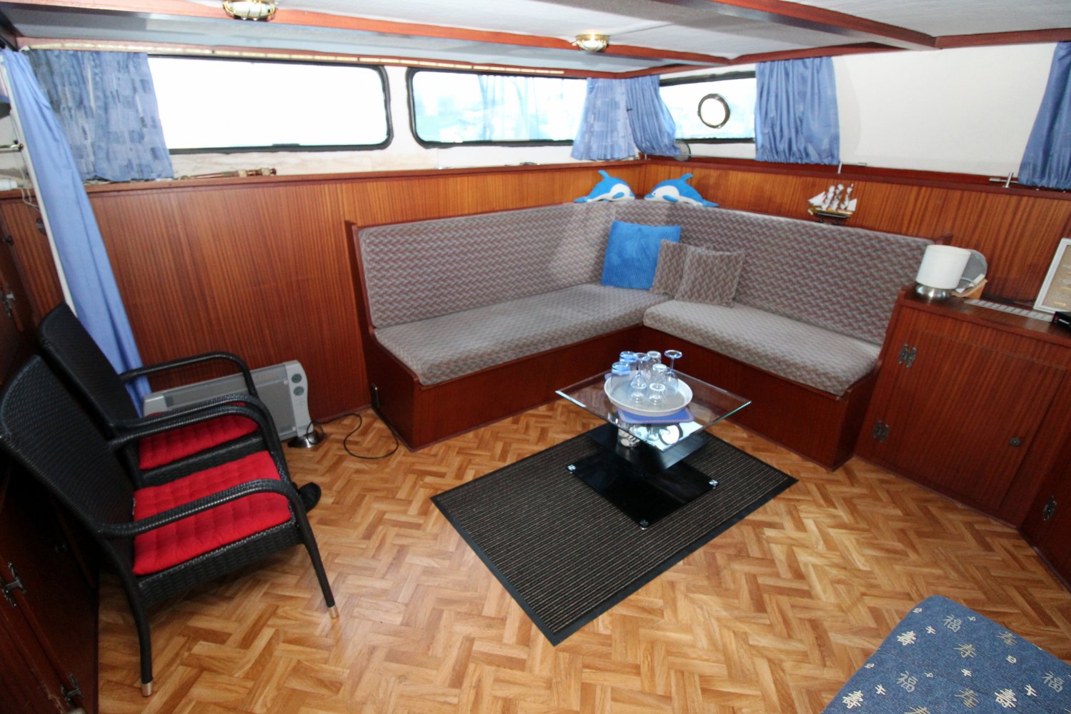 Deze ruime Woodfield Bakdekkruiser 13.50 AK is momenteel sterk in prijs verlaagd, de eigenaar wil graag snel verkopen! Het is een bijzondere boot met zeer veel extra's en is zeer ruim. De boot is vaarklaar maar behoeft onderhoud, voornamelijk schilderwerk. Het schip laat zich makkelijk manouvreren middels de boegschroef en hekschroef, en u kunt heerlijk binnen en buiten varen. In de achtercabine bevindt zich een enorme woonkamer en in de salon de stuurstand, keuken en een zitje. Verder naar voren bevinden zich de aparte douche en toilet en in de punt twee vaste éénpersoons bedden. Het is tevens een ideaal schip om op te wonen met 2 personen.