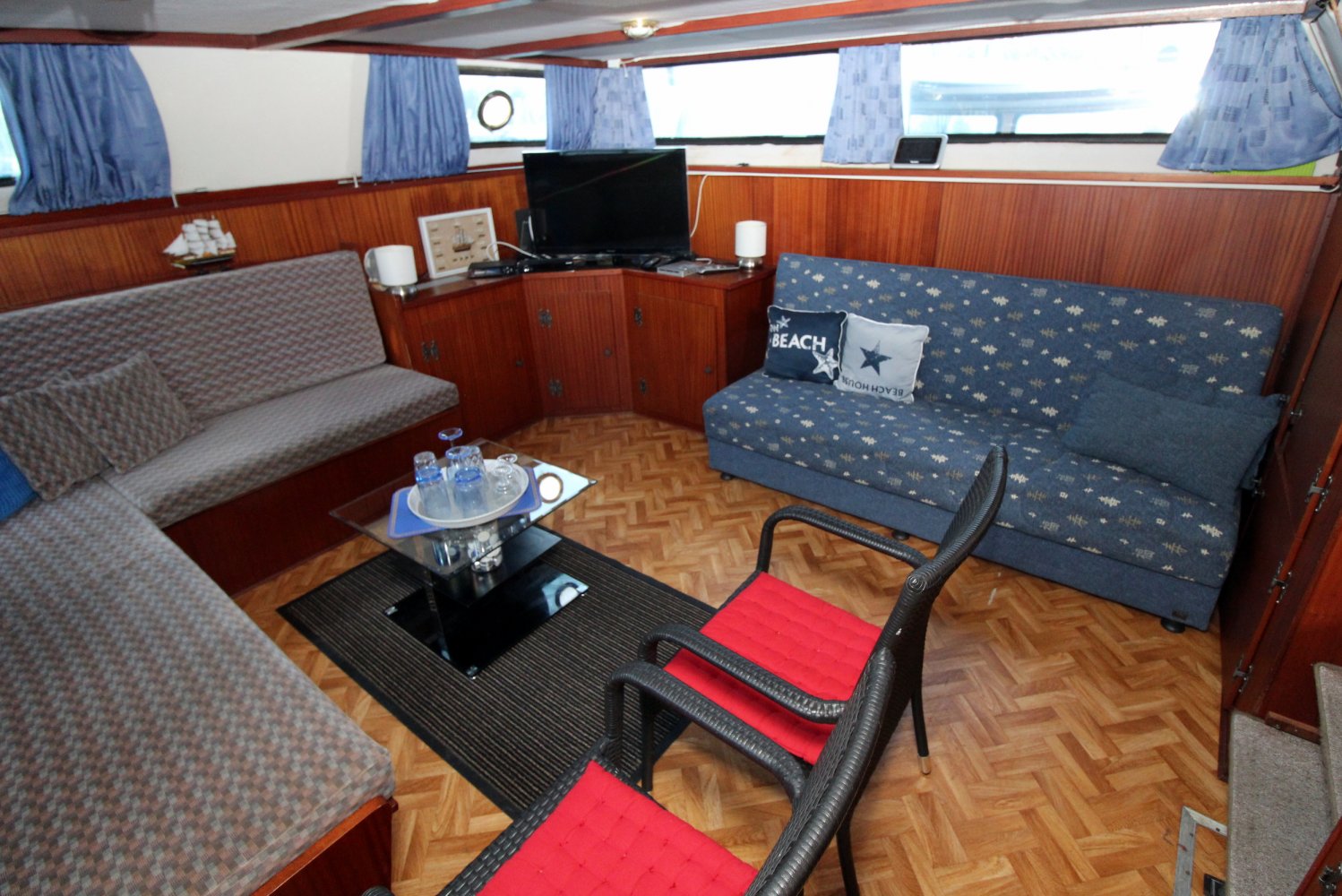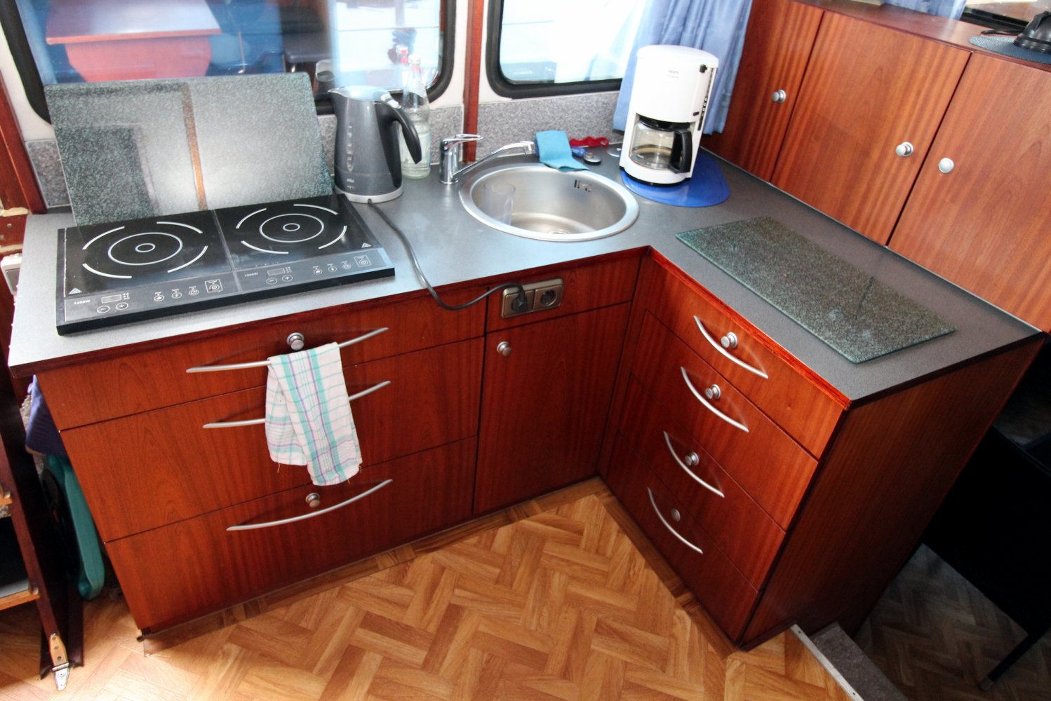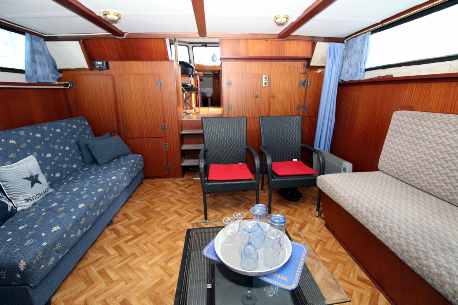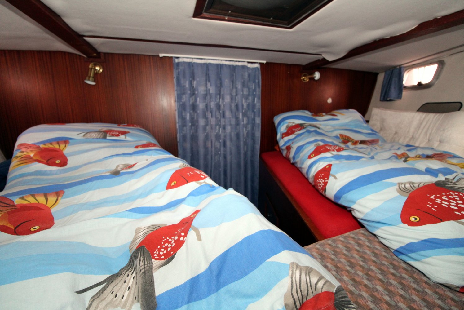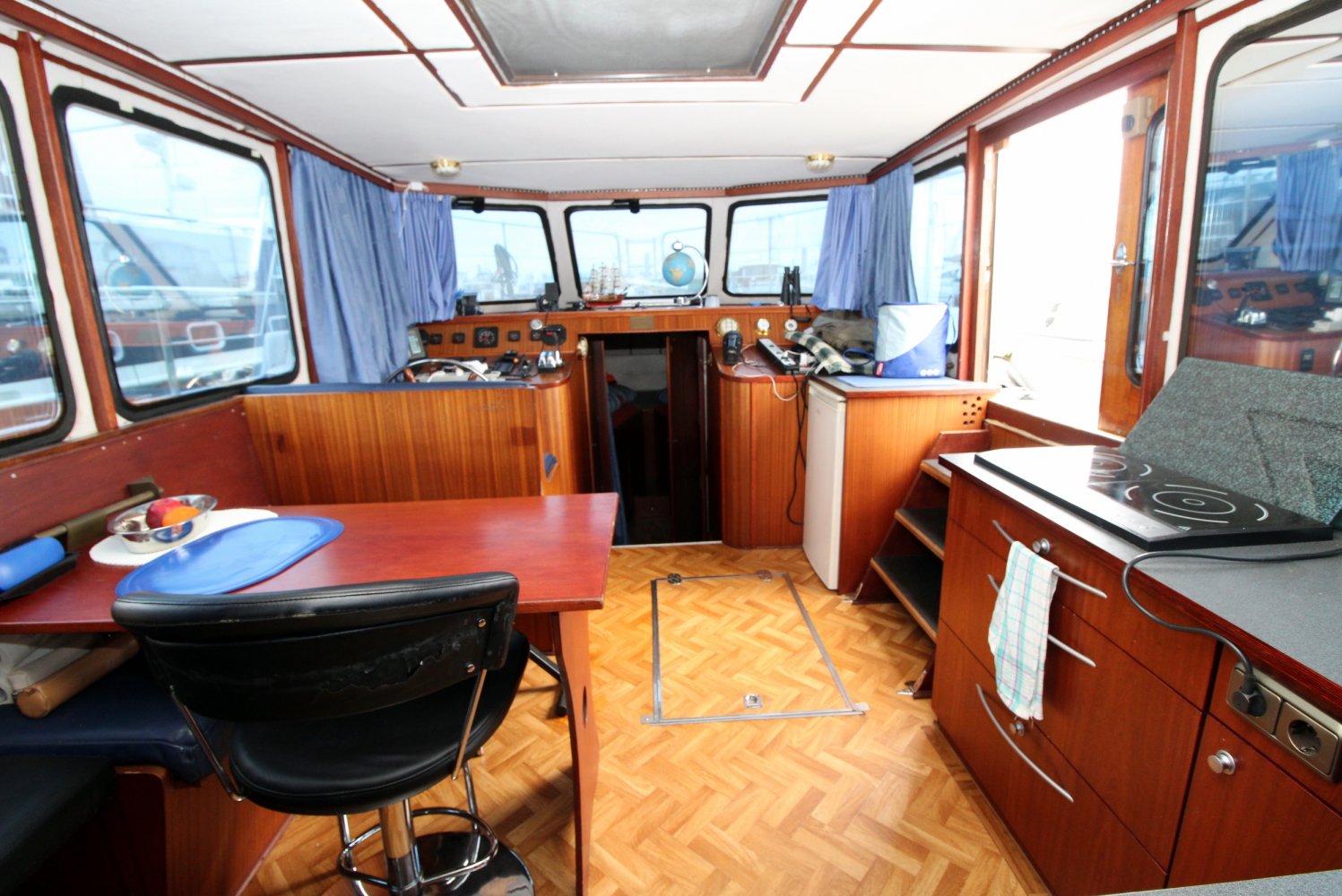Deze ruime Woodfield Bakdekkruiser 13.50 AK is momenteel sterk in prijs verlaagd, de eigenaar wil graag snel verkopen! Het is een bijzondere boot met zeer veel extra's en is zeer ruim. De boot is vaarklaar maar behoeft onderhoud, voornamelijk schilderwerk. Het schip laat zich makkelijk manouvreren middels de boegschroef en hekschroef, en u kunt heerlijk binnen en buiten varen. In de achtercabine bevindt zich een enorme woonkamer en in de salon de stuurstand, keuken en een zitje. Verder naar voren bevinden zich de aparte douche en toilet en in de punt twee vaste éénpersoons bedden. Het is tevens een ideaal schip om op te wonen met 2 personen.