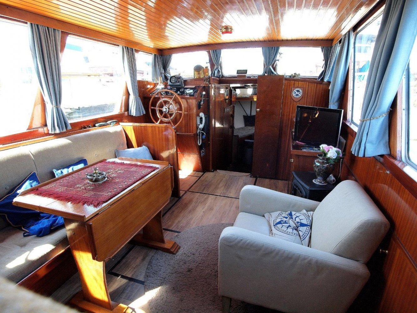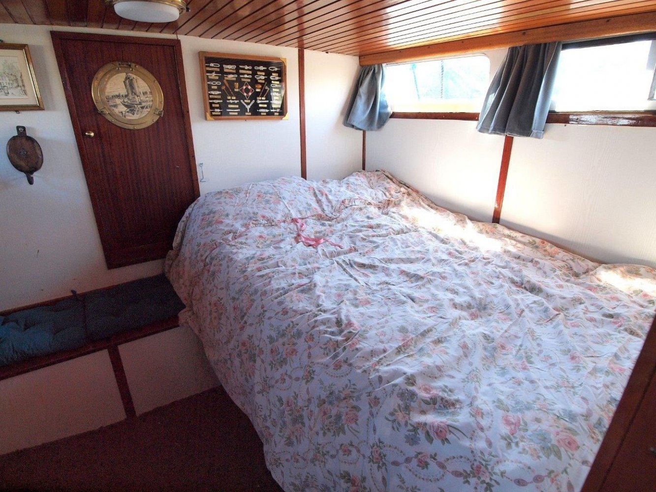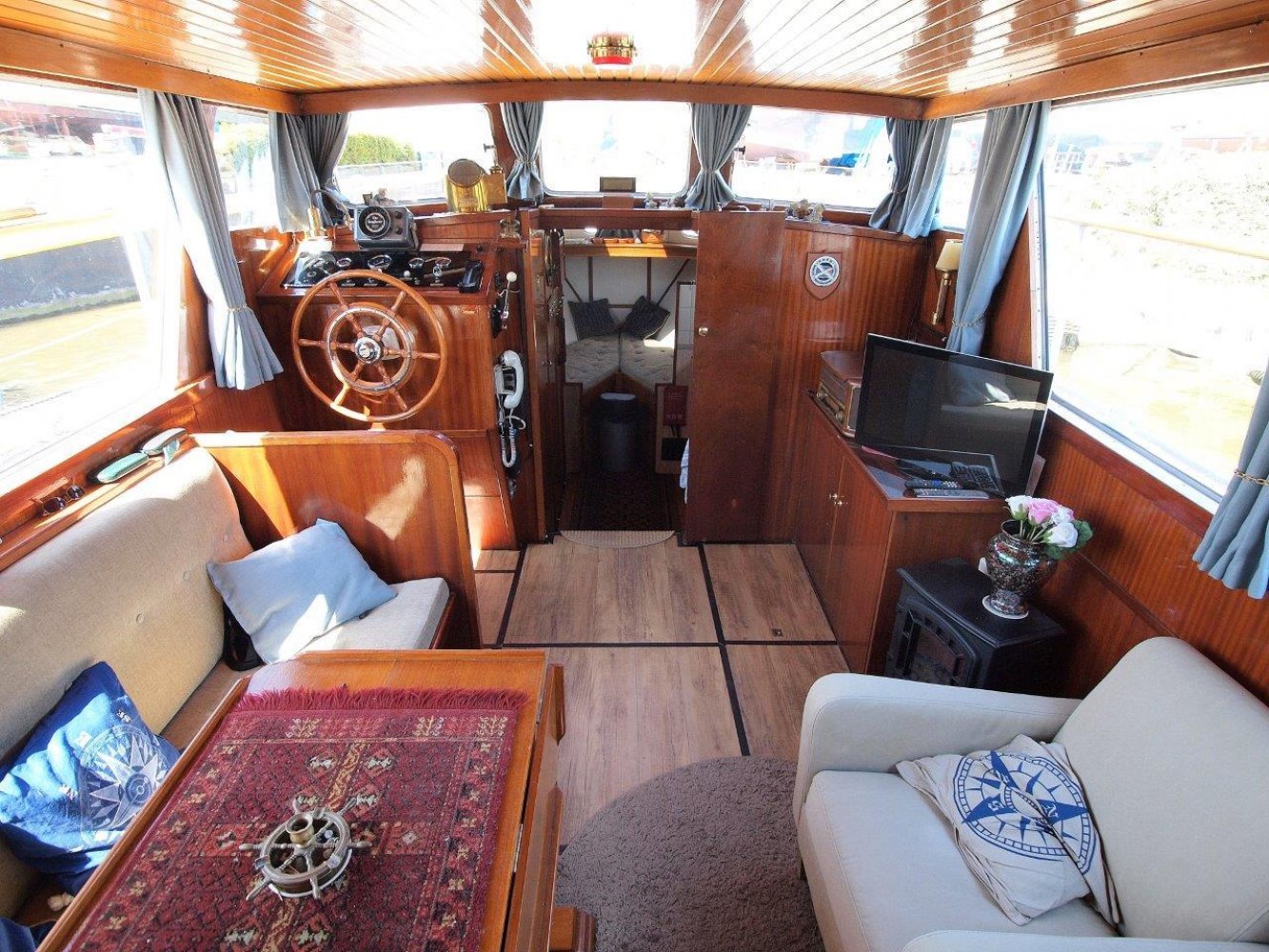 Binnen in het schip wordt u ontvangen in een warm en klassiek interieur. In het achterschip is de eigenaarshut met twee persoonsbed en veel kasrtruimte. Midscheeps is de gezellige salon met lekker veel binnenvallend licht. Overigens treft u hier ook de binnenstuurstand aan voor als het weer echt slechts en en u comfortable bij de verwarming wilt zitten. In het voorschip treft u het kombuis aan met daar tegenover de natte cel voorzien van een douche. In de open voorpiek is een tweepersoonsbed voor eventuele gasten.