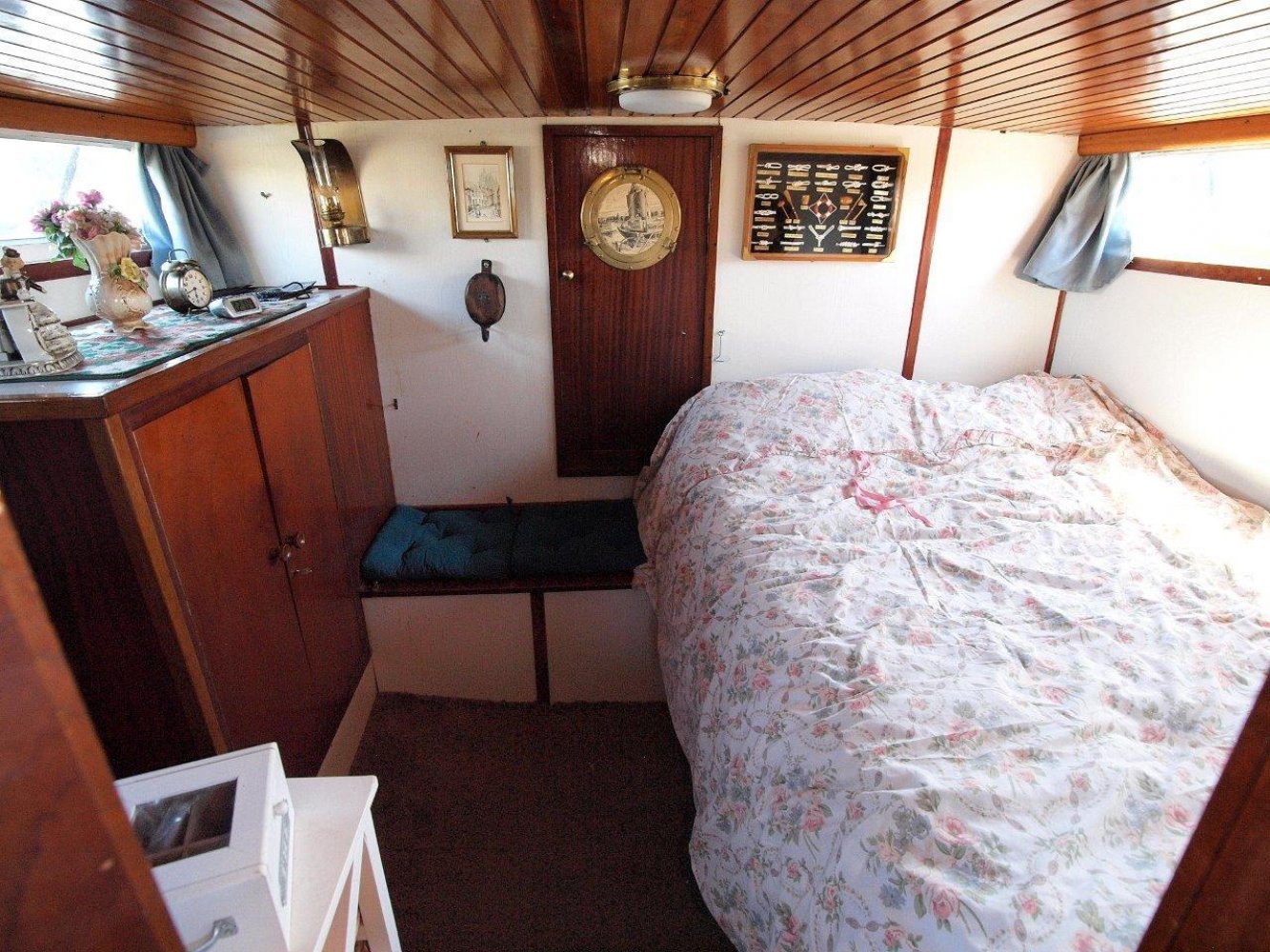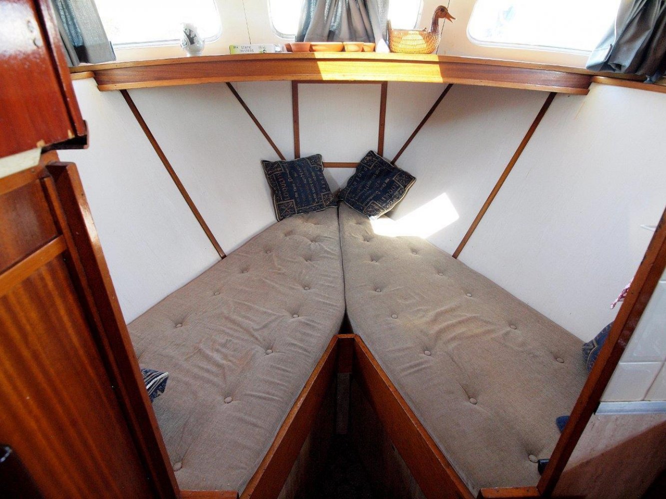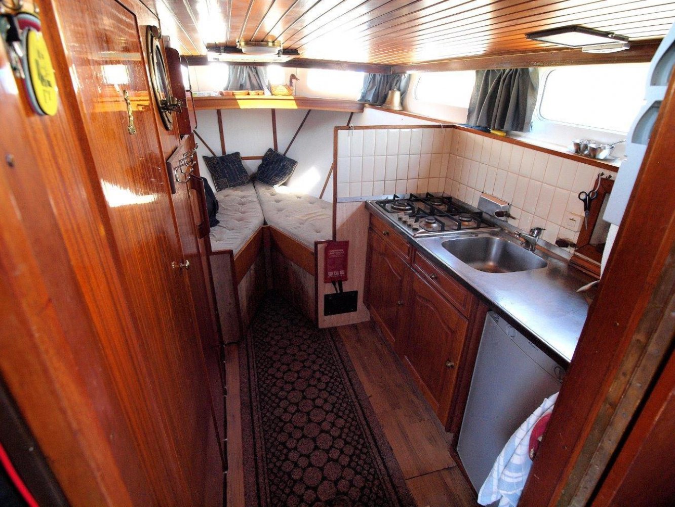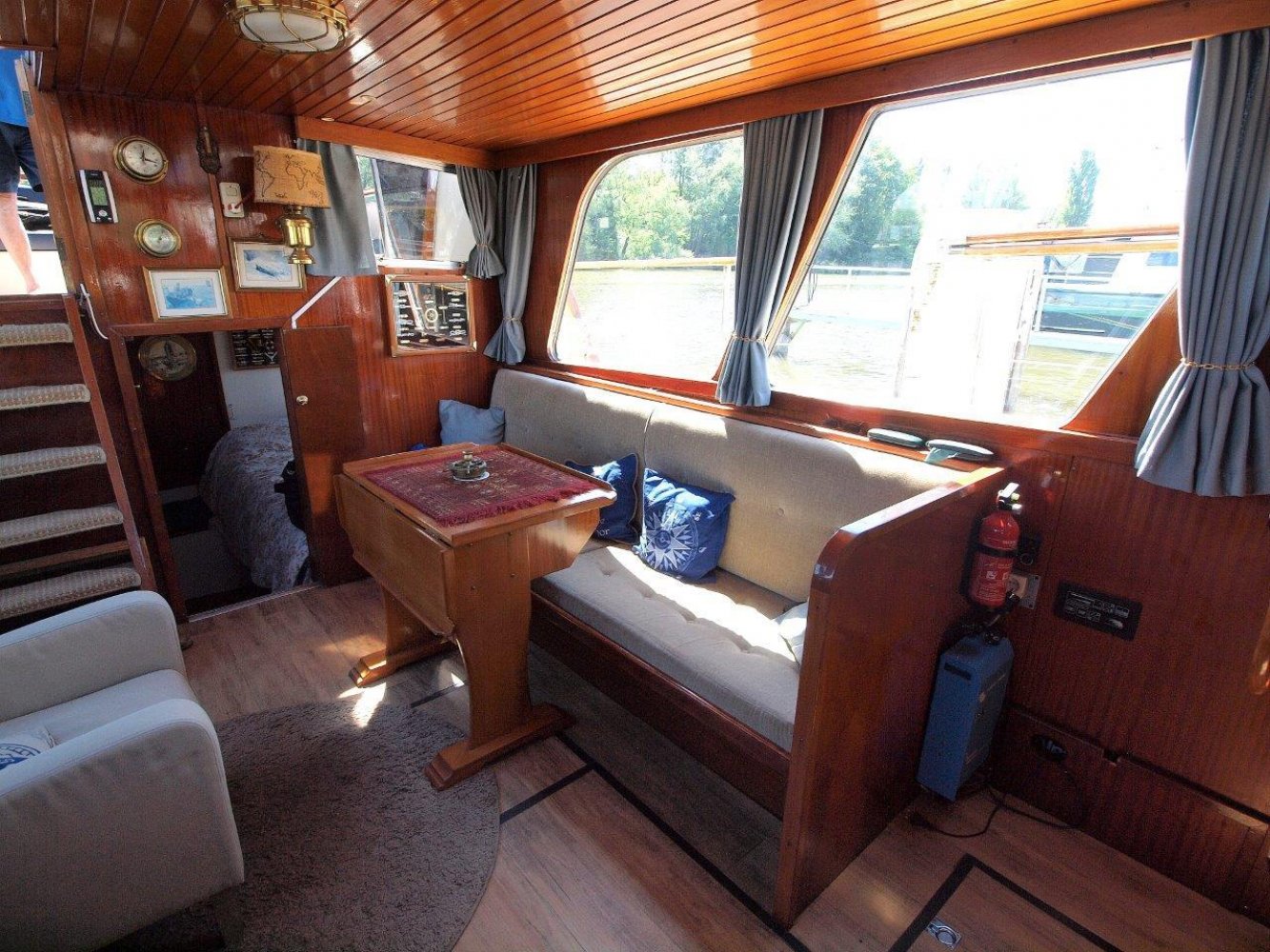 Binnen in het schip wordt u ontvangen in een warm en klassiek interieur. In het achterschip is de eigenaarshut met twee persoonsbed en veel kasrtruimte. Midscheeps is de gezellige salon met lekker veel binnenvallend licht. Overigens treft u hier ook de binnenstuurstand aan voor als het weer echt slechts en en u comfortable bij de verwarming wilt zitten. In het voorschip treft u het kombuis aan met daar tegenover de natte cel voorzien van een douche. In de open voorpiek is een tweepersoonsbed voor eventuele gasten.
