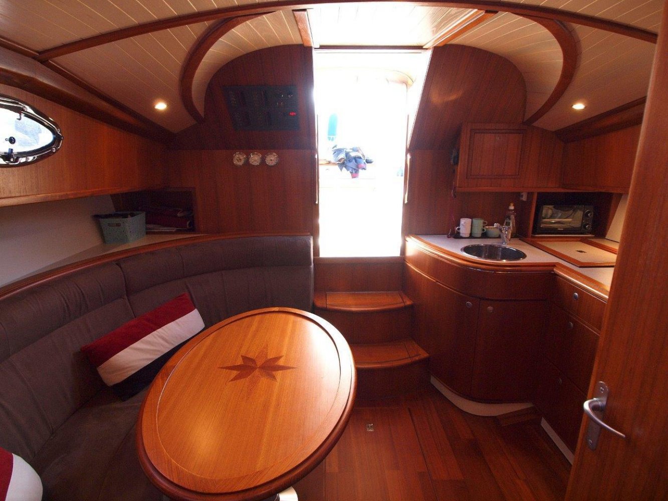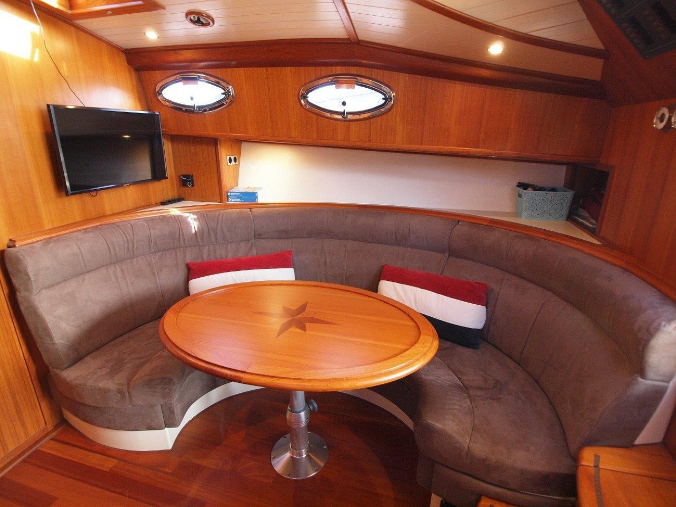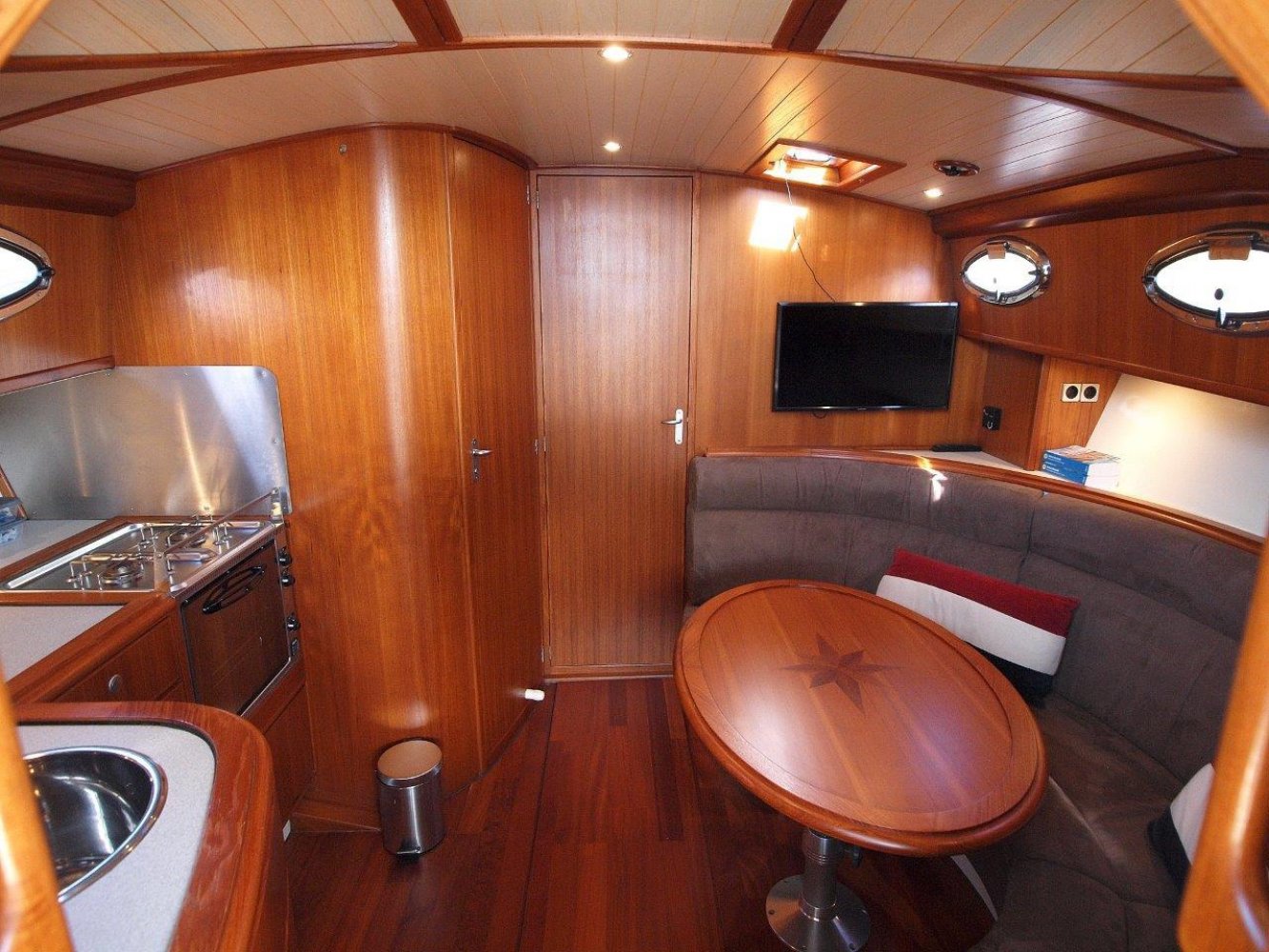 De kuip is ruim en comfortabel. Er is een hoekbank met tafel in het midden waar u lekker kunt ontspannen. Op minder fraaie dagen wordt u beschermd door de in 2017 nieuw geplaatste kuiptent. Verder naar voren in de kuip treft u aan bakboord de besturing aan. Hier is de nodige navigatie apparatuur en meters voor de boordsystemen. En uiteraard de elektrische motor bediening van de zacht en soepel lopende Volvo Penta 6 cilinder diesel motor en hier treft u ook de aansturing van de boeg en hekschroef aan. Verder naar voren in het schip vindt u door de strak hoogglans gelakte toegangsdeur de salon. Deze is opvallend ruim voor het type schip en ook hier is het comfortabel toeven. Aan bakboord een compact maar goed uitgerust kombuis en daar tegenover een mooie rondzit met een tafel in het midden. Welke overigens omgetoverd kan worden tot een extra 2-persoons bed. Uiteraard mag een natte cel niet ontbreken met zelfs een douche gelegenheid. In de voorpiek is de eigenaarshut met Frans bed en de nodige kastruimte. Het is verbazend hoe de werf zoveel ruimte en comfort heeft kunnen creeren en toch de klassieke lijnen van het schip weten te waarborgen. Kortom, deze Intercruiser 34 is perfect onderhouden en compleet uitgerust. Maar bovenal is het een erg fraai schip zonder het comfort uit het oog te verliezen. Een unieke combinatie! Geïnteresseerd? Neem dan zeker contact op om een afspraak te maken voor een bezichtiging. Uw makelaar is White Whale Willemstad en te bereiken onder nummer 0186-820208 of email: [email protected]