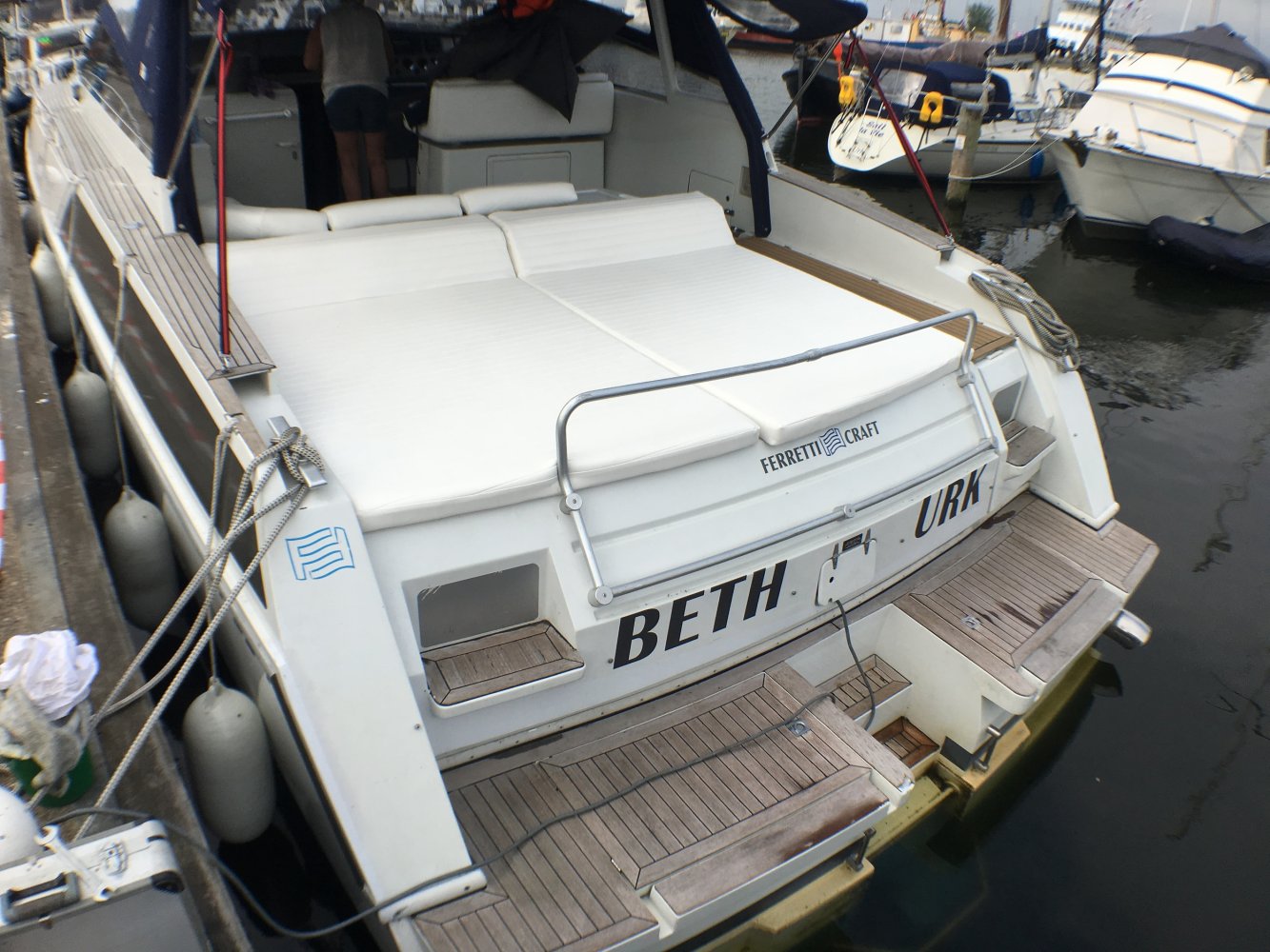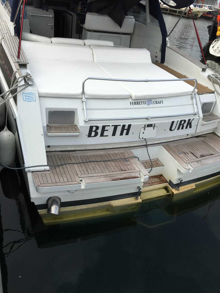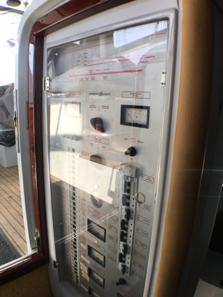 Ferretti is een Italiaans multinationaal scheepsbouwbedrijf met hoofdkantoor in Forlì dat is gespecialiseerd in het ontwerpen, bouwen en verkopen van luxe motorjachten.In de tijd dat deze racer werdt gebouwd won het Ferretti-team het Europees Offshore Kampioenschap.Dit model heeft een tijdloze tekening en blijft een zeer opvallende boot in elke haven. We adverteren natuurlijk met de 2 nieuwe Yanmar 438 pk motoren. Let op 150 vaaruur. Vlak voor de aankoop via een boten veiling is de vorige eigenaar overleden. Er zijn voor meer dan € 200.000 facturen aanwezig vanaf 2016. Werkelijk alle techniek is vervangen vernieuwd en verbeterd. De motoren worden met  elektronische gashendels aangestuurd. Ook zijn er nieuwe keerkoppelingen gebouwd die het schip extra langzaam kan laten varen. Handig met af en aanmeren maar ook fijn als je gewoon langzaam wilt varen in smal water. De hoofdschakelaars van het elektra systeem zijn op het dashboard aan en uit te zetten.