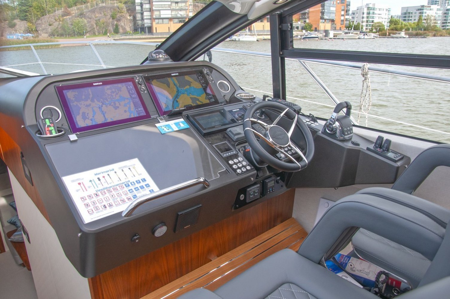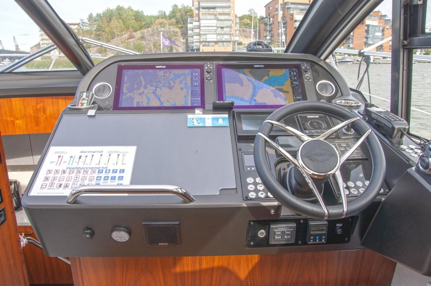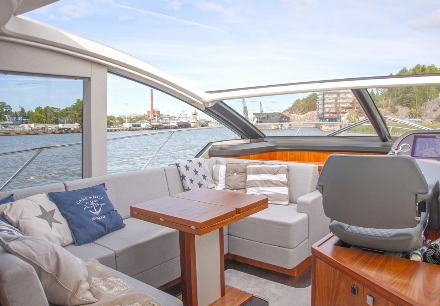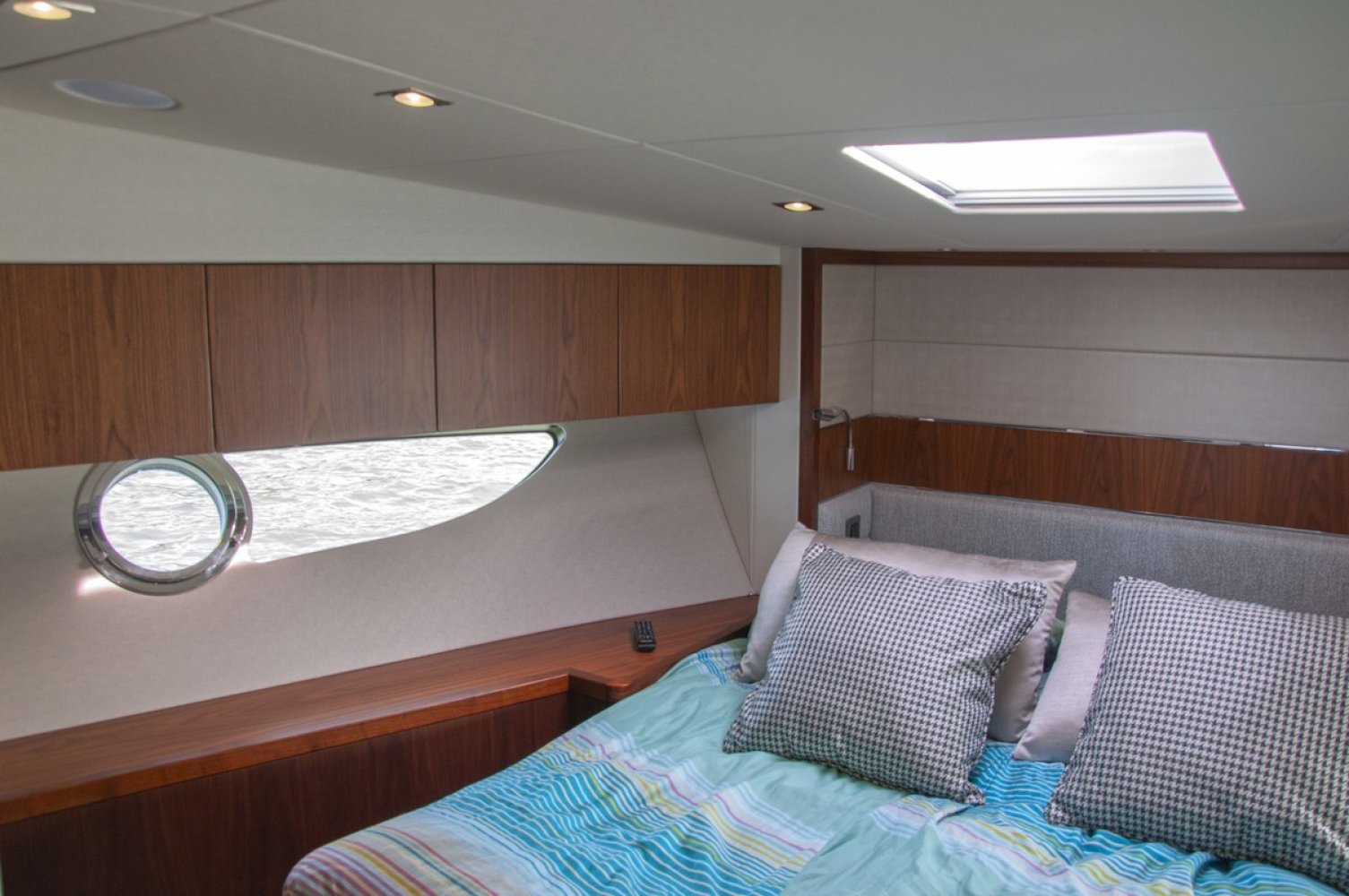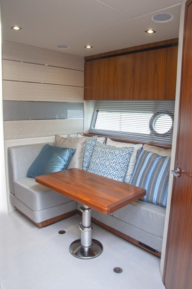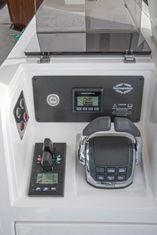 Air conditioning throughout the yacht, several units Eberspächer diesel heating throughout the yacht, several units, including defroster and cockpit outlet Deck Saloon Samsung 40" Television on a fall and rise system with a Samsung Blu-ray player. CD/Radio Fusion MS-AV750 with Fusion MS-NRX300 zone remote on console and infrared remote eye and Speaker craft stereo speakers. Electric cooling unit for top loading cool box Coolmatic TBSC-100 chiller in deck saloon Two Simrad NSS16 evo3 colour 16" Multifunction touch screen Chart Plotter displays with Simrad GS25 GPS. Simrad IS42 Speed/Depth Instrument with DST800 depth/speed/temperature transducer and the Xsonic Bronze Hdi performance depth fishfinder transducer. Autopilot system with Simrad QS80 pilot controller, display via IS42. Simrad Halo 4 Pulse Compression Radar 64nm 4 foot open array radar scanner. Simrad RS90 VHF Radio with DSC function. Simrad NAIS400 Class B Transponder. Searchlight - Sanshin Twin Beam HR-1012-24v Volvo Penta single 7" Colour display for shaft engines Volvo Penta Shaft Low speed option - Integrated to control head to give smoth control from low speed to full speed Volvo Penta Trip control, Cruise control and Single lever control. (Software update via Vodia) Compass Swinging and adjustment with correction card Proportional Bow and stern thruster Joystick control with hold function PJC212 Camera monitoring and docking system - Platform view infrared dome camera and two engine view infrared room cameras. Linked with multi switch to Navigation displays. CCTV switch on console. Generator Onan 11kw 50Hz - 11MDKBN