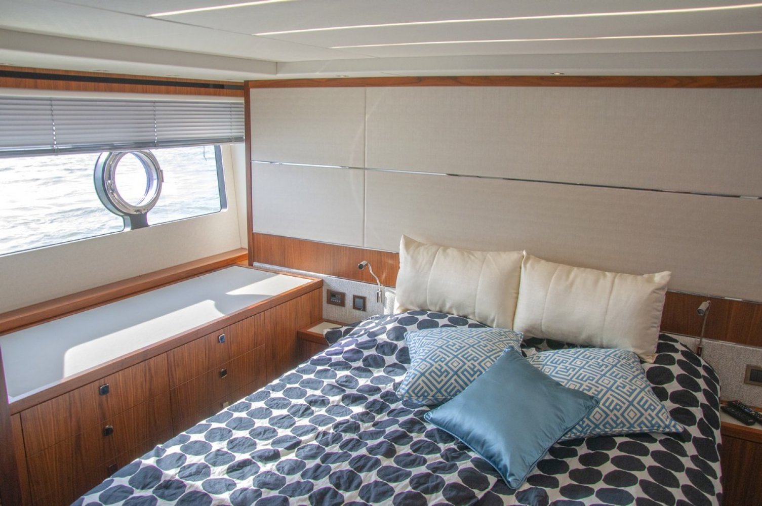 Lower saloon Samsung 22" Television with Fusion MS-AV750 DVD/CD/Radio and infrared remote eye with Bluetooth and Fusion PP-FR652 stereo speakers. Master Cabin Samsung 40" Television with Fusion MS-AV750 DVD/CD/Radio and infrared remote eye with Bluetooth and Fusion PP-FR652 stereo speakers. - Optional starboard side arrangement. Storage and drawer unit (no vanity lid) - Dometic Safe MD 281C concealed in cabinetry (8.3 lts. W280mm x H165mm x D235mm) Forward cabin Samsung 22" Television with Fusion MS-AV750 DVD/CD/Radio and infrared remote eye with Bluetooth and Fusion PP-FR652 stereo speakers. Deck Saloon Samsung 40" Television on a fall and rise system with a Samsung Blu-ray player. CD/Radio Fusion MS-AV750 with Fusion MS-NRX300 zone remote on console and infrared remote eye and Speaker craft stereo speakers.