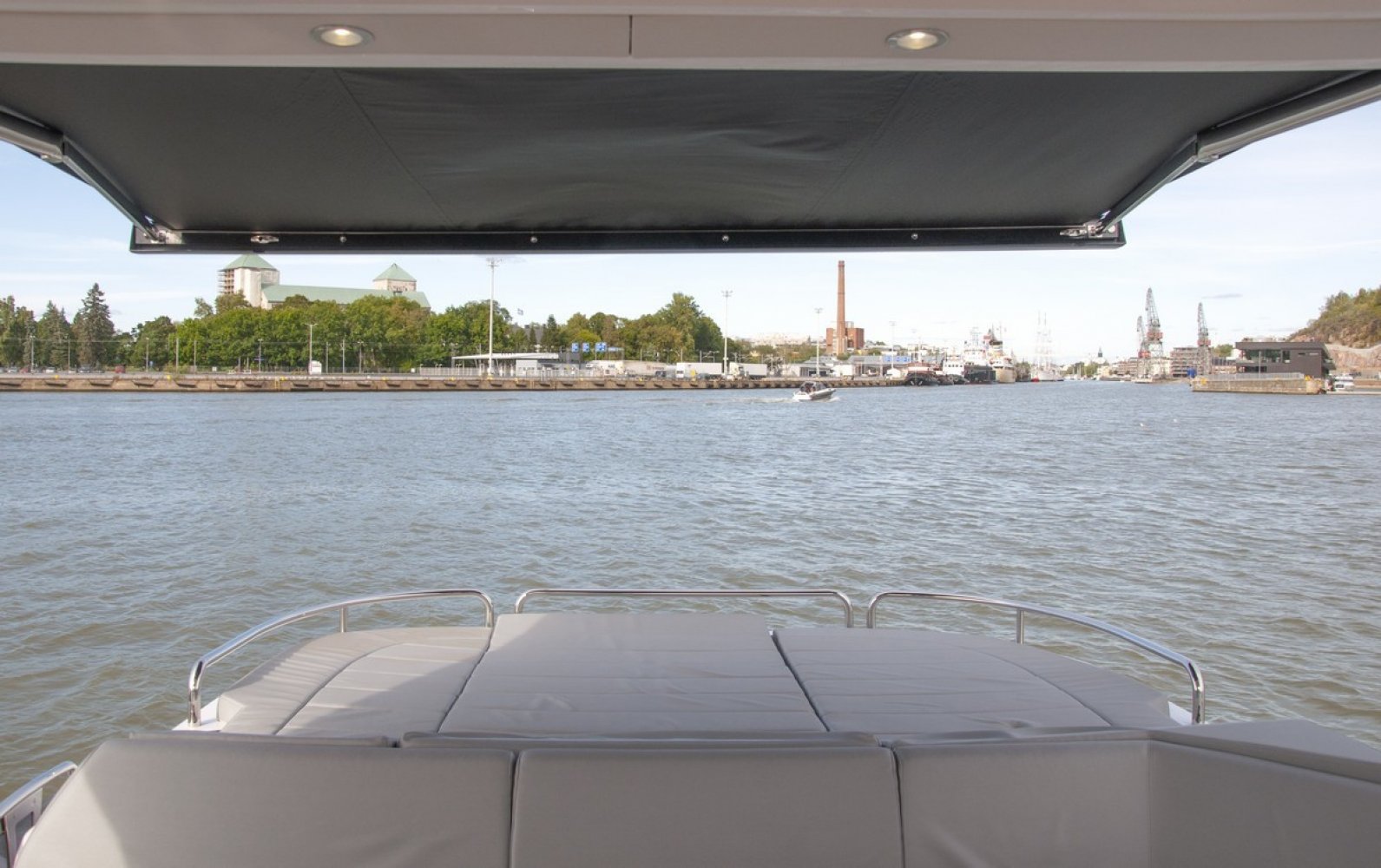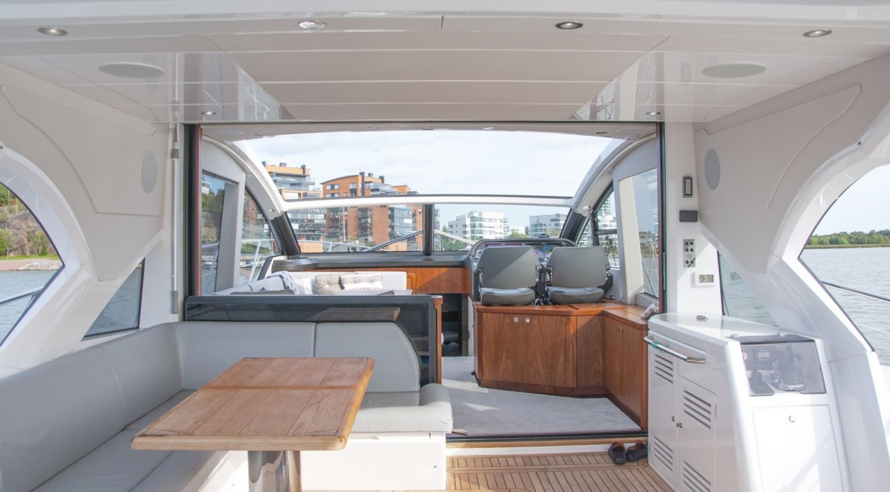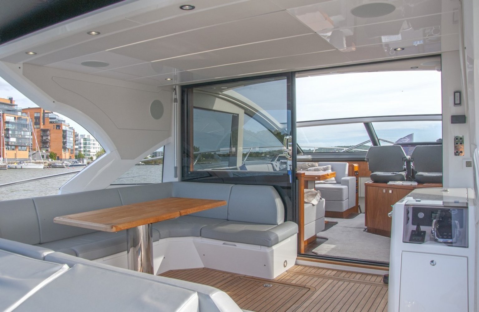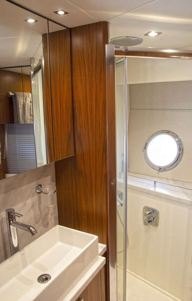 Electric windlass + 25kg anchor + chain Bow Sunbathing Cushions with folding back rests Fore Deck zone with Fusion MS-NRX300 zone remote and two Fusion AM-FR402 marine speakers Sliding glass cockpit door with drop down mechnism at seating to fully open the cockpit space Besenzoni Hydraulic 3 stage Gangway in S/Steel with teak walkway Hydraulically lifting platform with maximum lift capacity of 450kg Tender recovery roller system for Williams RIB Turbojet 325 Marine Can PB1328 Electric Grill fitted in a drop down work station 220V AC 63 Amps shorepower socket with 20m cable Rear Camper with windows in Sunbrella Plus Electric canopy for aft cockpit Protective Covers Package for aft cockpit sunpad, aft cockpit seating and aft cockpit table Aft docking station. Second Shaft drive throttles, Thuster control, Multi panel and horn. (Software update via Vodia) Teak decking Teak table with folding top fitted on a polished stainless steel leg Aft Cockpit zone from Deck Saloon with Fusion NRX200i zone remote and four Sonance ExtreamVP65RXT speakers with Fusion AM504 4-channel amplifier. Kenyon Marine Electric BBQ Grill Icemaker Vitrifrigo Refrigerator Waeco CR50 fitted in wet bar Stern docking Winches - Lewmar C3 fitted port and starboard