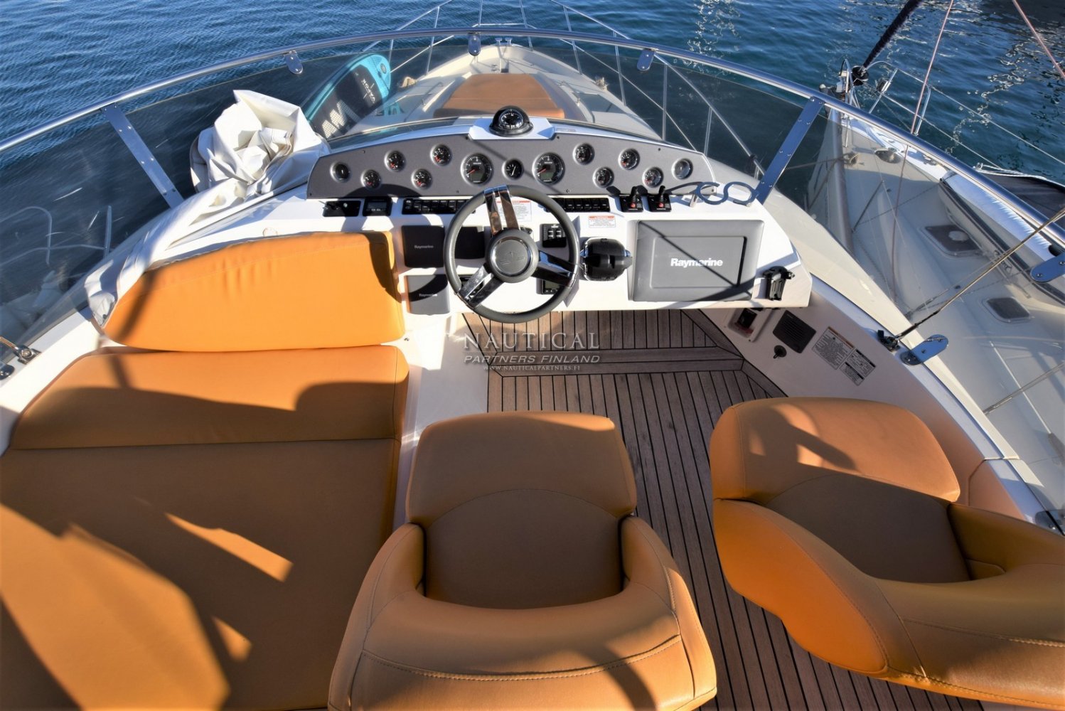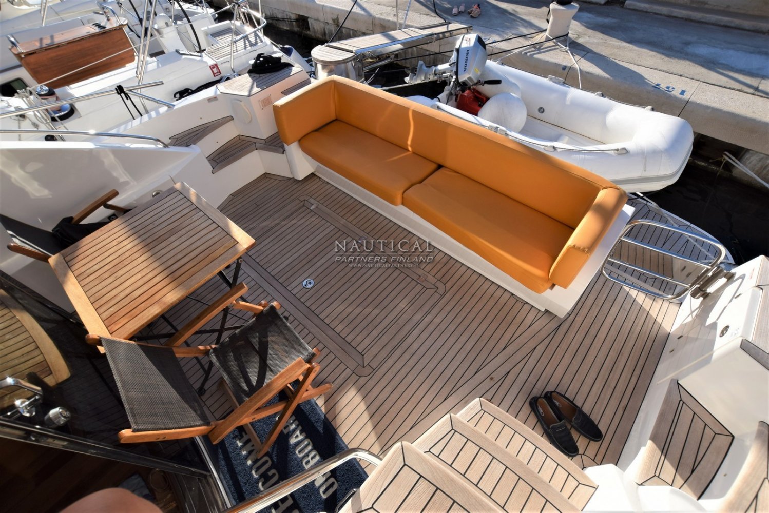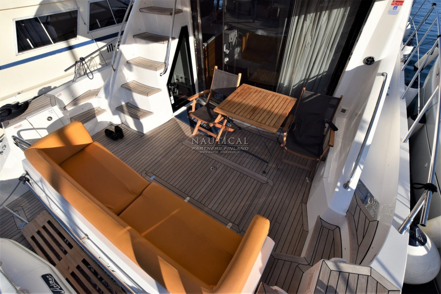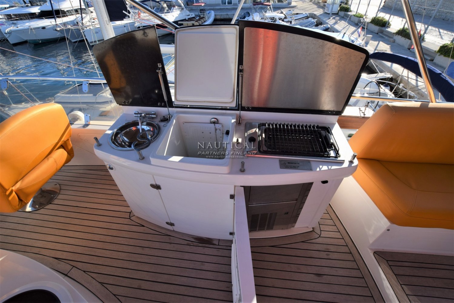 Vaatwasser Vriezer Magnetron Oven Koelkast Koffiezetapparaat Kooktoestel Afzuigkap televisies Stereo Airconditioning Hydraulisch gangpad Zoeklicht op afstand Cockpit tafel Boog zonneklapper Teakhouten dekken Flybridge BBQ met grill, spoelbak, koelkast en ijsblokjesmachine Boegschroef Stuwraket Radar Plotter Stuurautomaat Diepte Logboek Snelheid Elektrische ankerlier + kettingteller VHF Trimvlakken Walstroom + lader Generator Bimini