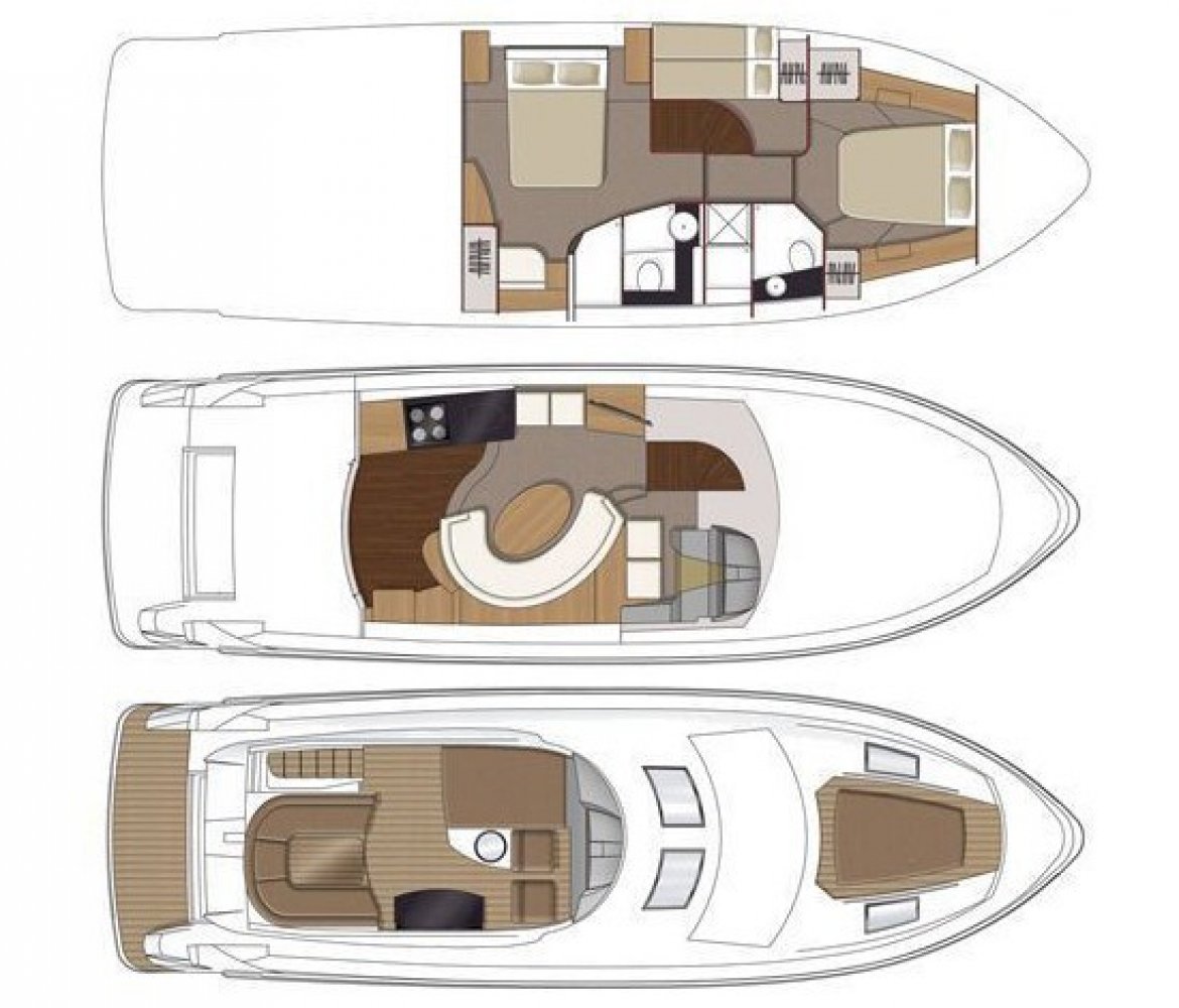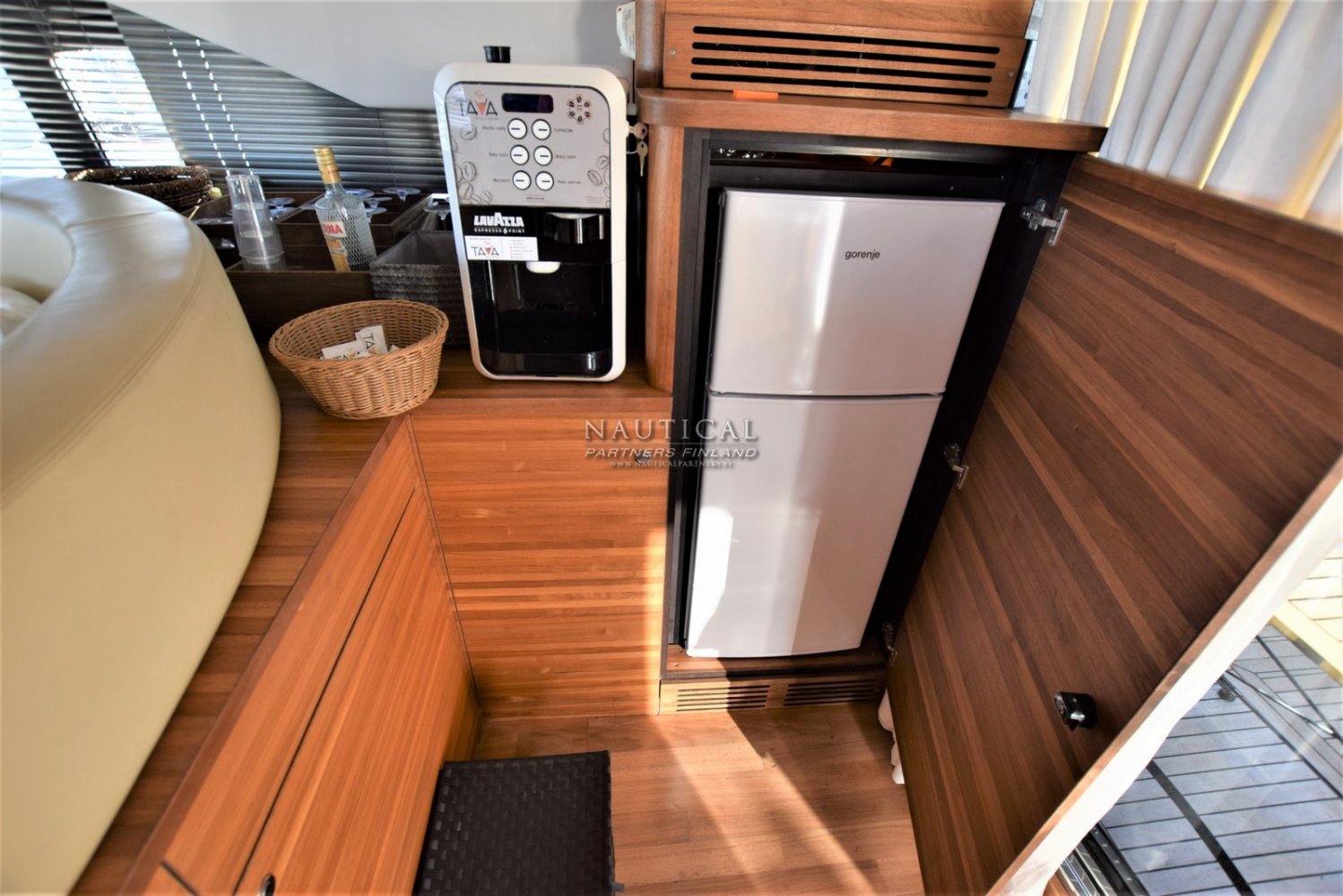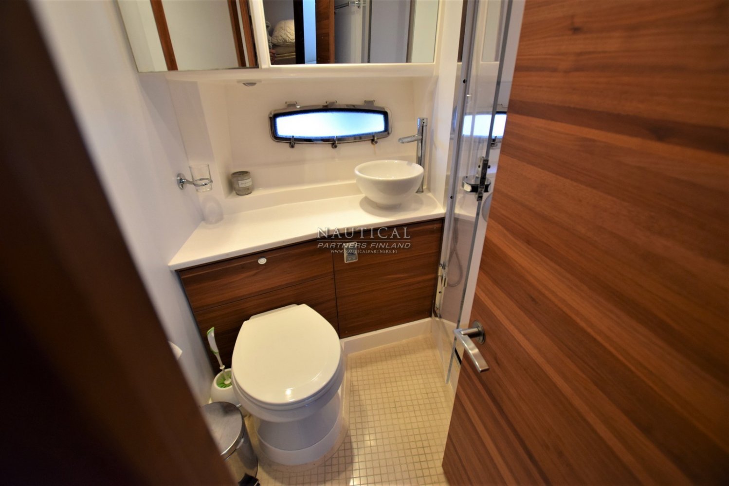 Vaatwasser Vriezer Magnetron Oven Koelkast Koffiezetapparaat Kooktoestel Afzuigkap televisies Stereo Airconditioning Hydraulisch gangpad Zoeklicht op afstand Cockpit tafel Boog zonneklapper Teakhouten dekken Flybridge BBQ met grill, spoelbak, koelkast en ijsblokjesmachine Boegschroef Stuwraket Radar Plotter Stuurautomaat Diepte Logboek Snelheid Elektrische ankerlier + kettingteller VHF Trimvlakken Walstroom + lader Generator Bimini