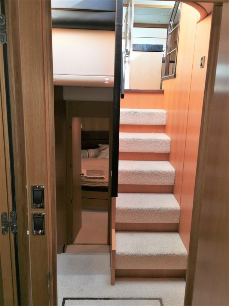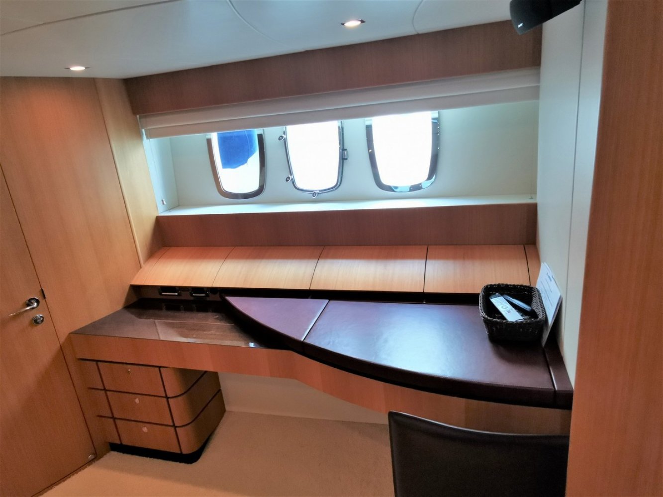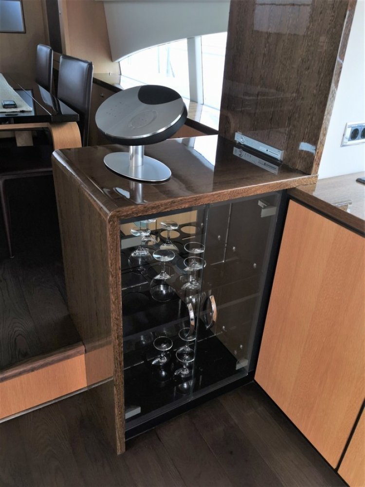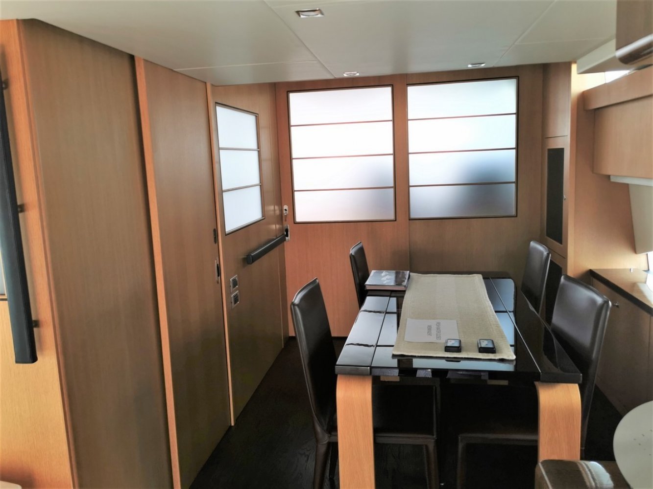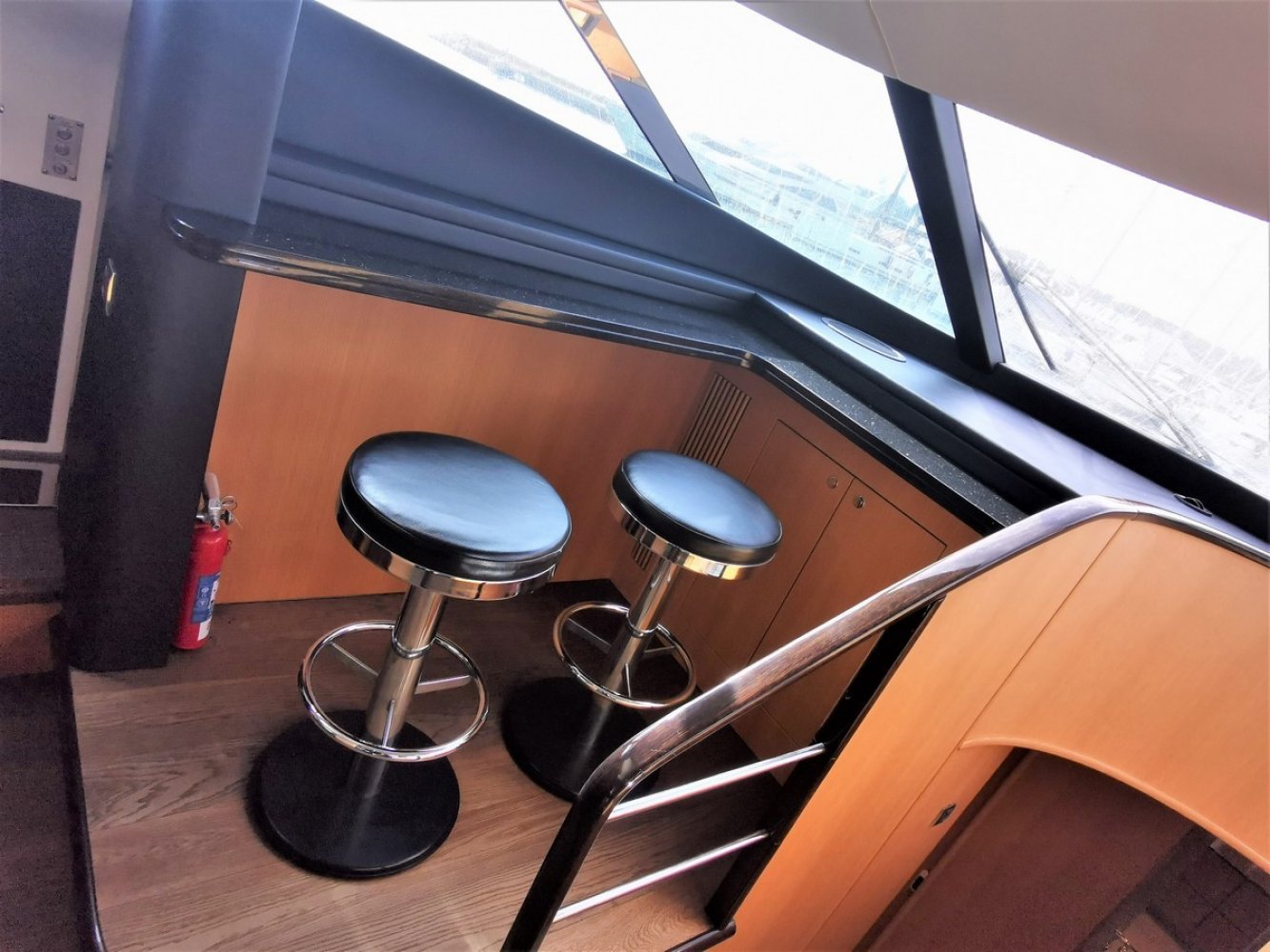Boegschroef Stuwraket Elektrische ankerlier Dinghy kraan op flybridge Hydraulisch zwemplateau Trimvlakken Volledige navigatie Hydraulische passarelle Omvormer Walstroom 2 x Onan generator (~2100 uur) Vliegbrug BBQ + wetbar + ijsmaker Bode-entertainmentsysteem in salon Volledige kombuis inclusief diepvriezer en vaatwasser Airconditioning / verwarming in het hele gebouw Watermaker Biminitop Satellietantenne TV's in alle hutten