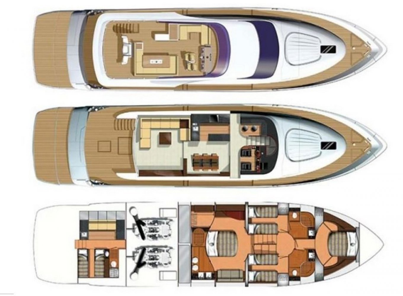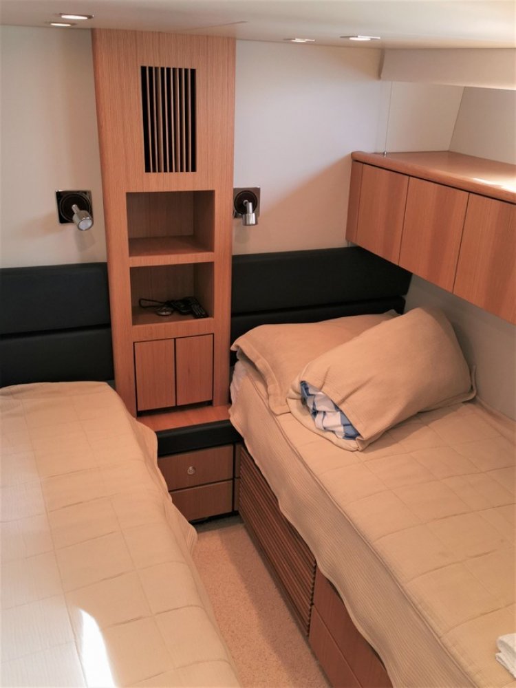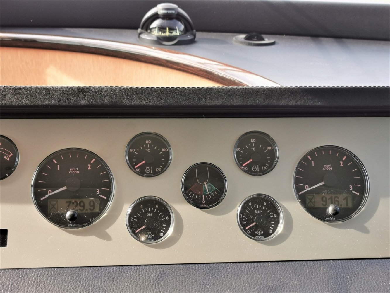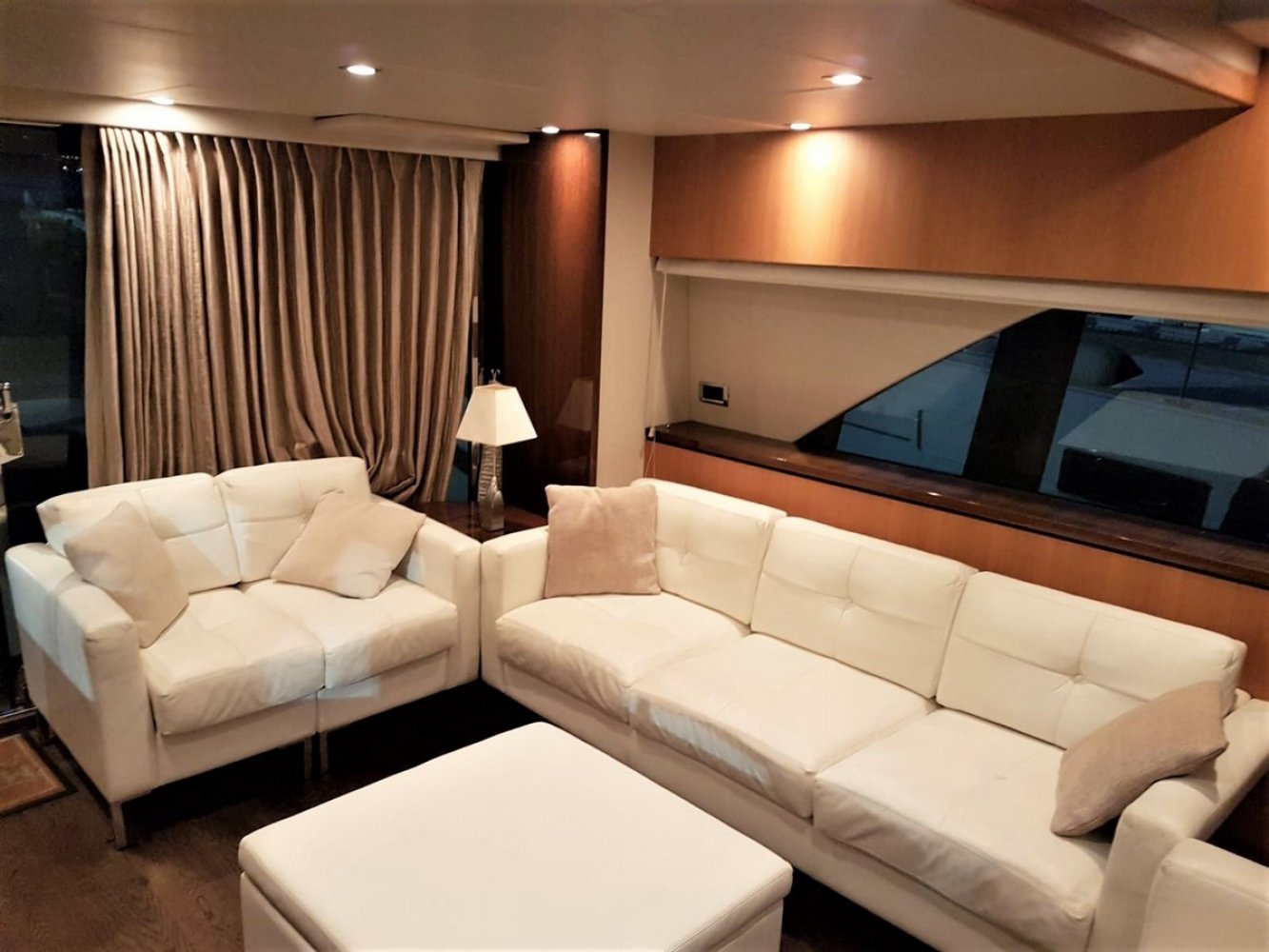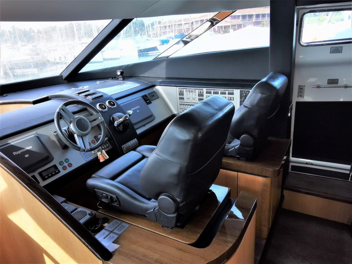 Boegschroef Stuwraket Elektrische ankerlier Dinghy kraan op flybridge Hydraulisch zwemplateau Trimvlakken Volledige navigatie Hydraulische passarelle Omvormer Walstroom 2 x Onan generator (~2100 uur) Vliegbrug BBQ + wetbar + ijsmaker Bode-entertainmentsysteem in salon Volledige kombuis inclusief diepvriezer en vaatwasser Airconditioning / verwarming in het hele gebouw Watermaker Biminitop Satellietantenne TV's in alle hutten