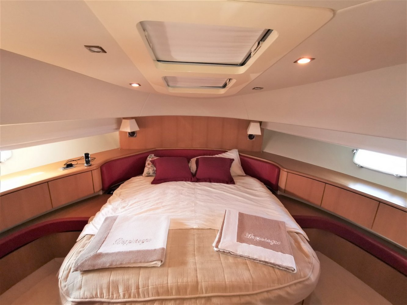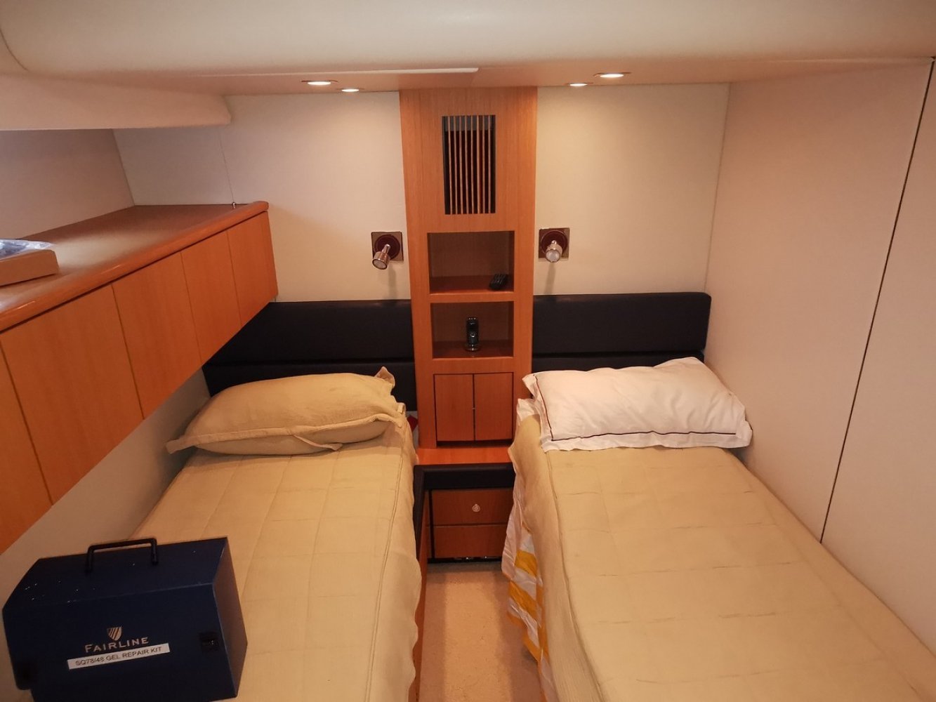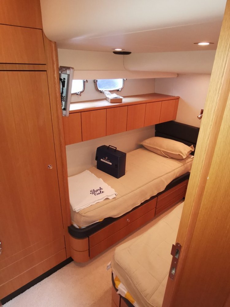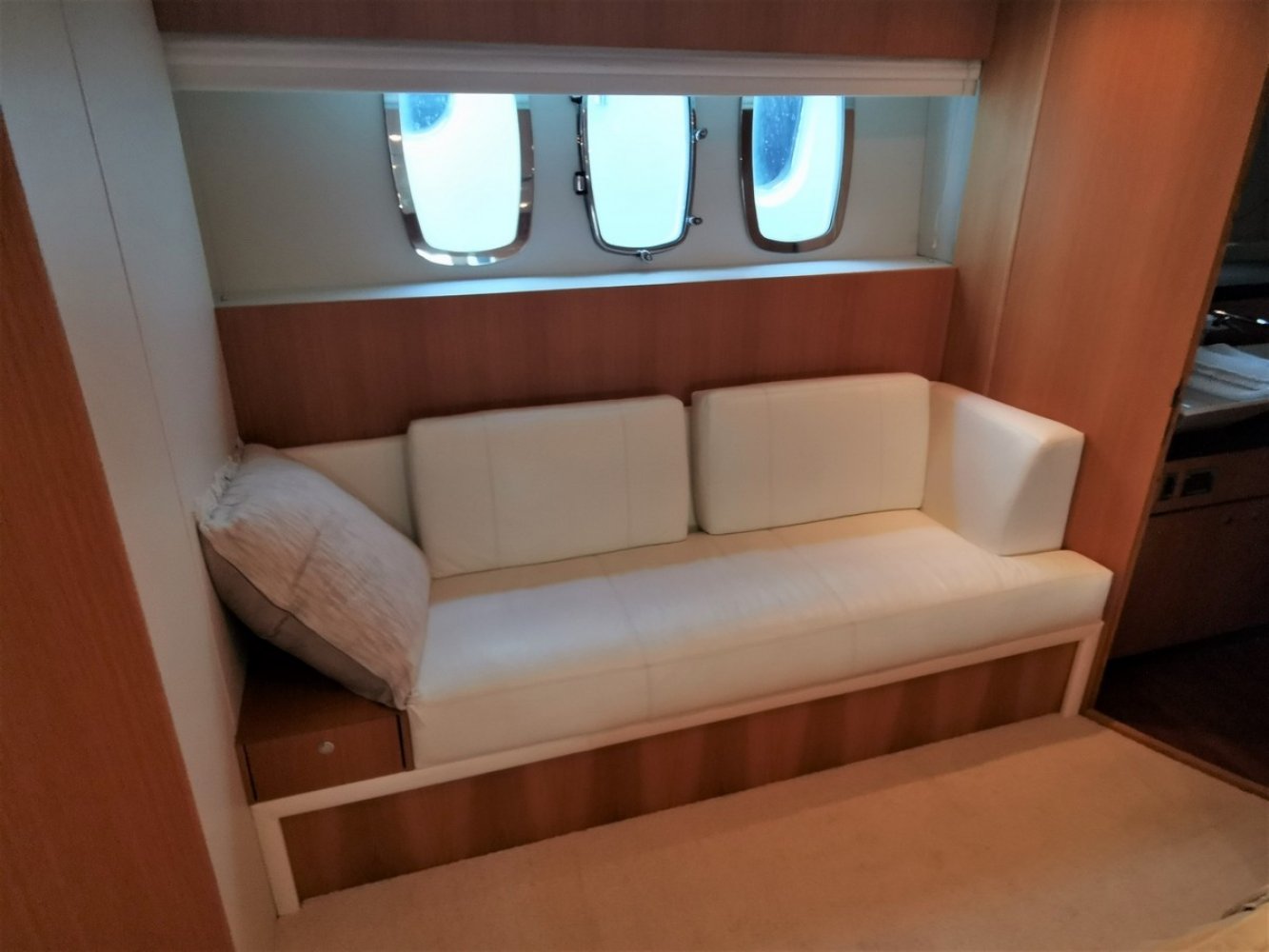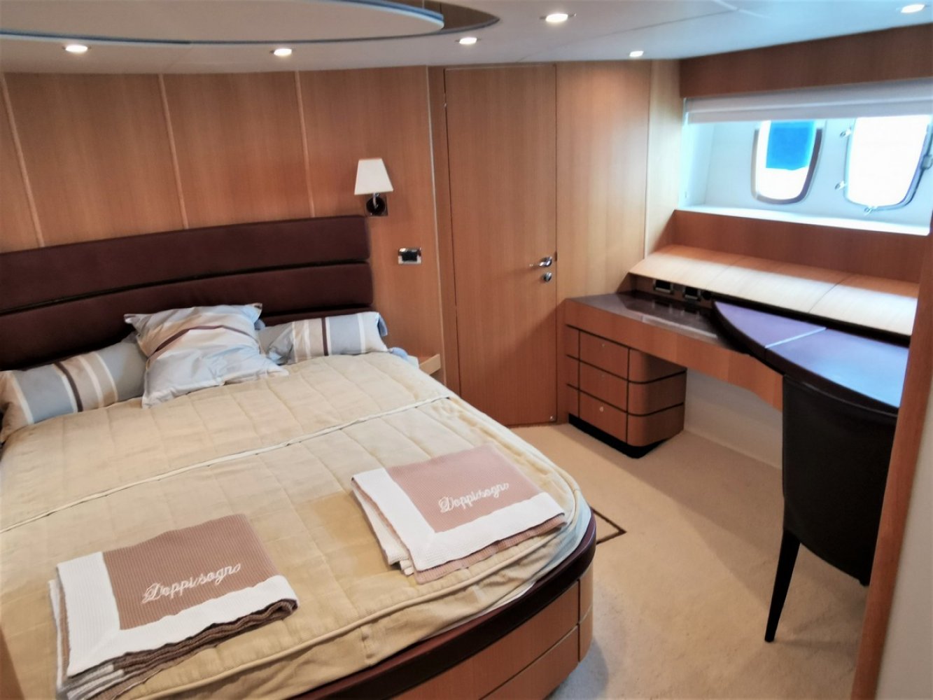 Boegschroef Stuwraket Elektrische ankerlier Dinghy kraan op flybridge Hydraulisch zwemplateau Trimvlakken Volledige navigatie Hydraulische passarelle Omvormer Walstroom 2 x Onan generator (~2100 uur) Vliegbrug BBQ + wetbar + ijsmaker Bode-entertainmentsysteem in salon Volledige kombuis inclusief diepvriezer en vaatwasser Airconditioning / verwarming in het hele gebouw Watermaker Biminitop Satellietantenne TV's in alle hutten