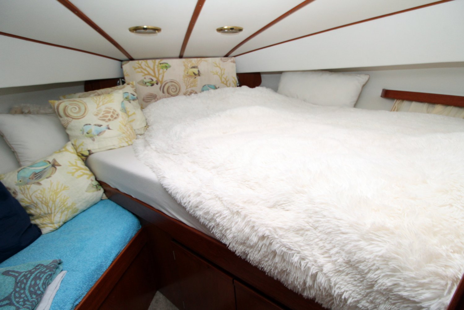 Over het geïntegreerde zwemplateau, welke met teakhout is bekleed, bereikt men gemakkelijk, via een deur, het achterdek. Het achterdek is voorzien van comfortabele banken, die voldoende plaats bieden aan u en uw gasten en heeft eveneens een teakhouten vloer. Een grote glazen schuifdeur geeft toegang tot de leefruimte, die licht en ruim aandoet dankzij de grote ramen rondom. In de salon bevindt zich een ruime, comfortabele U-vormige bank, waaraan het gezellig aanschuiven is voor een hapje en een drankje. De hier tegenover gelegen kombuis is praktisch van indeling en heeft genoeg werk -en kastruimte. Verder doorlopend treft u een compleet uitgeruste binnen stuurstand aan. Makkelijk begaanbare treden leiden naar de aan stuurboord zijde gelegen natte cel, welke verrassend ruim is. Hier treft u een wastafel, douche en toilet aan en veel kastruimte, zowel onder als achter de wastafel. Aan de andere kant van de hal bevindt zich een gastenhut met een 2 pers bed en voldoende kastruimte voor persoonlijke spullen. De eigenaars hut bevindt zich in de boeg, hier treft u een 2 pers bed aan welke schuin aan stuurboord geplaatst is met er tegenover een bankje. Verder is er voldoende bergruimte aanwezig voor uw persoonlijke spullen. Een hete lucht verwarming zorgt ervoor dat u ook tijdens frissere dagen comfortabel kunt genieten van uw verblijf op het water.