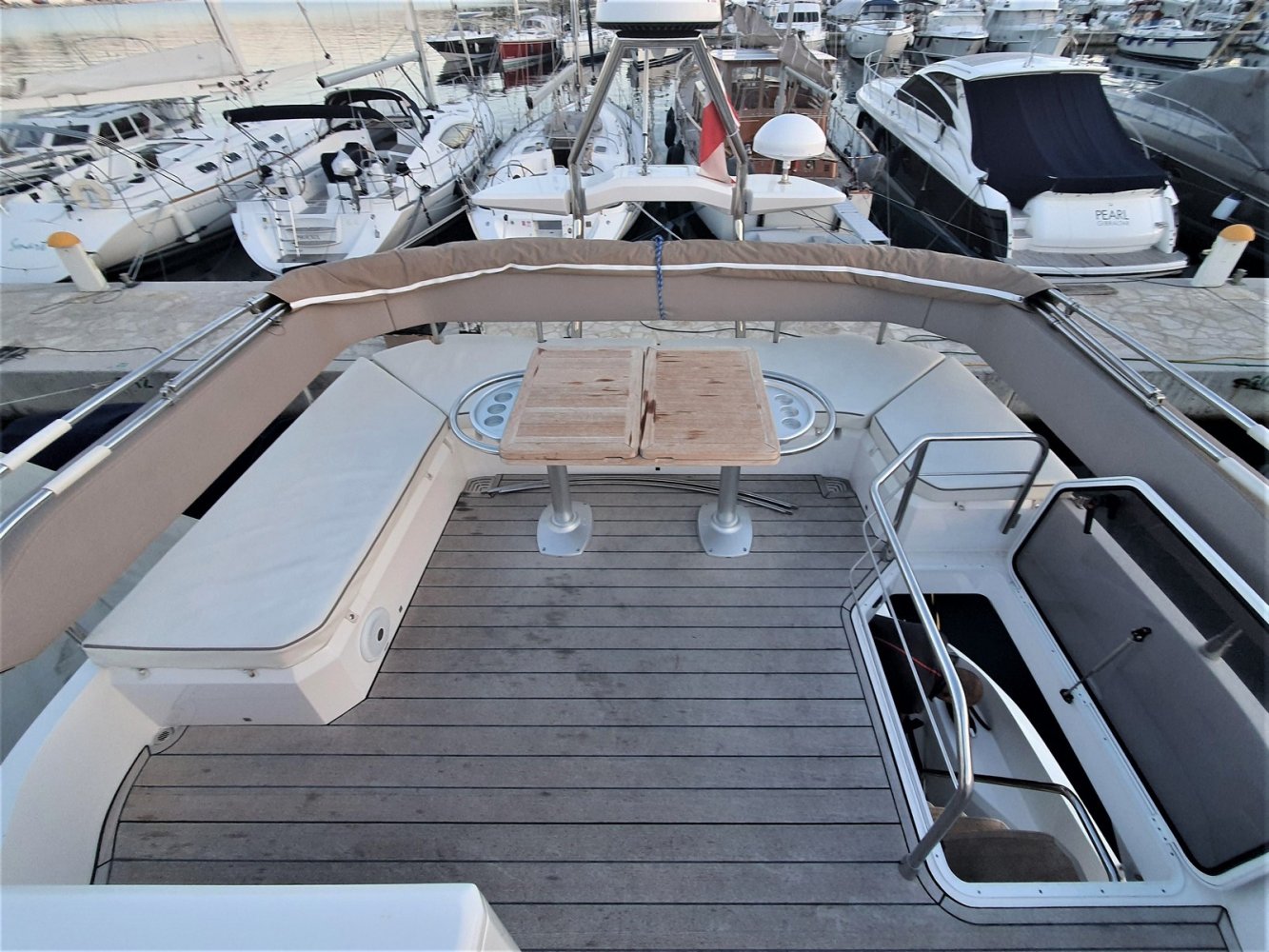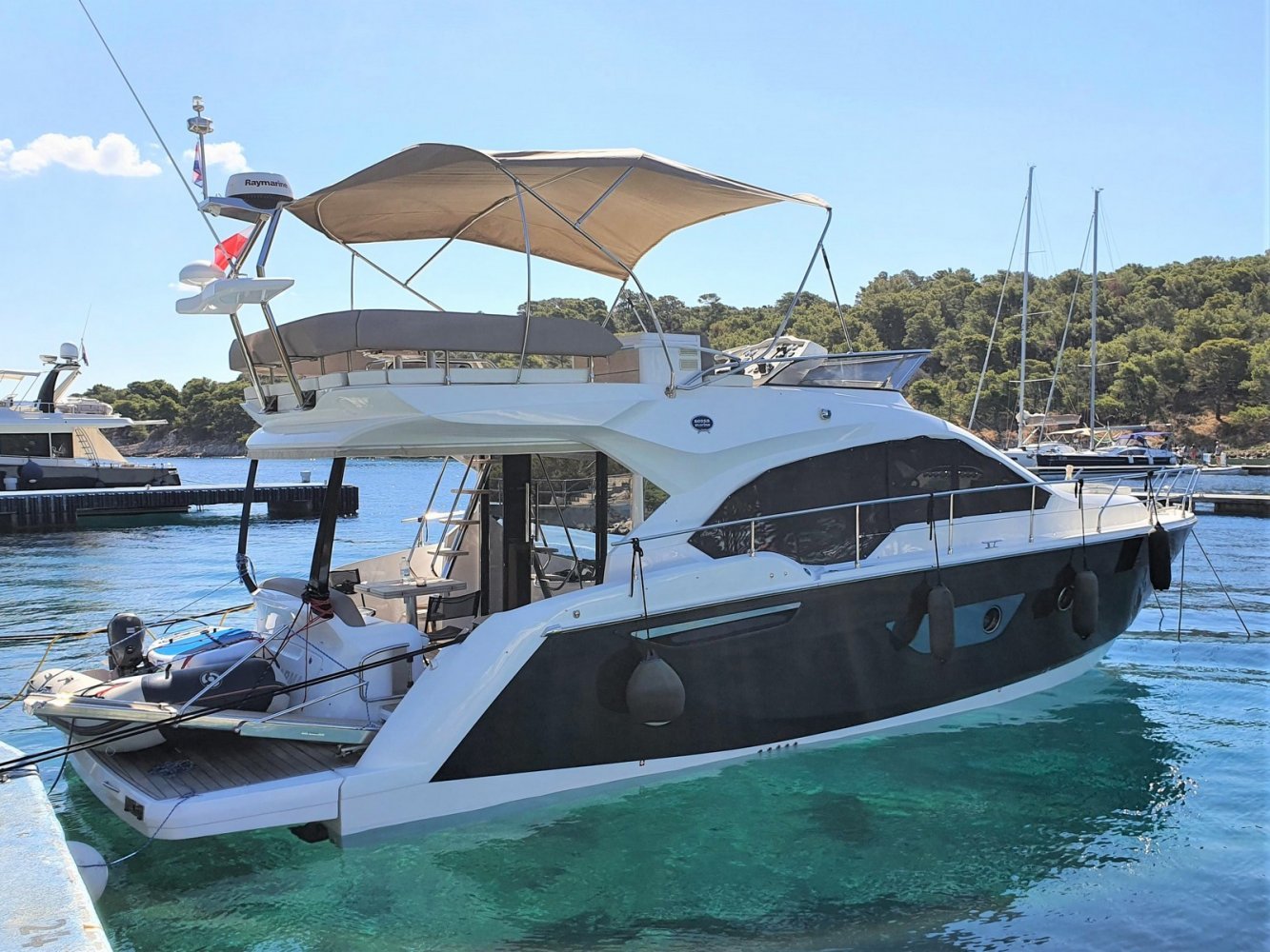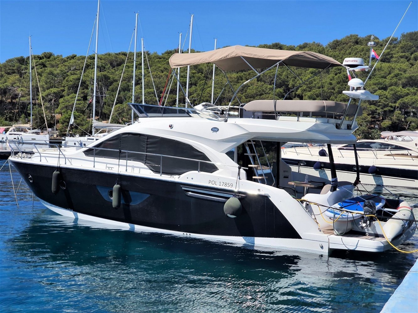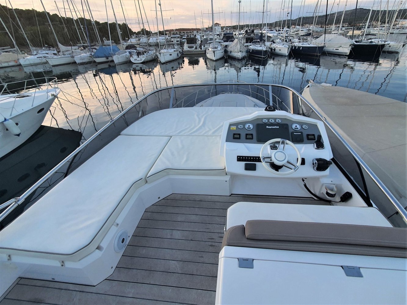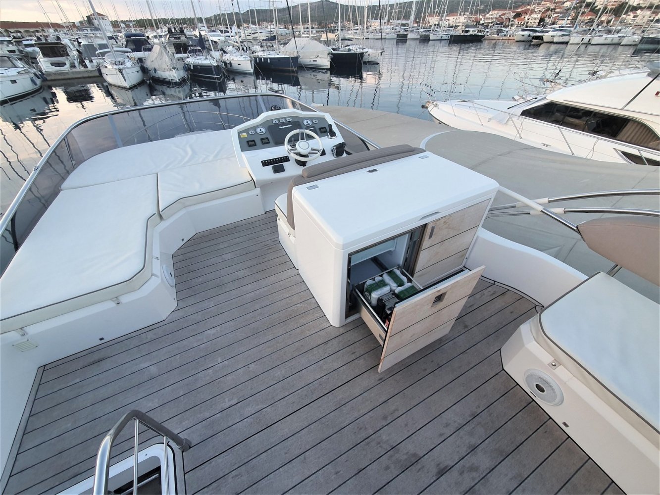 1. Cruise Pack 2. Elegance Pack 3. Power Pakket 4. Romp kleur zwart 5. Onderwaterverlichting (wit) 6. Eerste kwaliteit bruin lederen salonbank (standaard weefsel) 7. Flybridge uitrusting in teakhout 8. Verdwijnend intrekbaar hydraulisch gangboord 9. Upgrade boegroller en rvs anker 20 kg 10. Koelkast en vriezer in salon 11. Vaatwasser 12. Wasmachine/droger 13. Kluis 14. Set zonnekappen voor centrale en zijruiten 15. Barmeubel vliegen met gootsteen, koelkast en grill 16. Raymarine digitale radar RD418 17. Verdwijnende 40" LED TV in salon (alleen met Cruise Pack) 18. 22" LED TV in master cabine (alleen met Cruise Pack) 19. 19. CD-speler stereo-installatie met luidsprekers in de mastercabin 20. Fusion MS-IP700 audiosysteem vlieg en boeg 21. Upgrade GPS Raymarine E127 (stuurstand) met fishfinder 22. Antifouling