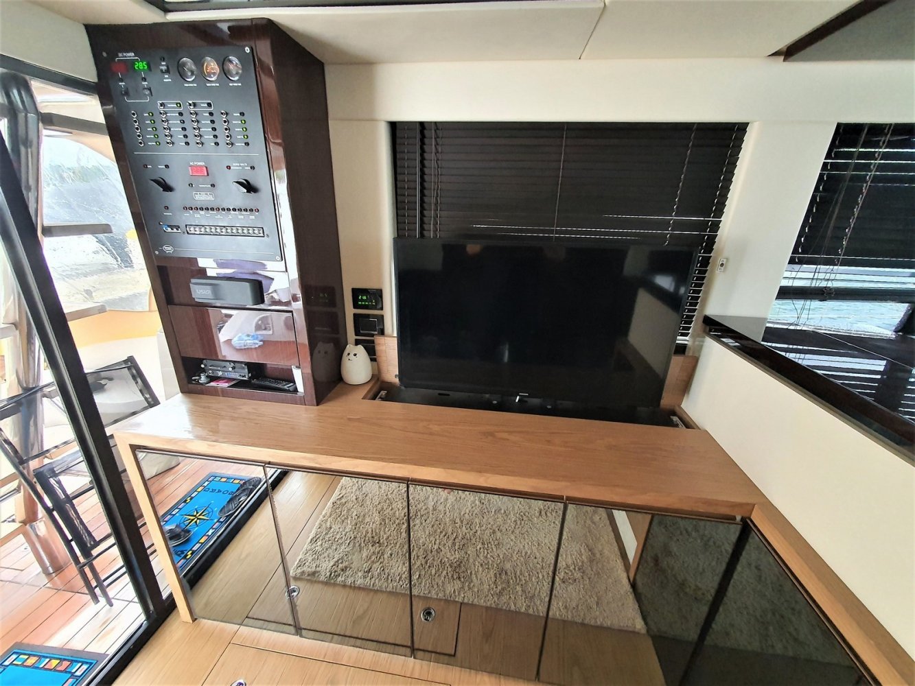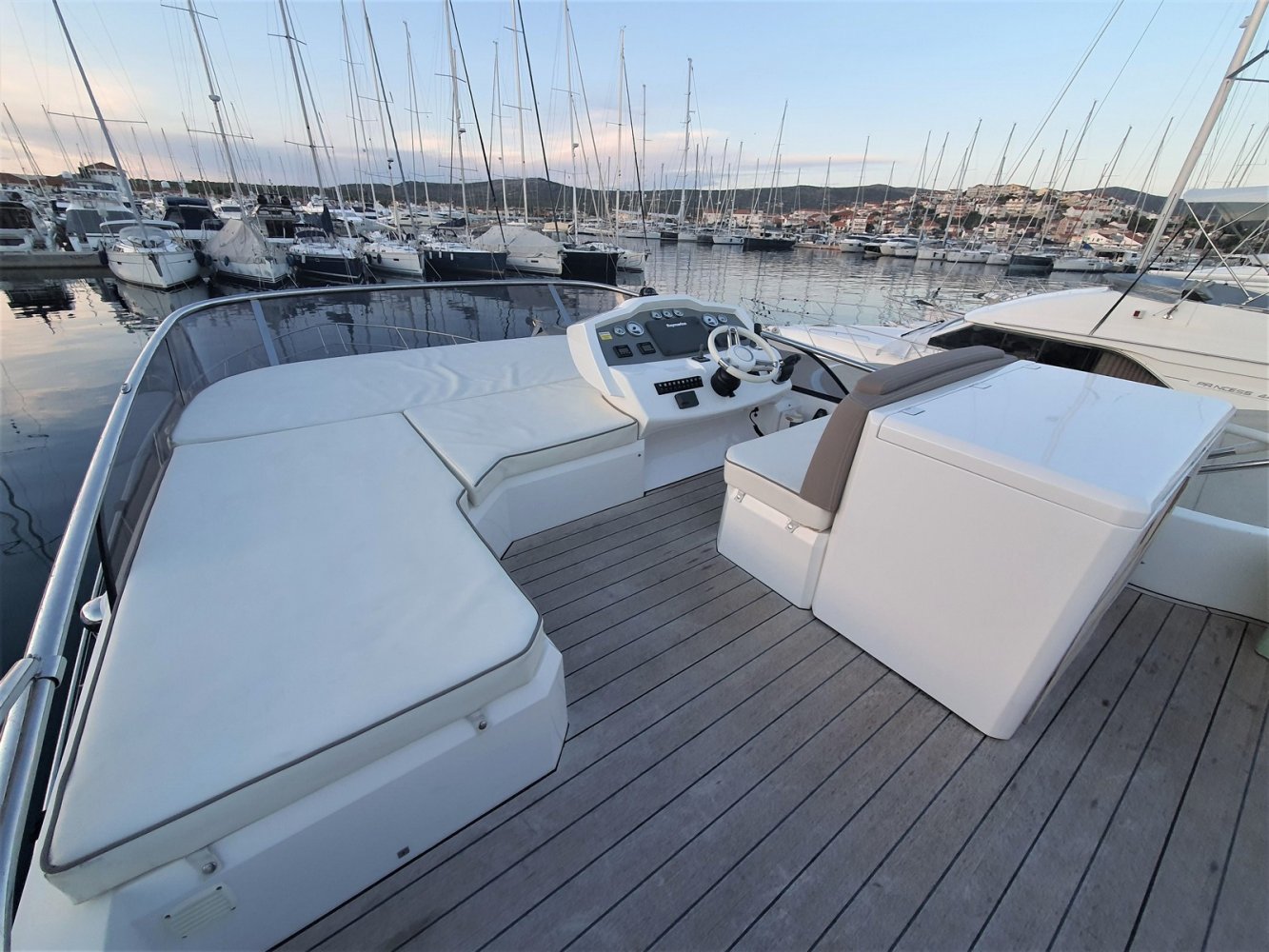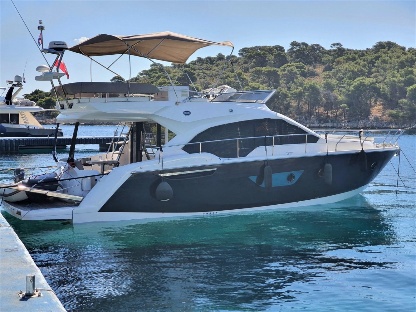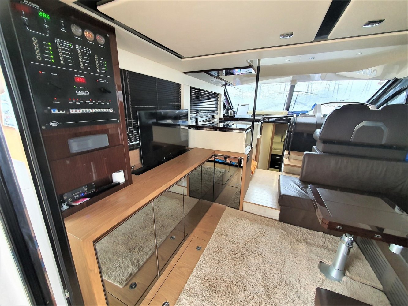 1. Cruise Pack 2. Elegance Pack 3. Power Pakket 4. Romp kleur zwart 5. Onderwaterverlichting (wit) 6. Eerste kwaliteit bruin lederen salonbank (standaard weefsel) 7. Flybridge uitrusting in teakhout 8. Verdwijnend intrekbaar hydraulisch gangboord 9. Upgrade boegroller en rvs anker 20 kg 10. Koelkast en vriezer in salon 11. Vaatwasser 12. Wasmachine/droger 13. Kluis 14. Set zonnekappen voor centrale en zijruiten 15. Barmeubel vliegen met gootsteen, koelkast en grill 16. Raymarine digitale radar RD418 17. Verdwijnende 40" LED TV in salon (alleen met Cruise Pack) 18. 22" LED TV in master cabine (alleen met Cruise Pack) 19. 19. CD-speler stereo-installatie met luidsprekers in de mastercabin 20. Fusion MS-IP700 audiosysteem vlieg en boeg 21. Upgrade GPS Raymarine E127 (stuurstand) met fishfinder 22. Antifouling