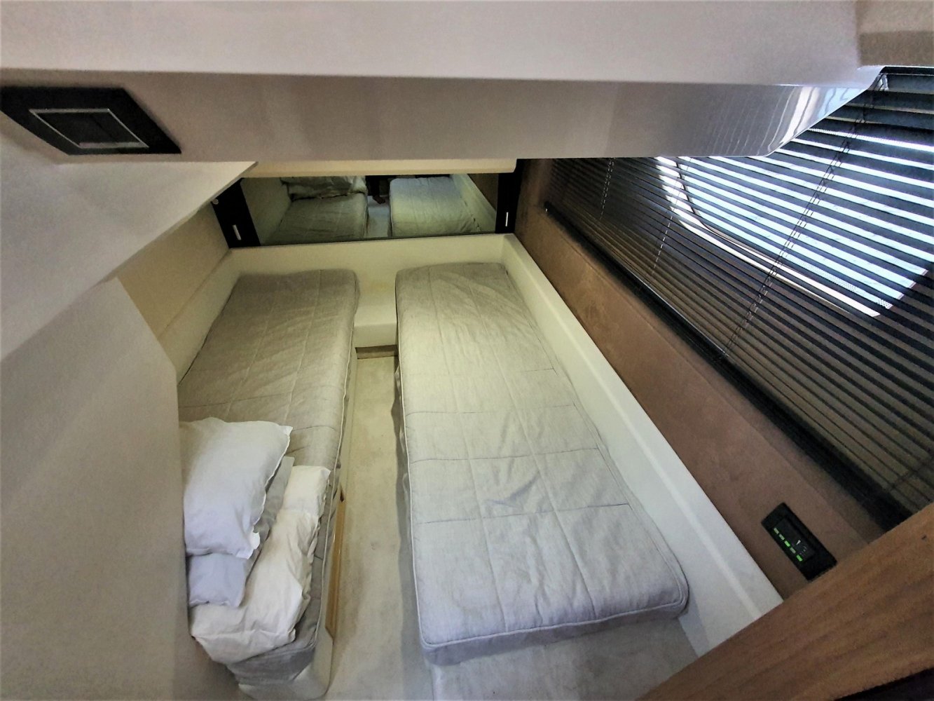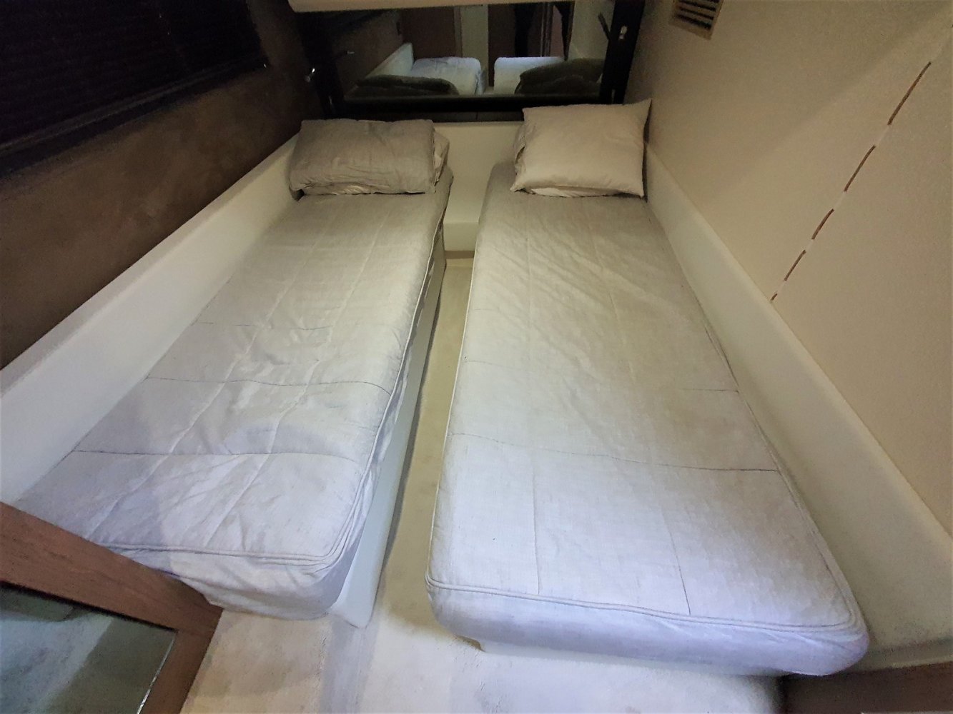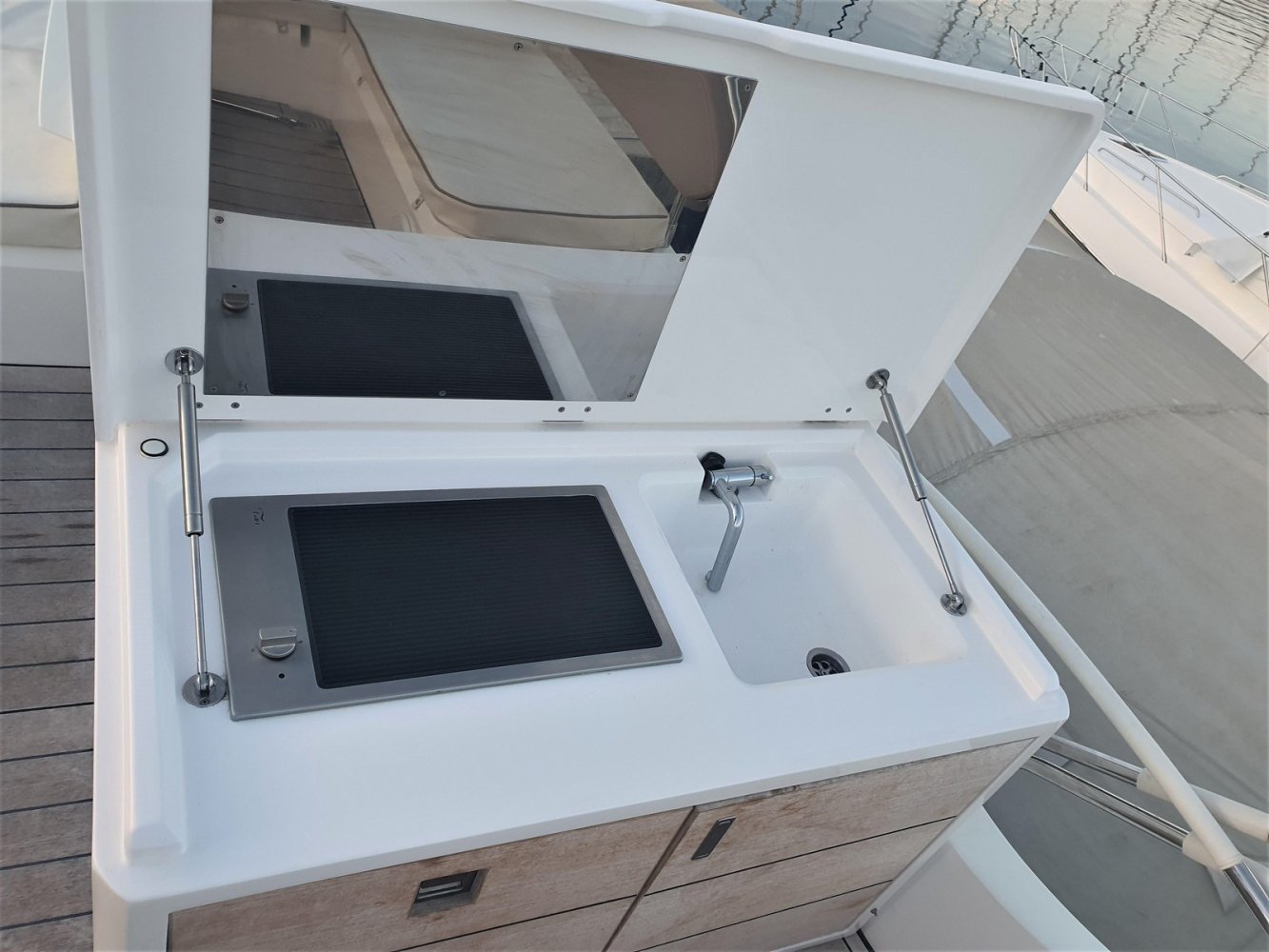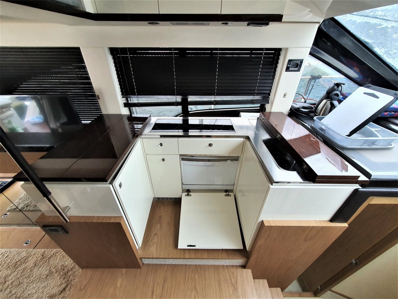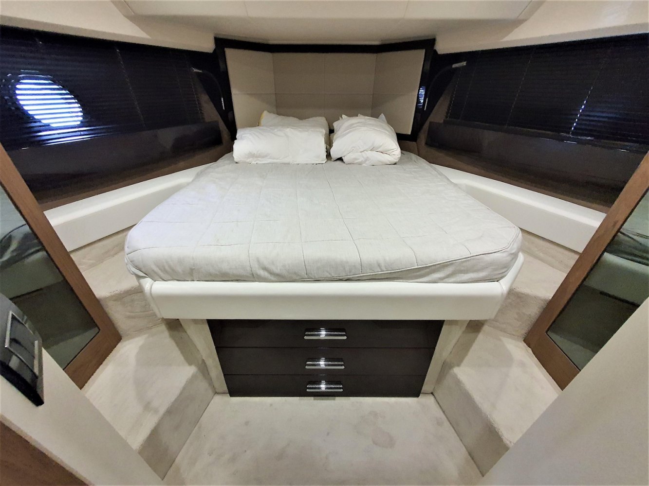 1. Cruise Pack 2. Elegance Pack 3. Power Pakket 4. Romp kleur zwart 5. Onderwaterverlichting (wit) 6. Eerste kwaliteit bruin lederen salonbank (standaard weefsel) 7. Flybridge uitrusting in teakhout 8. Verdwijnend intrekbaar hydraulisch gangboord 9. Upgrade boegroller en rvs anker 20 kg 10. Koelkast en vriezer in salon 11. Vaatwasser 12. Wasmachine/droger 13. Kluis 14. Set zonnekappen voor centrale en zijruiten 15. Barmeubel vliegen met gootsteen, koelkast en grill 16. Raymarine digitale radar RD418 17. Verdwijnende 40" LED TV in salon (alleen met Cruise Pack) 18. 22" LED TV in master cabine (alleen met Cruise Pack) 19. 19. CD-speler stereo-installatie met luidsprekers in de mastercabin 20. Fusion MS-IP700 audiosysteem vlieg en boeg 21. Upgrade GPS Raymarine E127 (stuurstand) met fishfinder 22. Antifouling