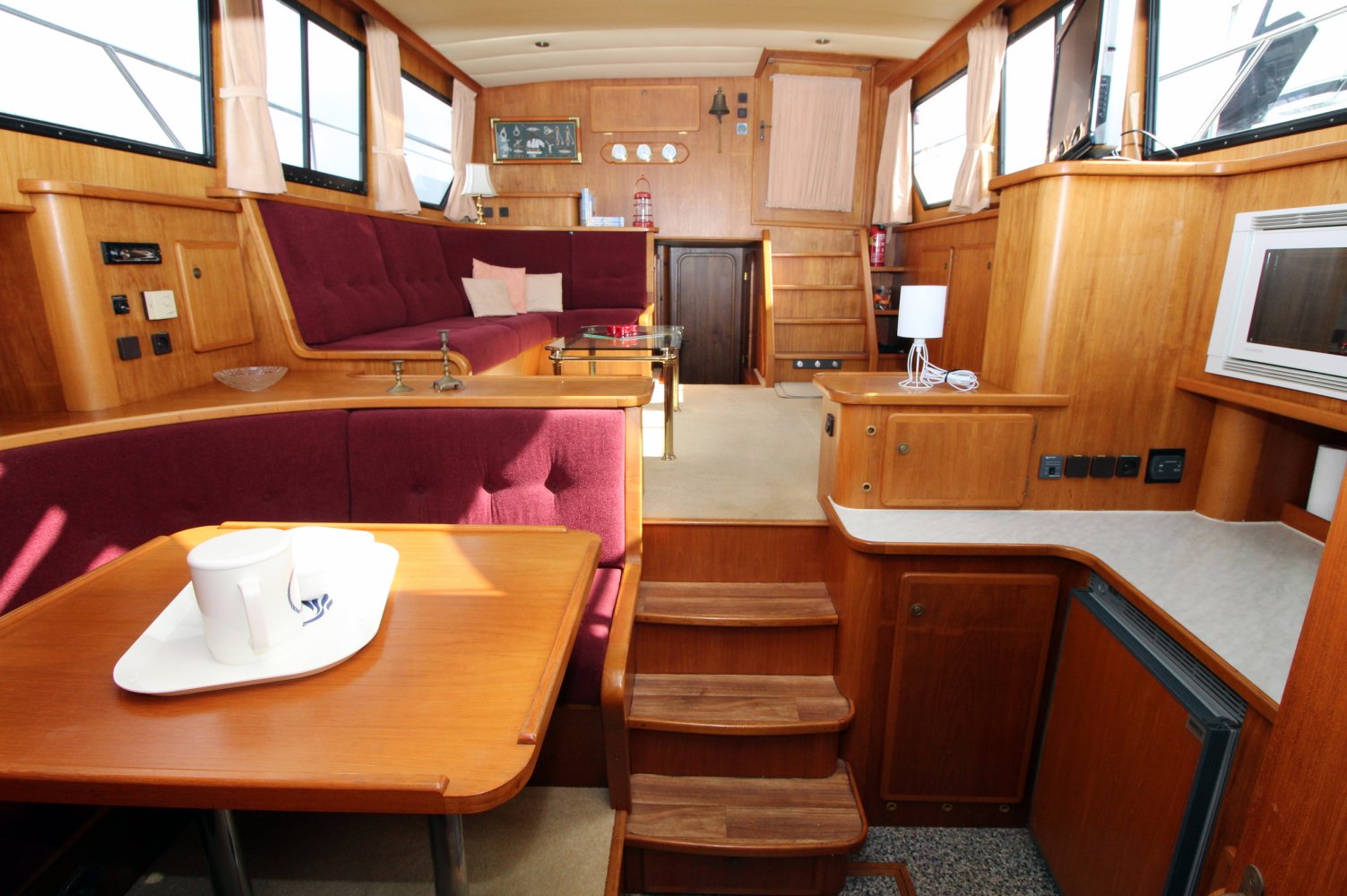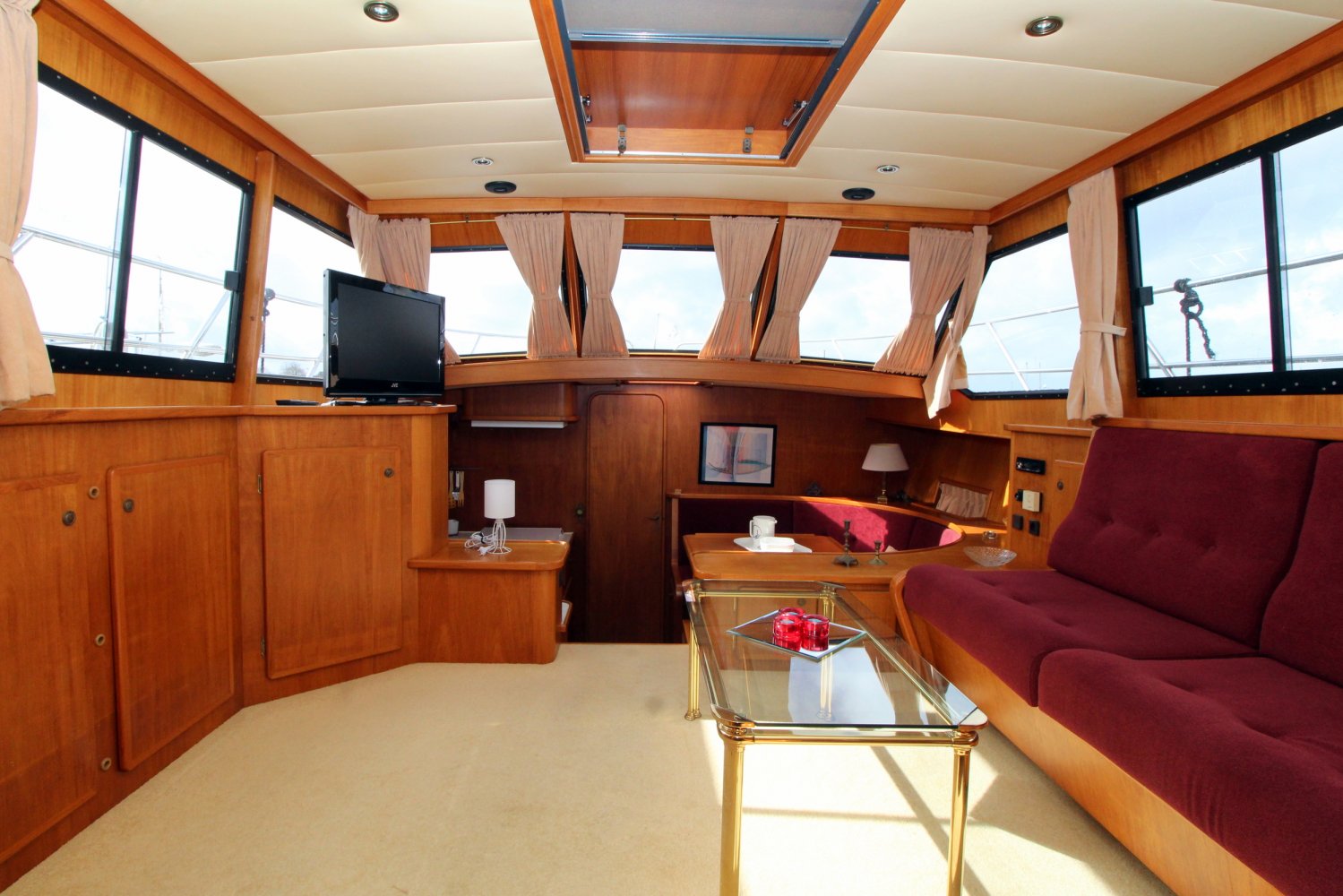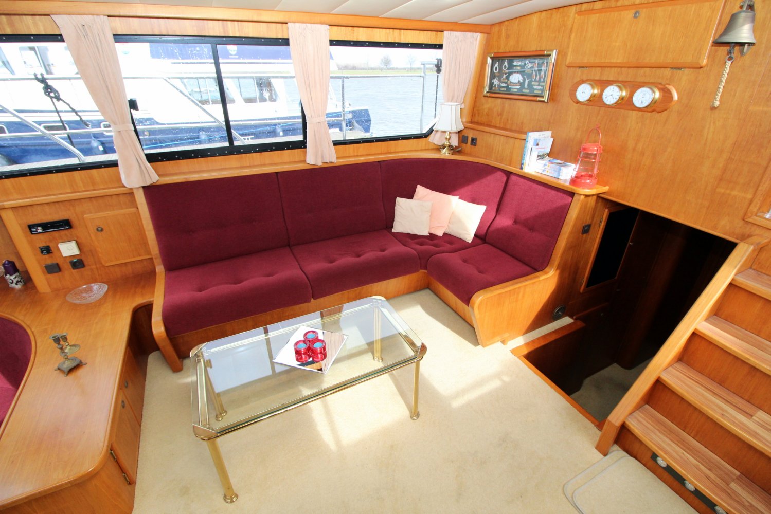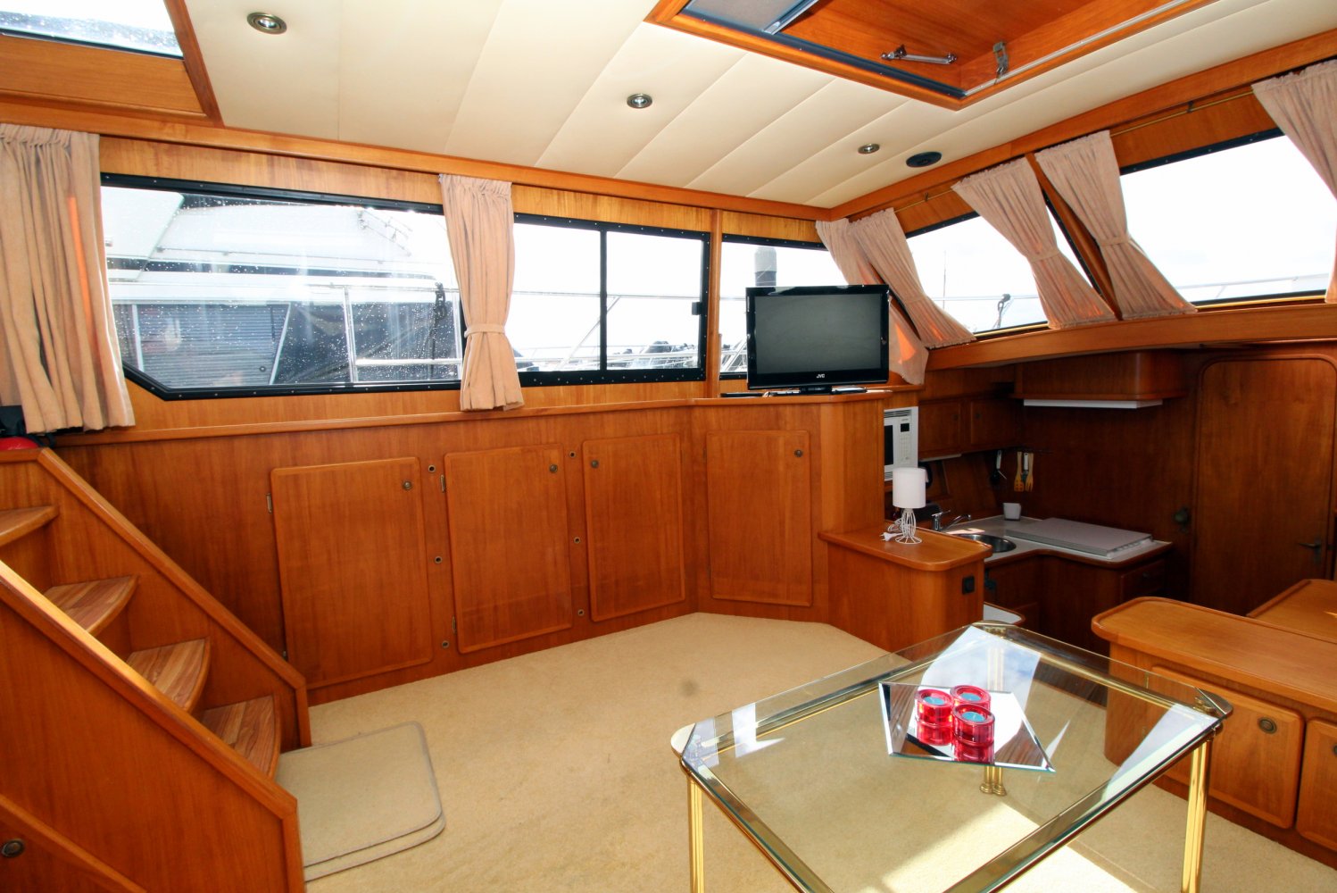 Aan boord van deze Valk Super Falcon 45 loopt men makkelijk en veilig naar voren via brede gangboorden welke over een hoge reling beschikken. Het achterdek is zeer ruim en uitgerust met een royale bank waarin dekkisten zijn geïntegreerd. Ook naast de stuurstand is een bank geplaatst met hierin bergruimte. Een makkelijk begaanbare trap leidt naar de leefruimte benedendeks. Door de grote ramen in de salon schijnt  heerlijk veel daglicht naar binnen wat voor een lichte gezellige uitstraling zorgt. De praktisch ingedeelde kombuis heeft voldoende werk- en kastruimte en is onder andere uitgerust met een 4 pits gasstel plus afzuigkap. Hier tegenover is een comfortabele rondzit  geplaatst waaraan het gezellig aanschuiven is voor een hapje of een drankje. Vanuit de kombuis bereikt men de gastenhut, welke is voorzien van 2 V-vormige bedden en een eigen toiletruimte met wastafel.  Een hal in het achterschip  geeft aan stuurboord toegang tot een zeer ruime badkamer met wastafel, aparte douchecabine en toilet. Hiertegenover, aan bakboord, is een tweede gastenhut met een eenpersoons bed en bergruimte. De hierachter gelegen eigenaars hut is ruim bemeten en voorzien van een vrijstaand 2 persoons bed en veel kastruimte voor persoonlijke spullen.