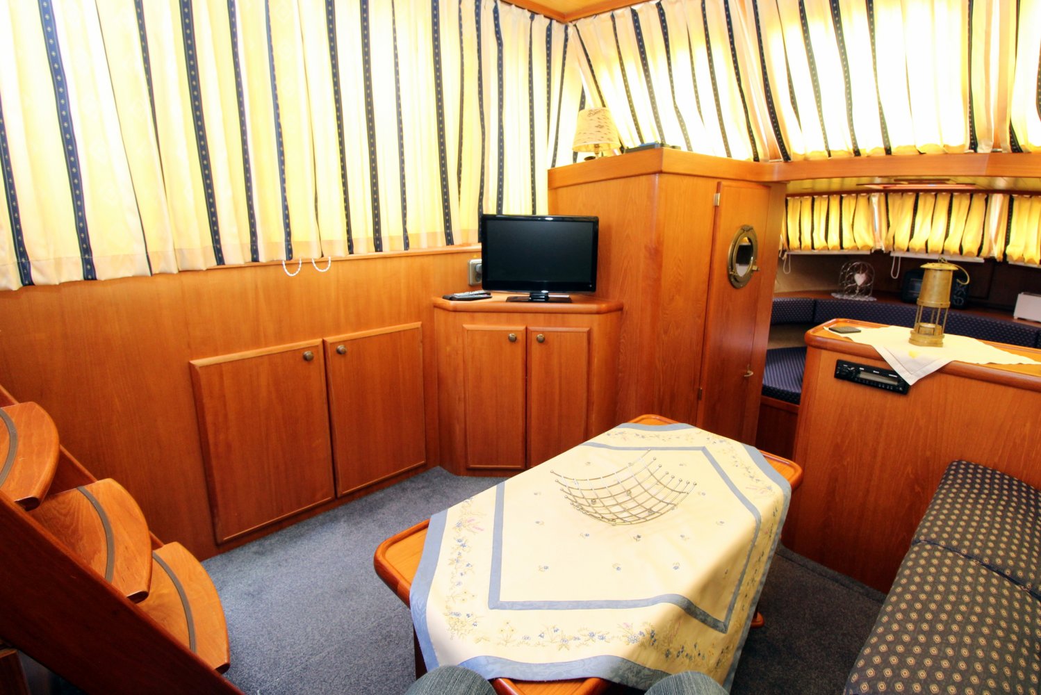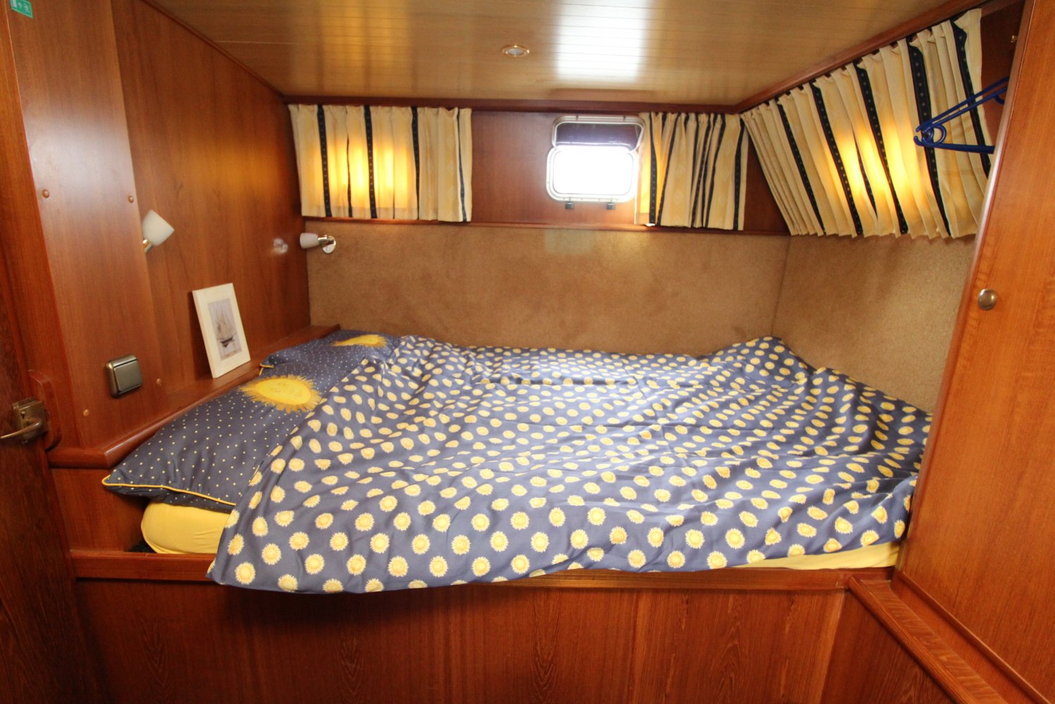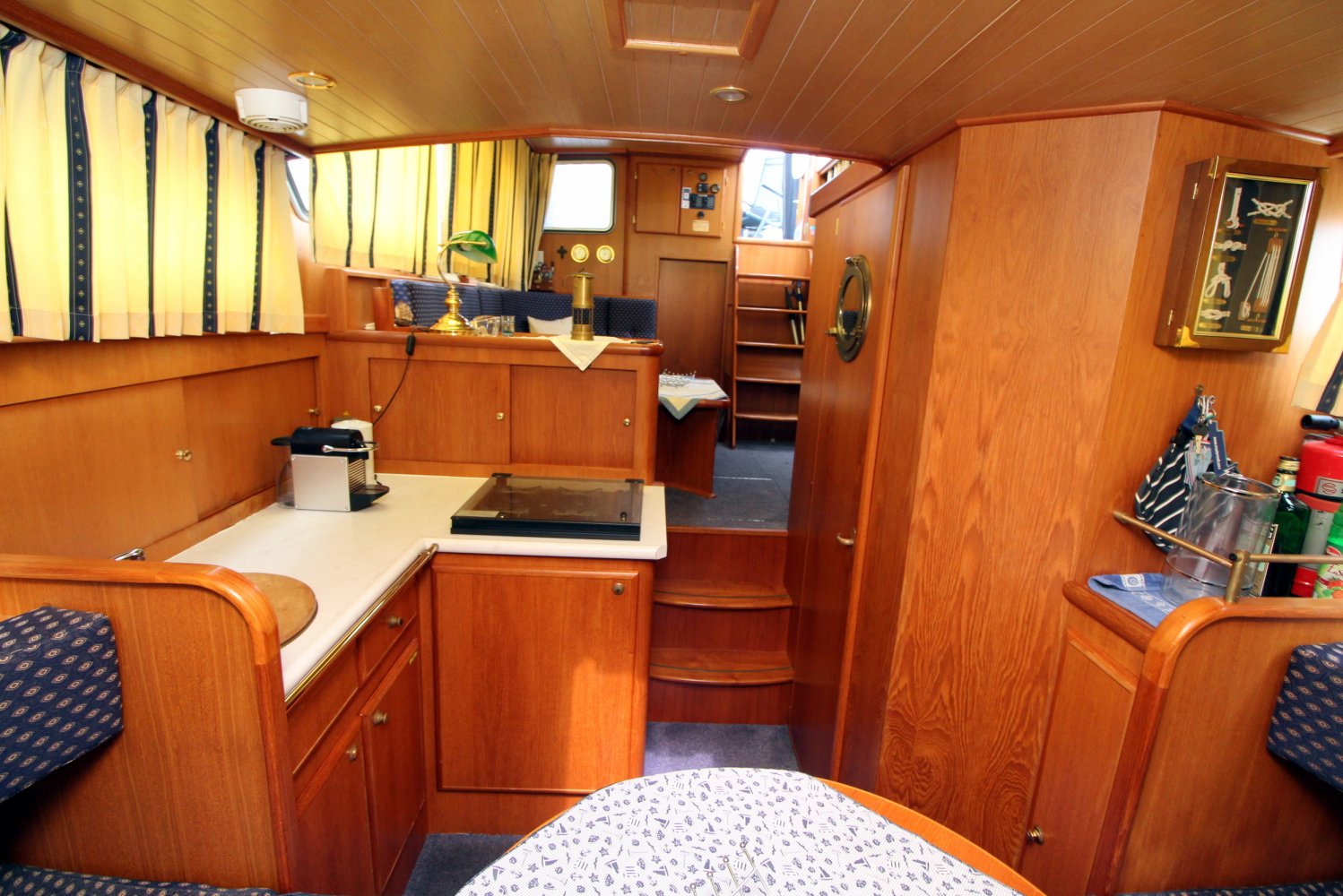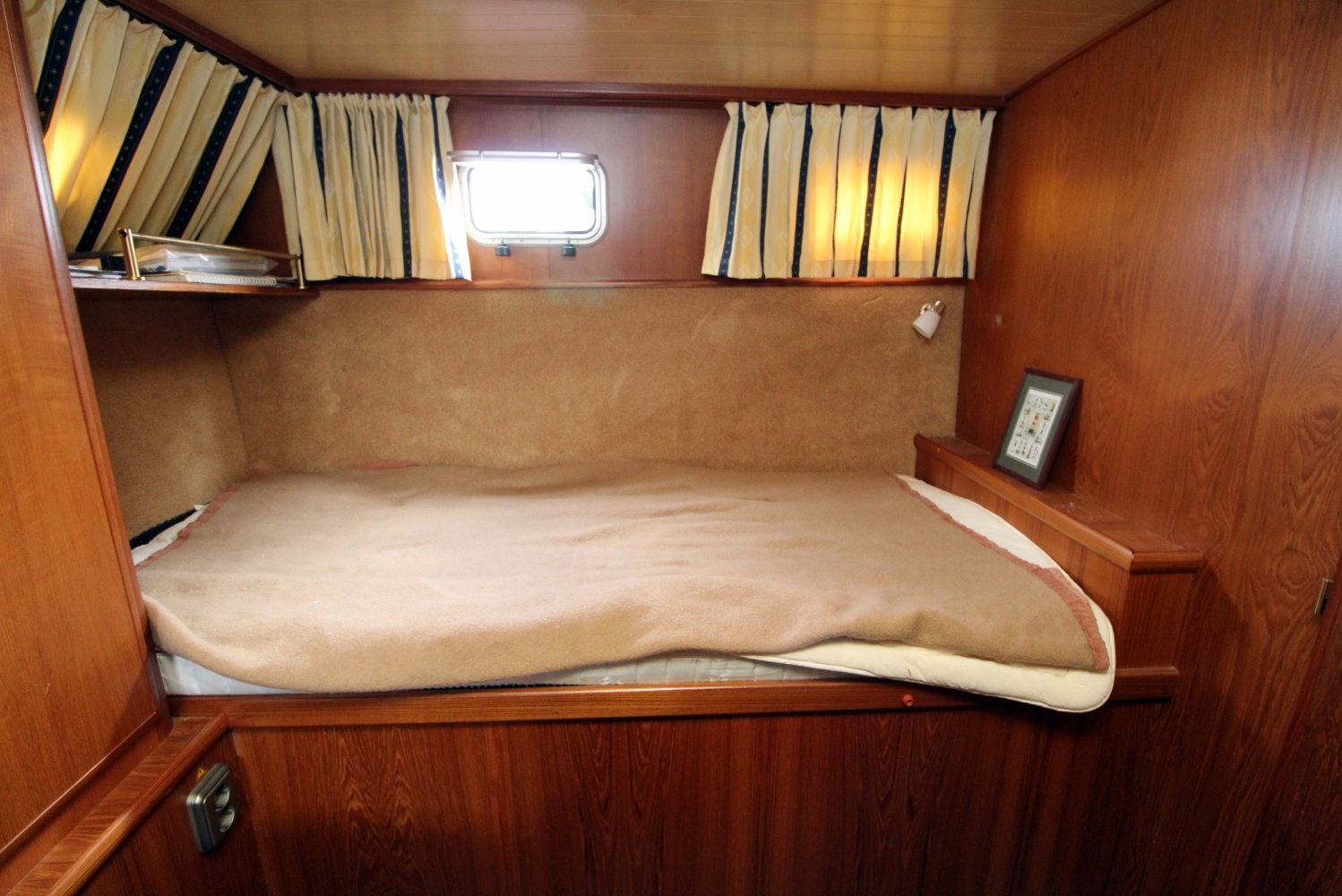 Dit ruime motorjacht heeft een warm houten interieur en gezellige leefruimtes. Door grote ramen in de salon valt heerlijk veel licht naar binnen, hetgeen een ruime uitstraling en een aangename atmosfeer geeft. De kombuis is compact en praktisch van indeling met in de punt een comfortabele rondzit. In het vooronder is tevens de natte cel gesitueerd met een wastafel, toilet en een douche. De eigenaars hut treft u in het achterschip aan, waar u een 2 persoons bed plus een 1 persoons bed tot uw beschikking heeft. Verder is deze Aquanaut Beauty 950 AK voorzien van voldoende kast -en bergruimte voor persoonlijke spullen.