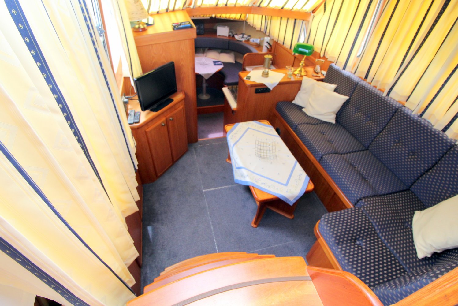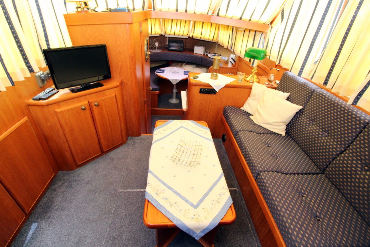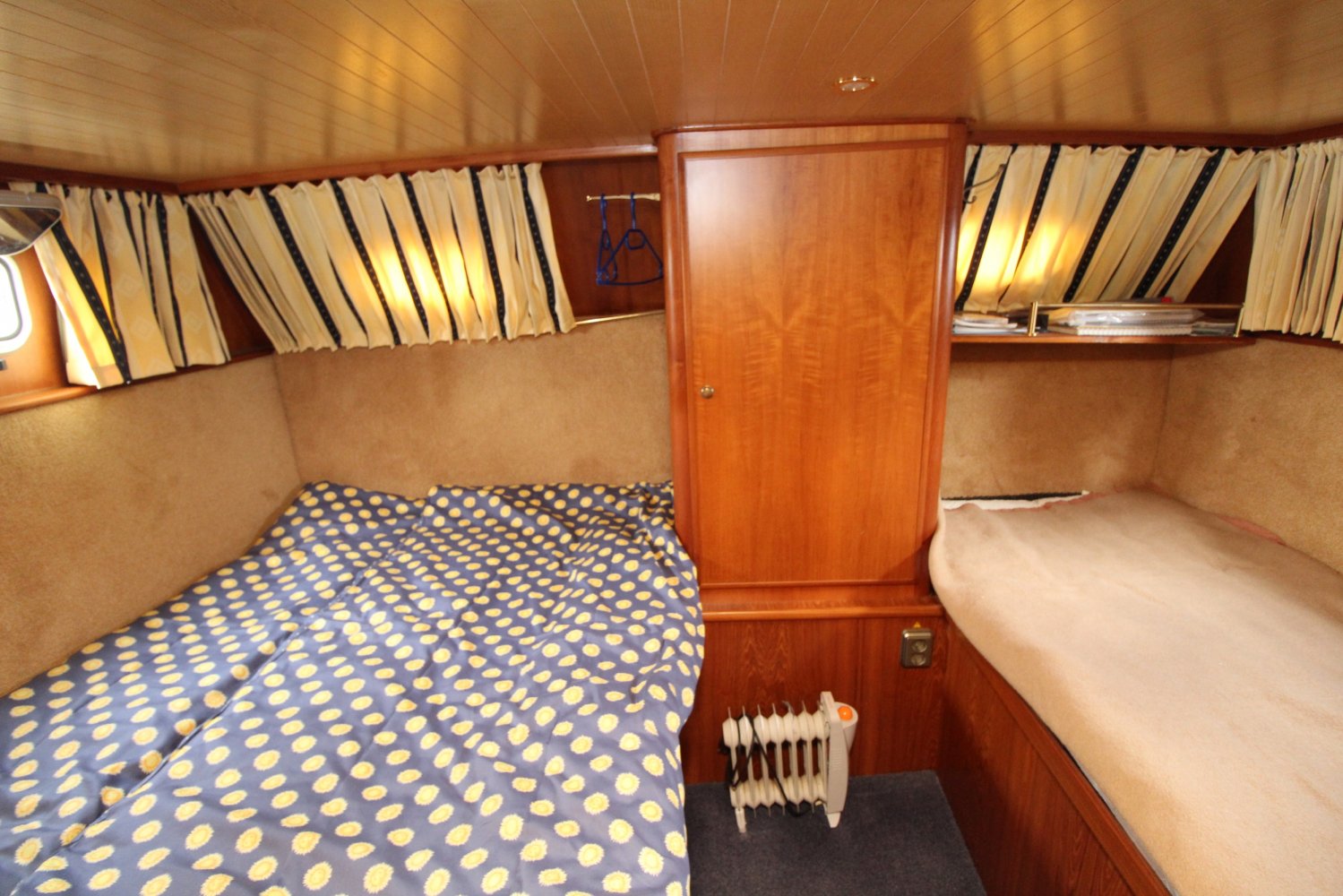 Dit ruime motorjacht heeft een warm houten interieur en gezellige leefruimtes. Door grote ramen in de salon valt heerlijk veel licht naar binnen, hetgeen een ruime uitstraling en een aangename atmosfeer geeft. De kombuis is compact en praktisch van indeling met in de punt een comfortabele rondzit. In het vooronder is tevens de natte cel gesitueerd met een wastafel, toilet en een douche. De eigenaars hut treft u in het achterschip aan, waar u een 2 persoons bed plus een 1 persoons bed tot uw beschikking heeft. Verder is deze Aquanaut Beauty 950 AK voorzien van voldoende kast -en bergruimte voor persoonlijke spullen.