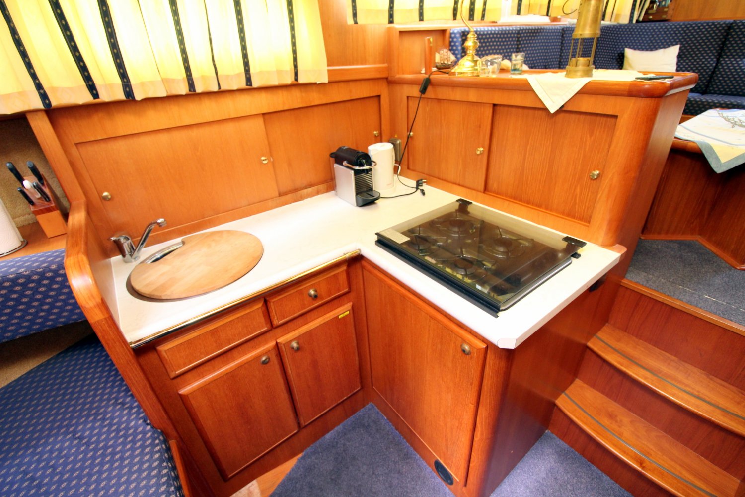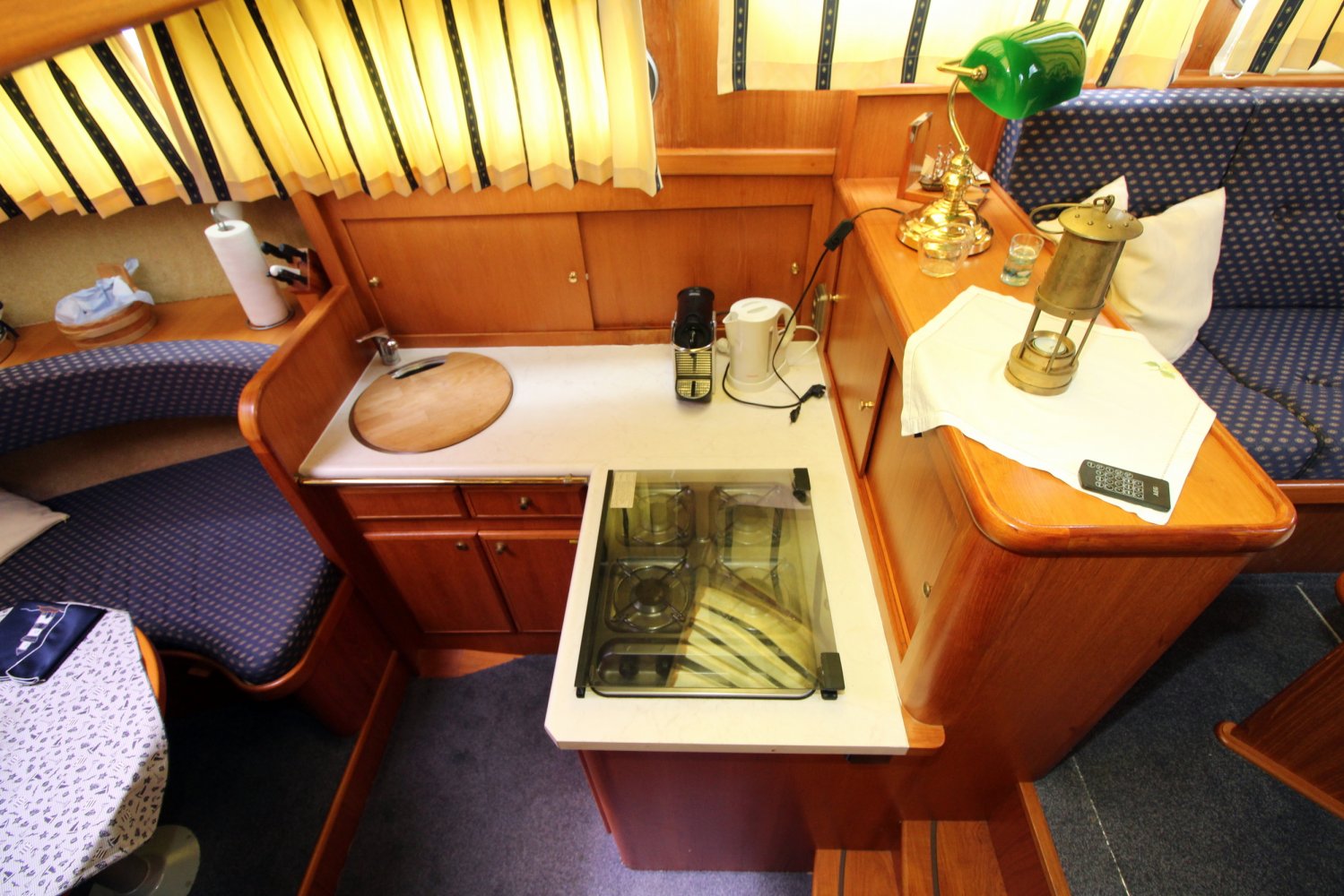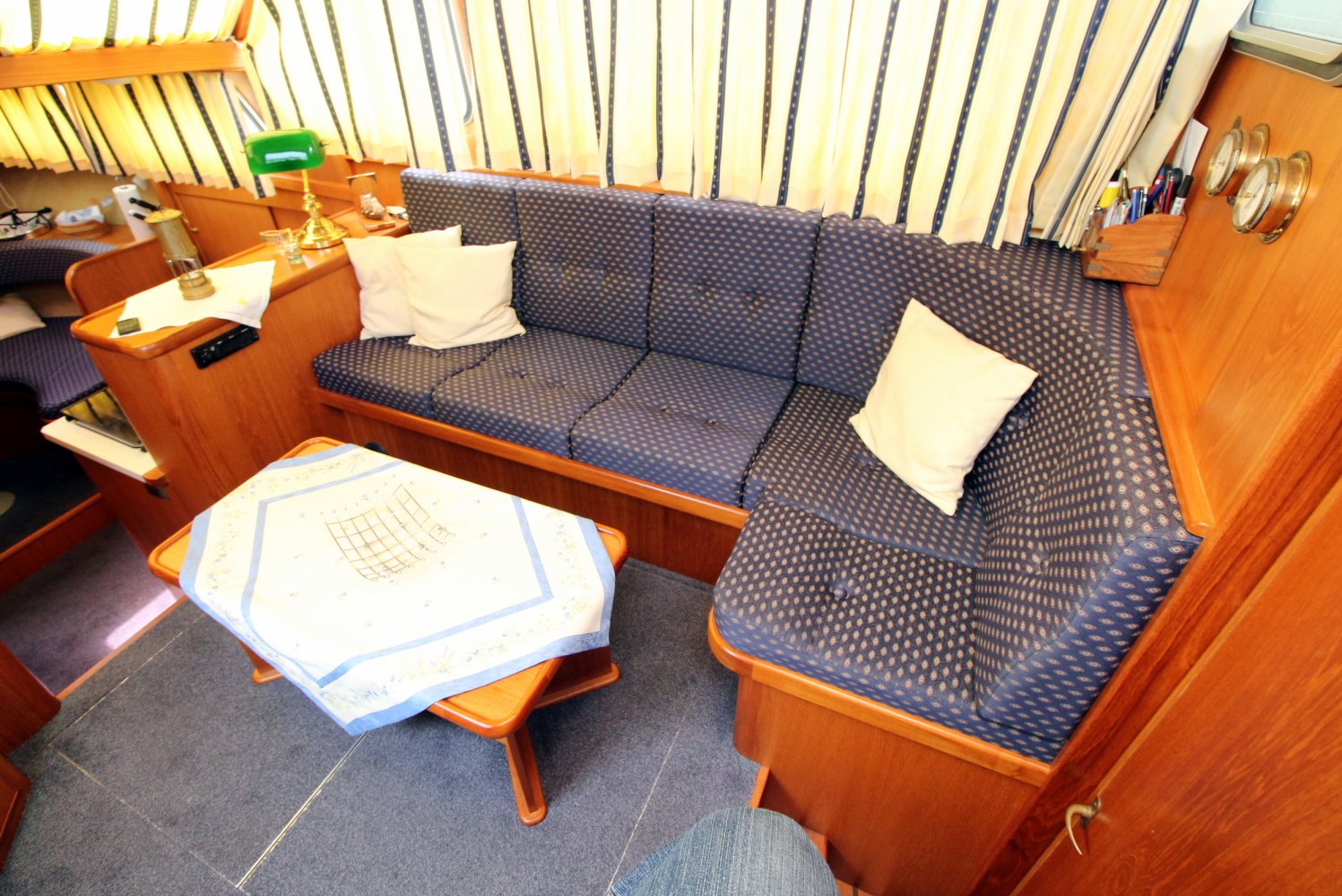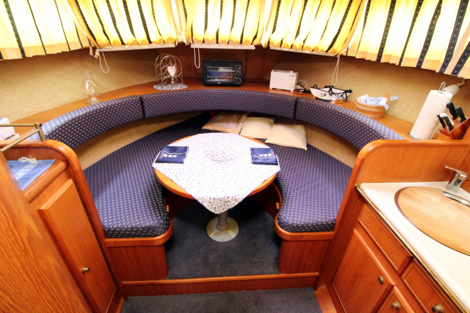 Dit ruime motorjacht heeft een warm houten interieur en gezellige leefruimtes. Door grote ramen in de salon valt heerlijk veel licht naar binnen, hetgeen een ruime uitstraling en een aangename atmosfeer geeft. De kombuis is compact en praktisch van indeling met in de punt een comfortabele rondzit. In het vooronder is tevens de natte cel gesitueerd met een wastafel, toilet en een douche. De eigenaars hut treft u in het achterschip aan, waar u een 2 persoons bed plus een 1 persoons bed tot uw beschikking heeft. Verder is deze Aquanaut Beauty 950 AK voorzien van voldoende kast -en bergruimte voor persoonlijke spullen.