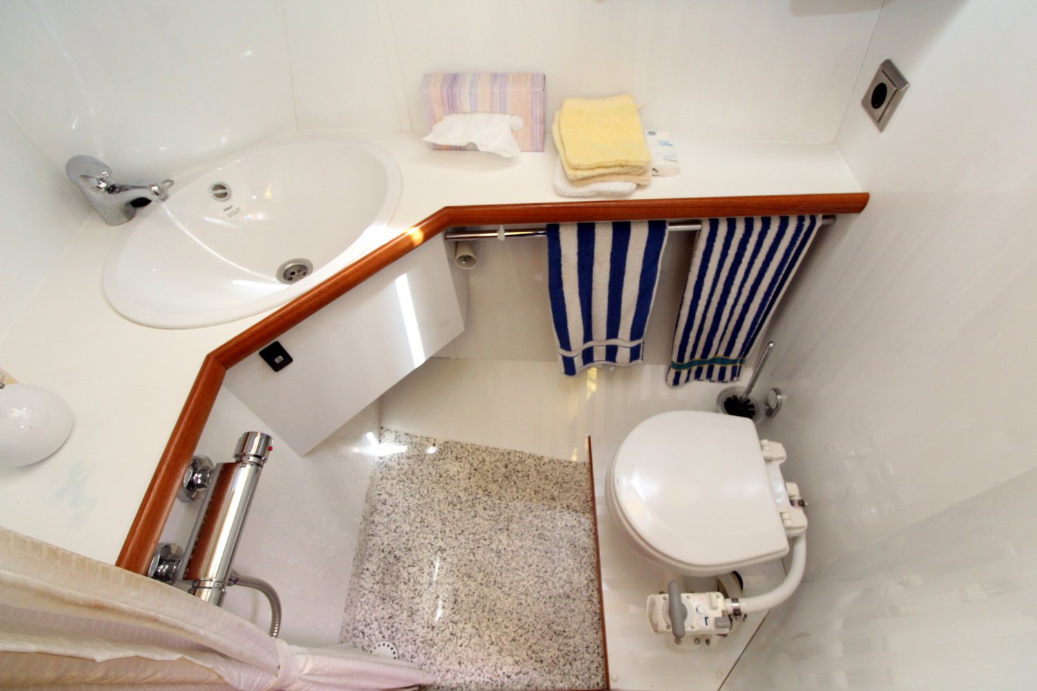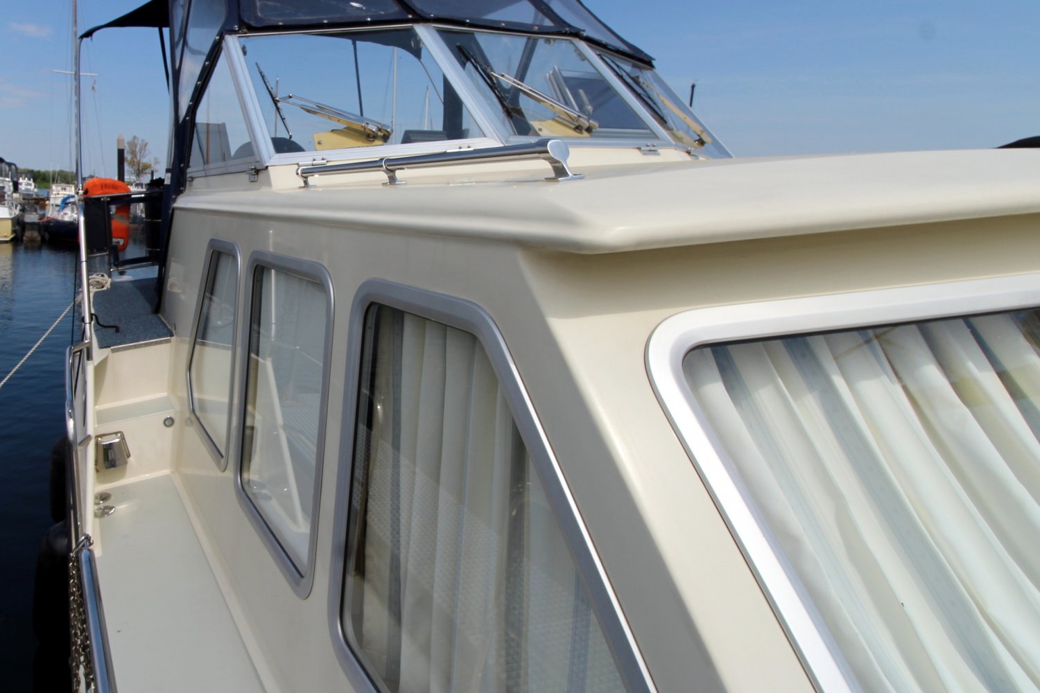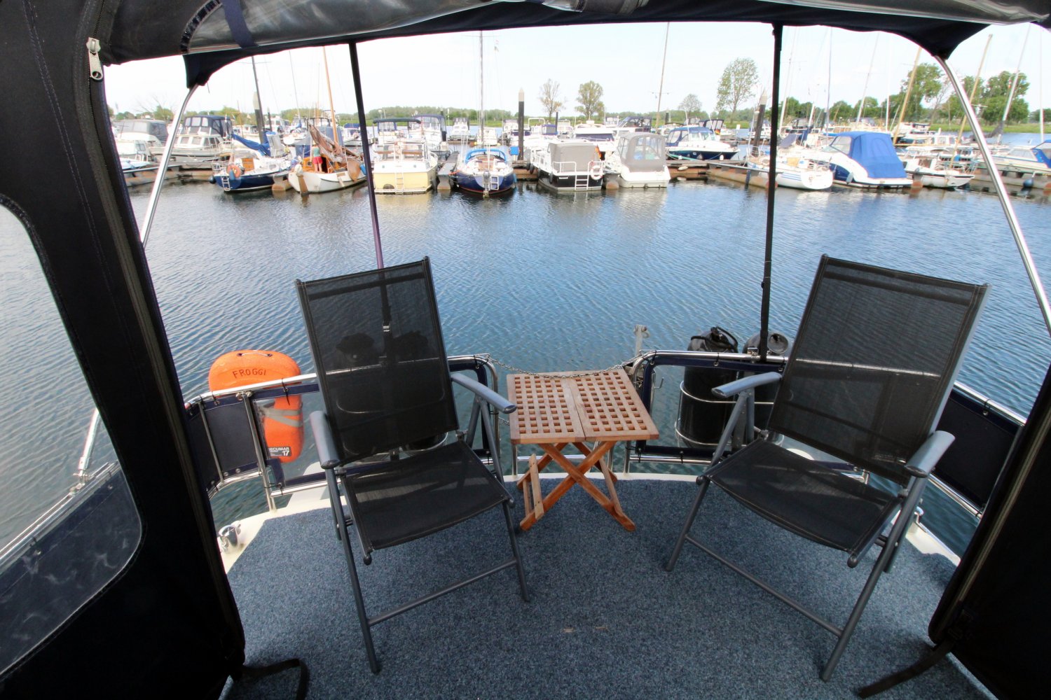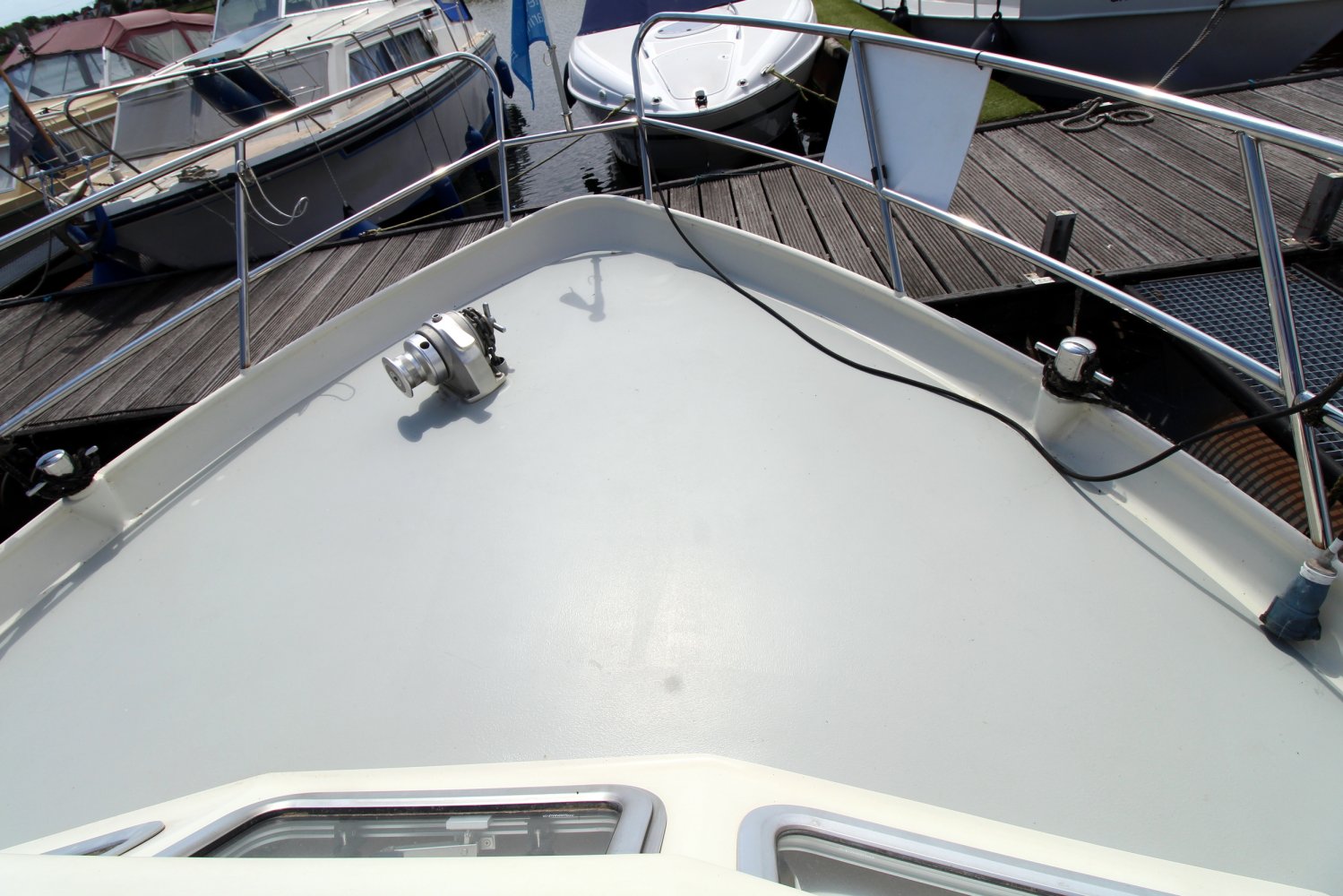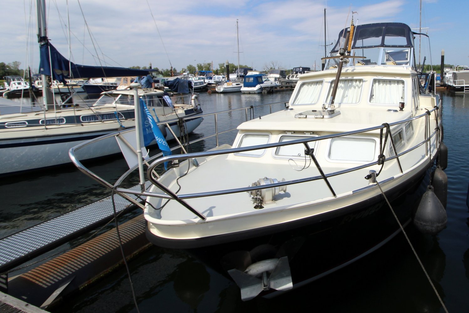 Brede gangboorden met een hoge reling zorgen ervoor dat men zich aan boord van deze Aquanaut Beauty 950 AK veilig over het schip kan bewegen. Het achterdek biedt voldoende plaats aan u en uw gasten om van het mooie buitenleven te genieten. Vanaf de hier eveneens gelegen stuurstand heeft men een goed overzicht op het schip en de omgeving.