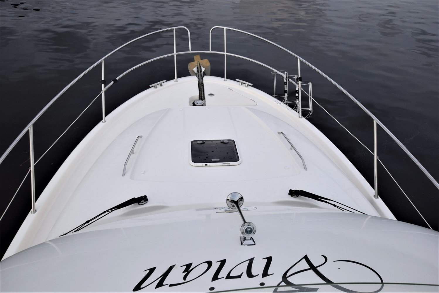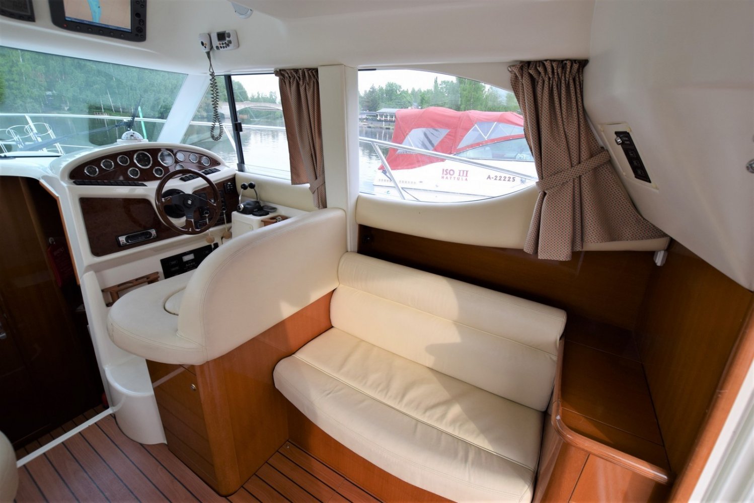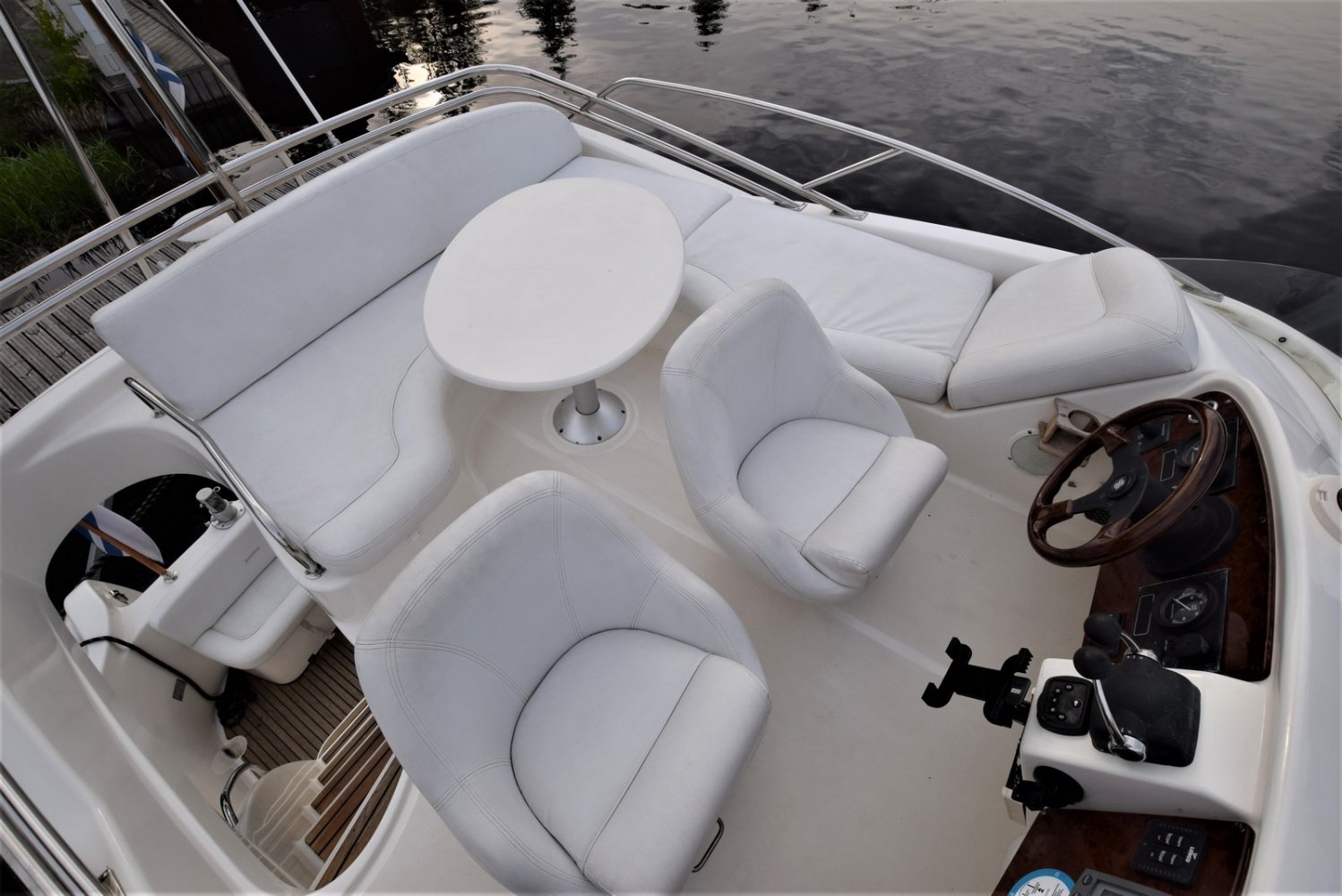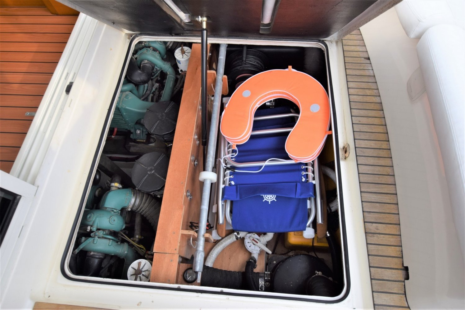 Koelkast Micro Fornuis Plotter Radar VHF Diepte Boegschroef Elektrische ankerlier Elektrische gashendels Flybridge afdekzeil (lelijk maar niet kapot) Stereo TV Eberspächer verwarming Ontdooier/verwarming via motoren Warm water via walstroom + motoren Teak op zwemplateau + cockpit Besenzoni davits
