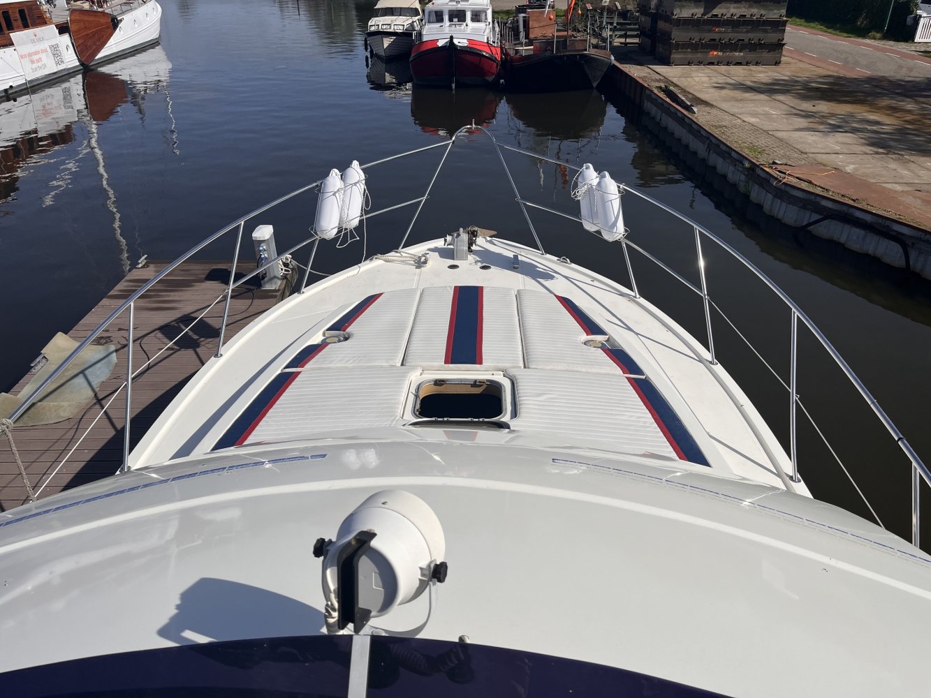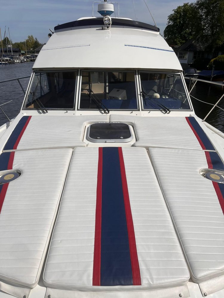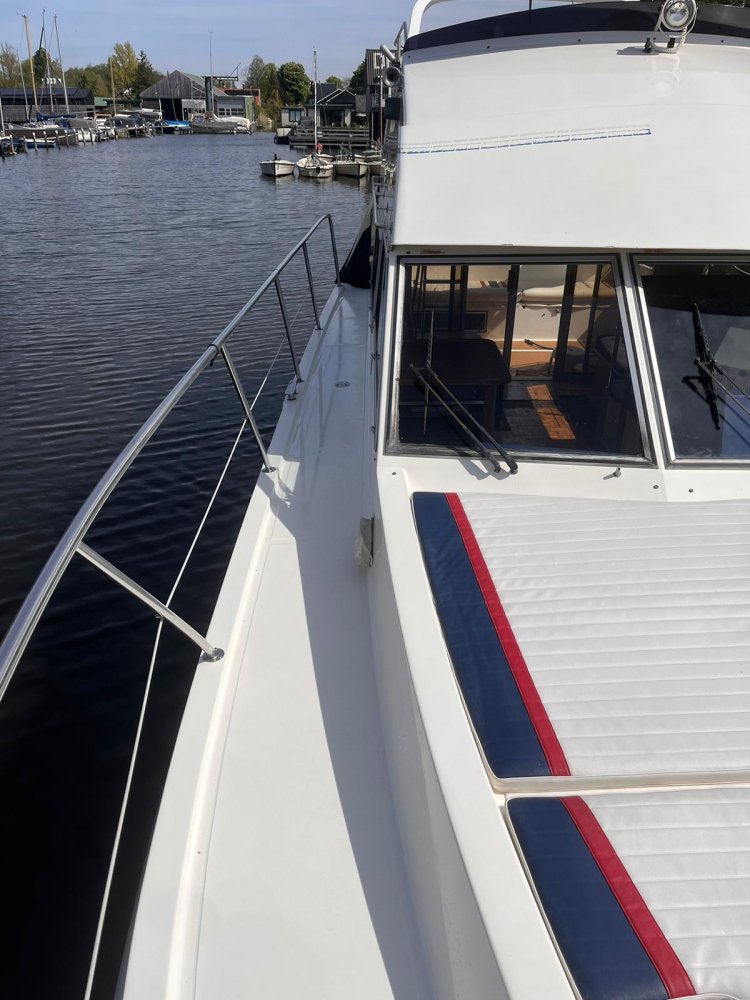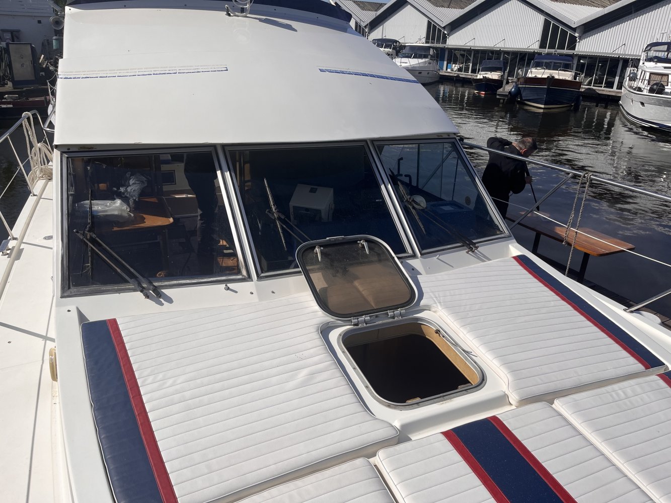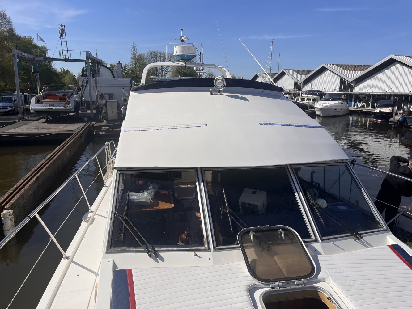 De FlyBridge. Bovenop voel je bijzonder goed het schip aan. Samen met de twee motoren en nog een boegschroef kun je zeer gemakkelijk manoeuvreren. Aanleggen /aanmeren is kinderspel. De twee grote zware krachtbronnen (Volvo's)  zijn zeer betrouwbaar en heel goed onderhouden. Gelukkig worden de motoren aangestuurd door alleen twee gashendels en niet door een extra set hendels voor de keerkoppeling. Op deze manier kunt u eenvoudig sturen met alleen de gashendels te gebruiken. Dit model heeft boven op de flybridge een mooie brede bestuurdersbank, extra speakers, en extra bekerhouders. Ook is er een extra zithoek uit te breiden tot lig/hoekbank aanwezig op de flybridge. Het dashboard van de flybridge is ruim, het stuur zit goed in het midden, en het geheel geeft u een goed overzicht over de gehele boot. De radarbeugel geeft de boot extra uitstraling. Er is een mooi zwaar gegalvaniseerd anker aanwezig met de elektrische voetschakelaars. De gehele opbouw is mooi voorzien van een stevige zeerailing en veel veiligheids handgrepen. Ook de zeerailing is overal nog mooi recht en niet verbogen. Het schip heeft ook nog een zoek licht. De anti-reflex zonnescherm rand van plexiglas is nog geheel intact en onbeschadigd. Er zijn nog diverse navigatiesystemen aanwezig.
