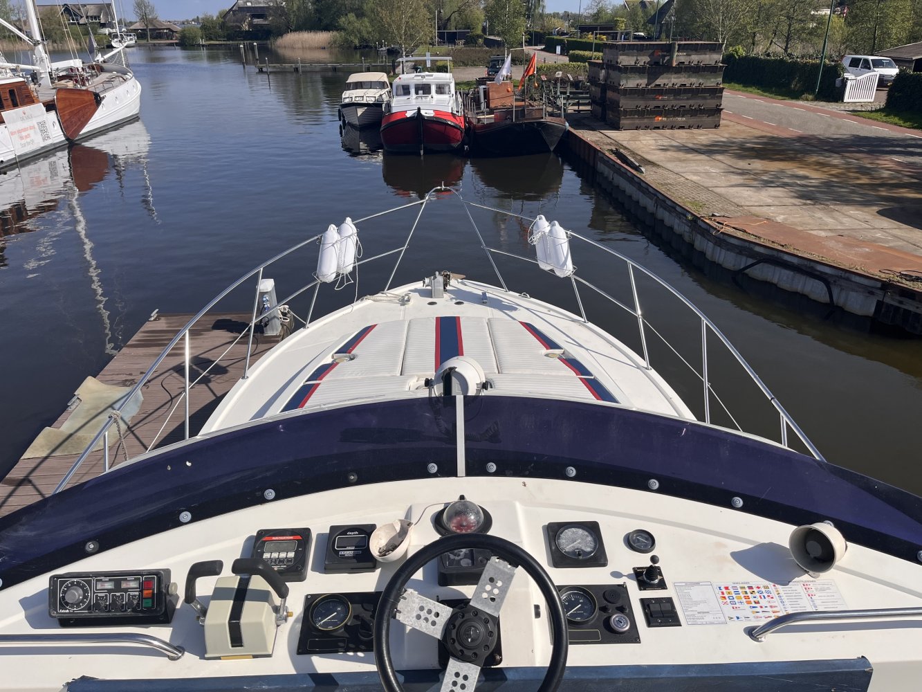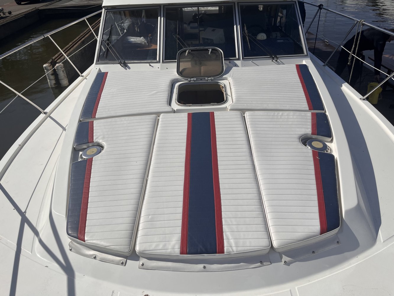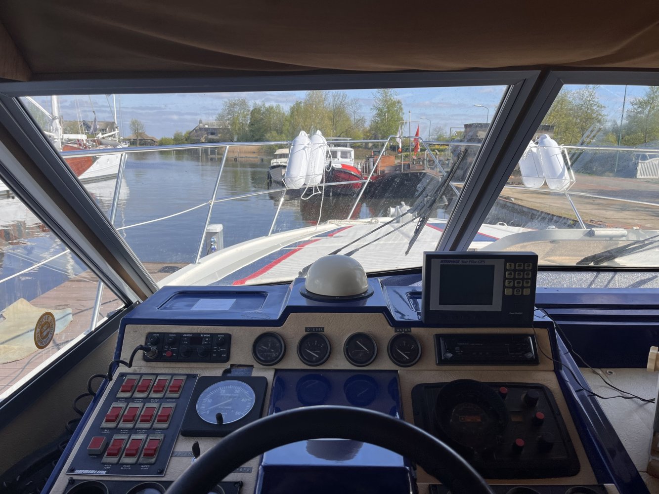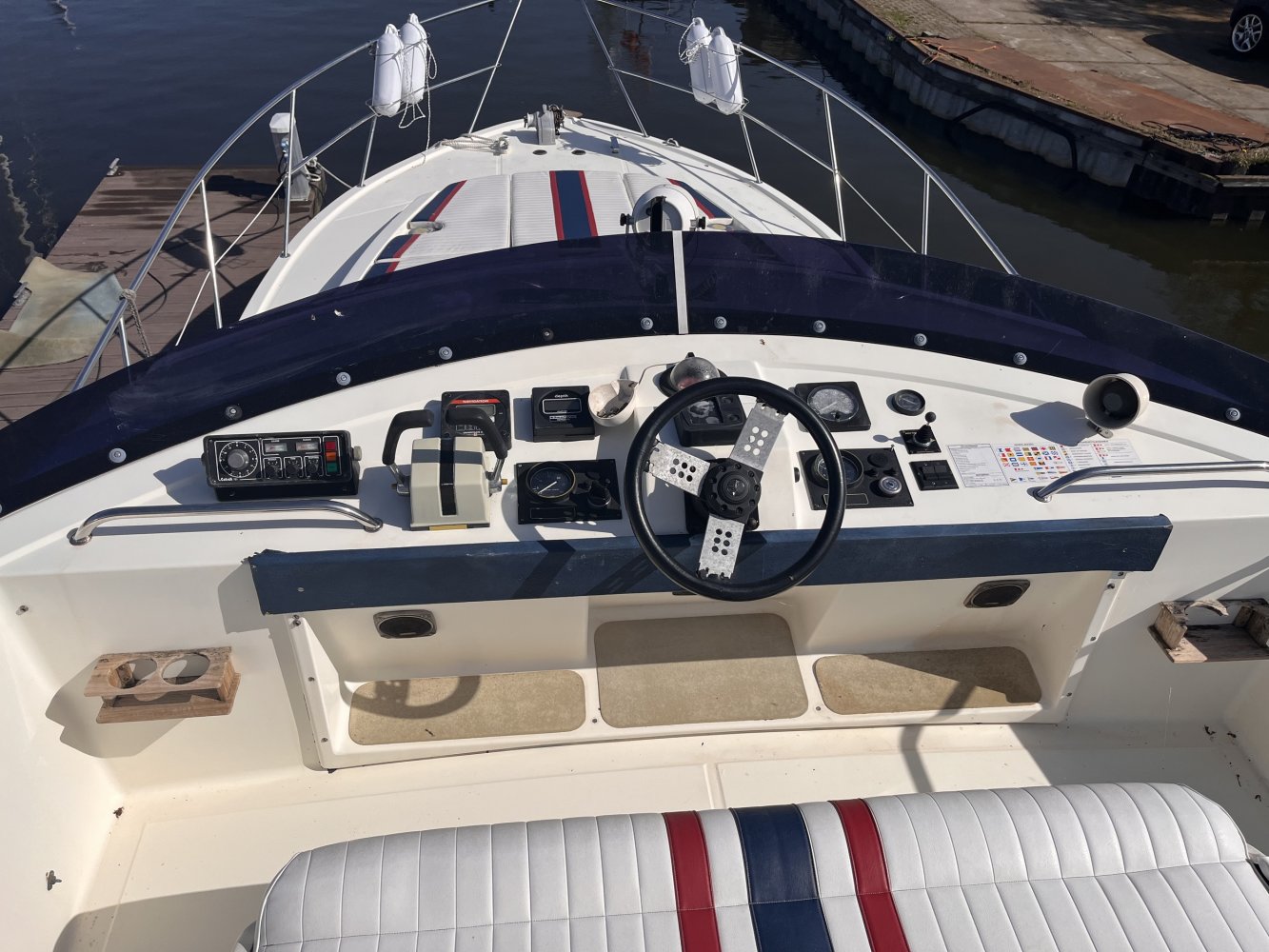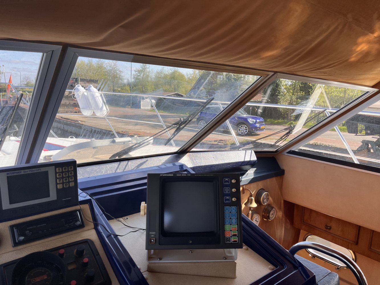 De FlyBridge. Bovenop voel je bijzonder goed het schip aan. Samen met de twee motoren en nog een boegschroef kun je zeer gemakkelijk manoeuvreren. Aanleggen /aanmeren is kinderspel. De twee grote zware krachtbronnen (Volvo's)  zijn zeer betrouwbaar en heel goed onderhouden. Gelukkig worden de motoren aangestuurd door alleen twee gashendels en niet door een extra set hendels voor de keerkoppeling. Op deze manier kunt u eenvoudig sturen met alleen de gashendels te gebruiken. Dit model heeft boven op de flybridge een mooie brede bestuurdersbank, extra speakers, en extra bekerhouders. Ook is er een extra zithoek uit te breiden tot lig/hoekbank aanwezig op de flybridge. Het dashboard van de flybridge is ruim, het stuur zit goed in het midden, en het geheel geeft u een goed overzicht over de gehele boot. De radarbeugel geeft de boot extra uitstraling. Er is een mooi zwaar gegalvaniseerd anker aanwezig met de elektrische voetschakelaars. De gehele opbouw is mooi voorzien van een stevige zeerailing en veel veiligheids handgrepen. Ook de zeerailing is overal nog mooi recht en niet verbogen. Het schip heeft ook nog een zoek licht. De anti-reflex zonnescherm rand van plexiglas is nog geheel intact en onbeschadigd. Er zijn nog diverse navigatiesystemen aanwezig.