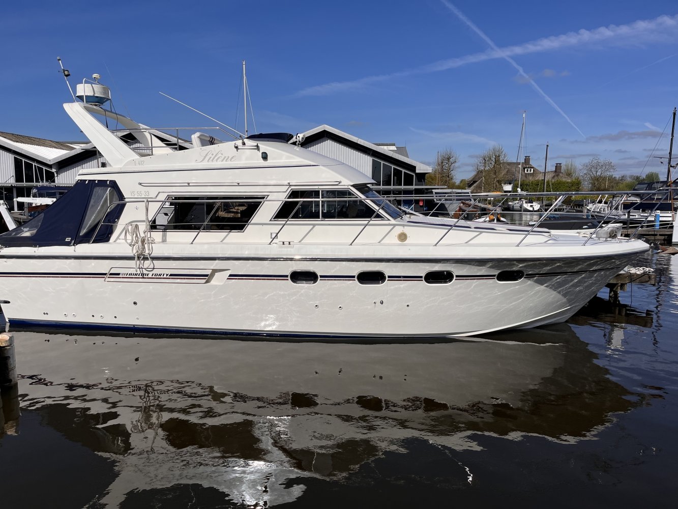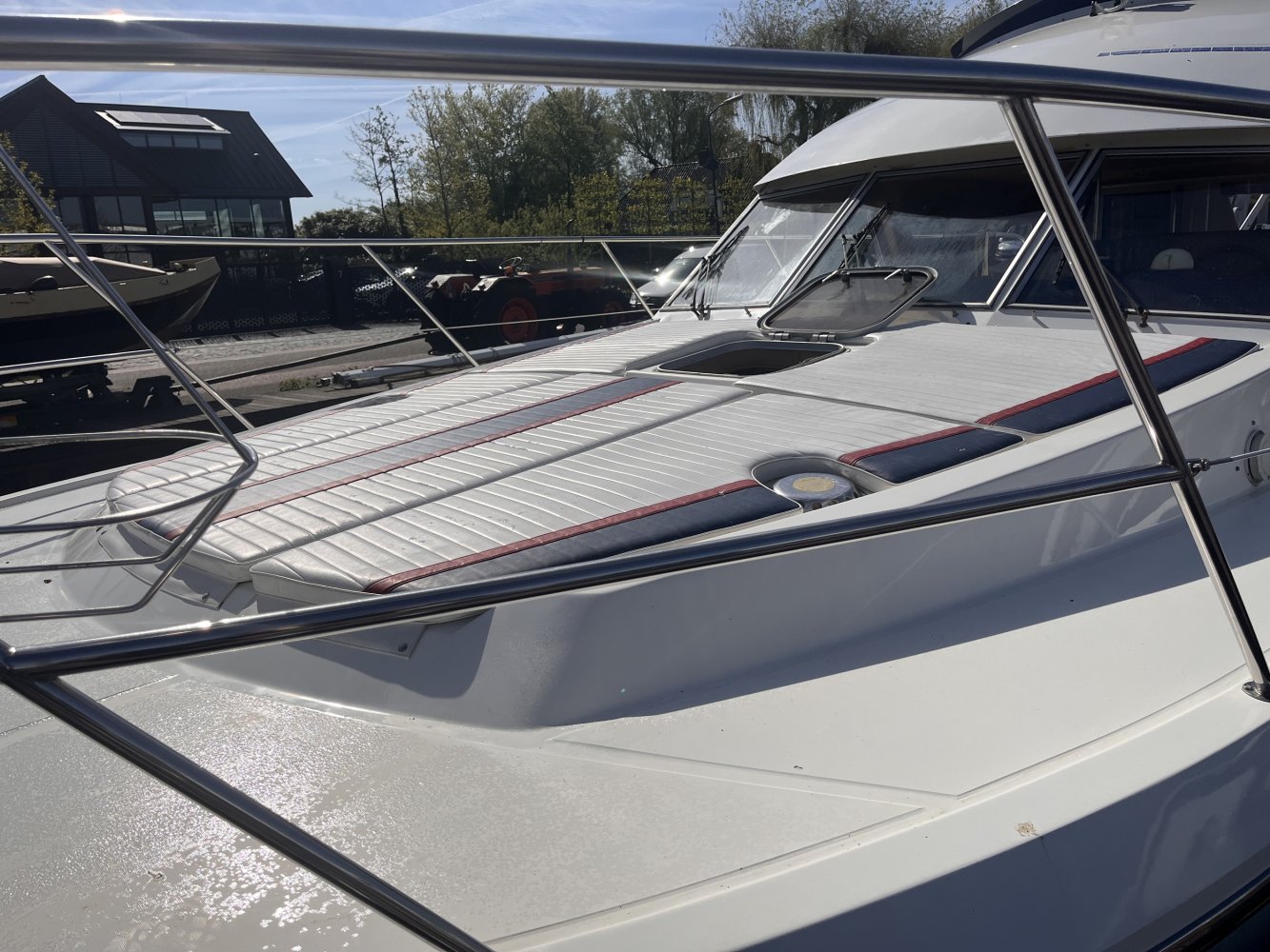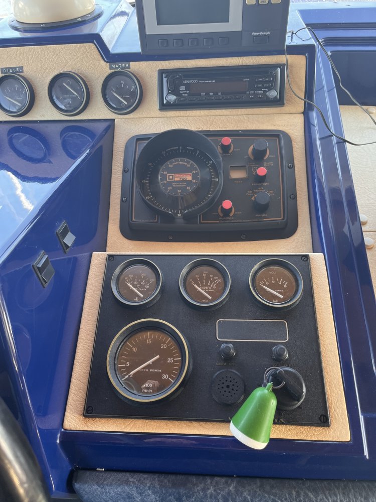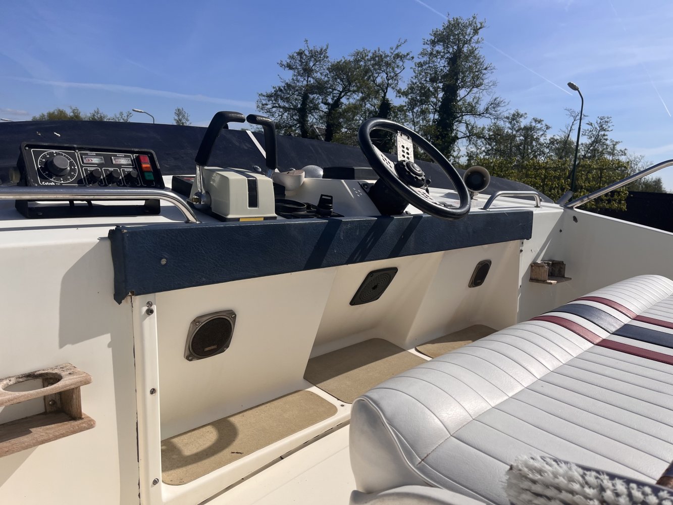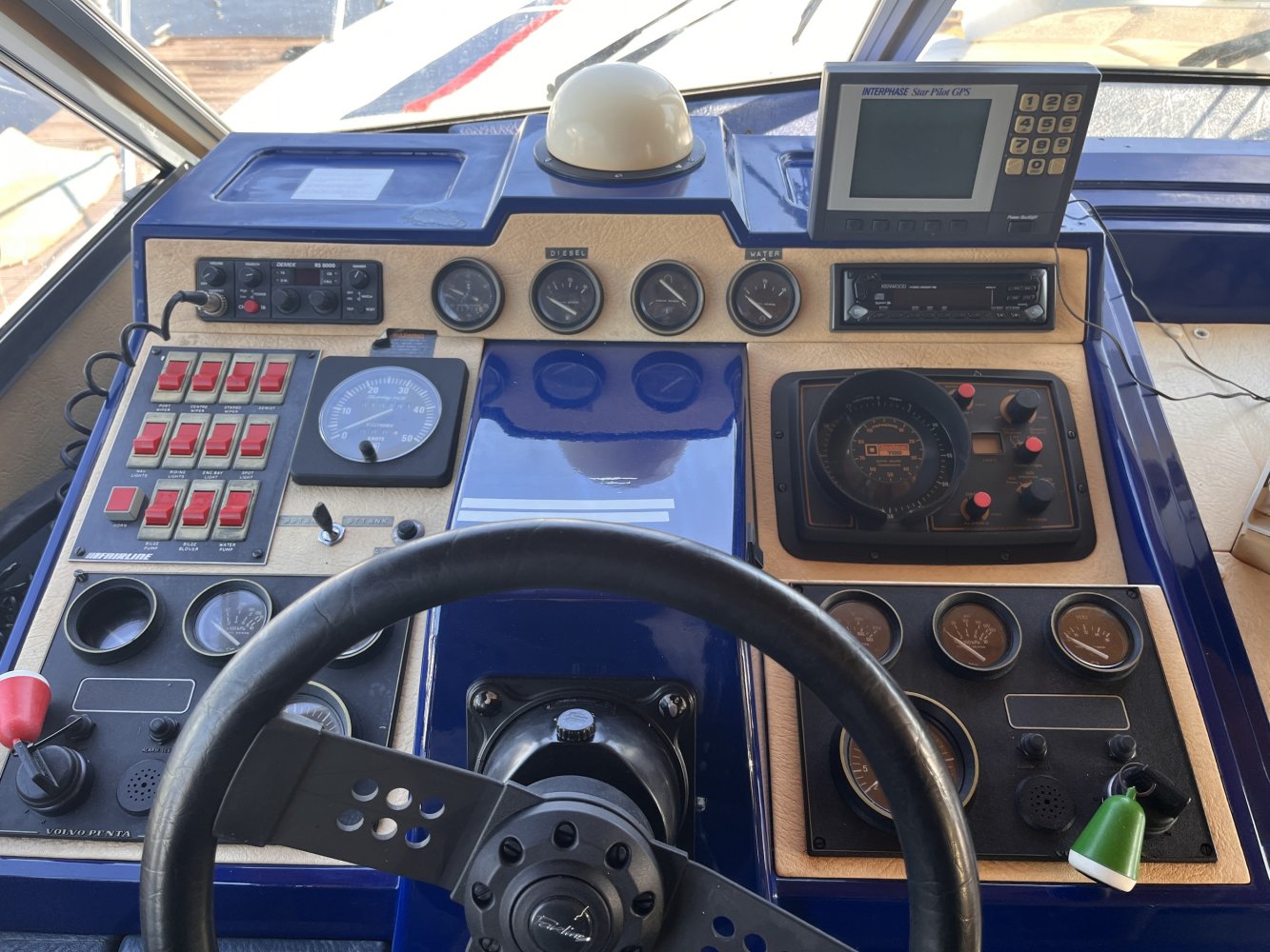 De FlyBridge. Bovenop voel je bijzonder goed het schip aan. Samen met de twee motoren en nog een boegschroef kun je zeer gemakkelijk manoeuvreren. Aanleggen /aanmeren is kinderspel. De twee grote zware krachtbronnen (Volvo's)  zijn zeer betrouwbaar en heel goed onderhouden. Gelukkig worden de motoren aangestuurd door alleen twee gashendels en niet door een extra set hendels voor de keerkoppeling. Op deze manier kunt u eenvoudig sturen met alleen de gashendels te gebruiken. Dit model heeft boven op de flybridge een mooie brede bestuurdersbank, extra speakers, en extra bekerhouders. Ook is er een extra zithoek uit te breiden tot lig/hoekbank aanwezig op de flybridge. Het dashboard van de flybridge is ruim, het stuur zit goed in het midden, en het geheel geeft u een goed overzicht over de gehele boot. De radarbeugel geeft de boot extra uitstraling. Er is een mooi zwaar gegalvaniseerd anker aanwezig met de elektrische voetschakelaars. De gehele opbouw is mooi voorzien van een stevige zeerailing en veel veiligheids handgrepen. Ook de zeerailing is overal nog mooi recht en niet verbogen. Het schip heeft ook nog een zoek licht. De anti-reflex zonnescherm rand van plexiglas is nog geheel intact en onbeschadigd. Er zijn nog diverse navigatiesystemen aanwezig.