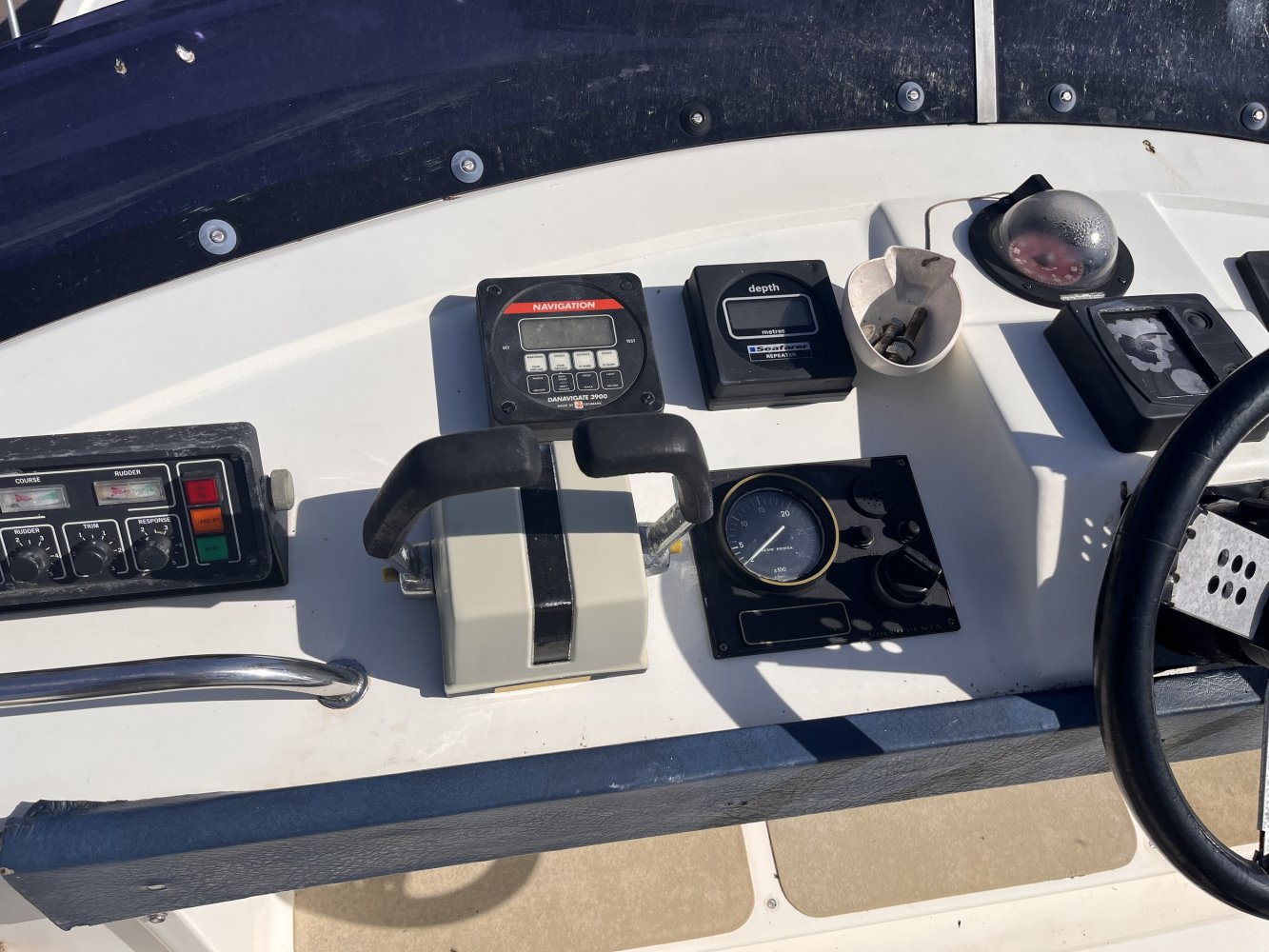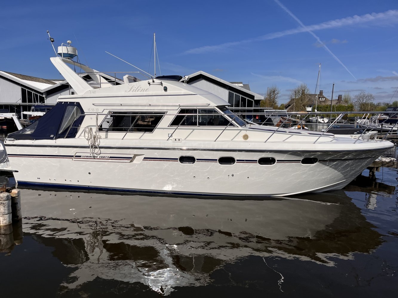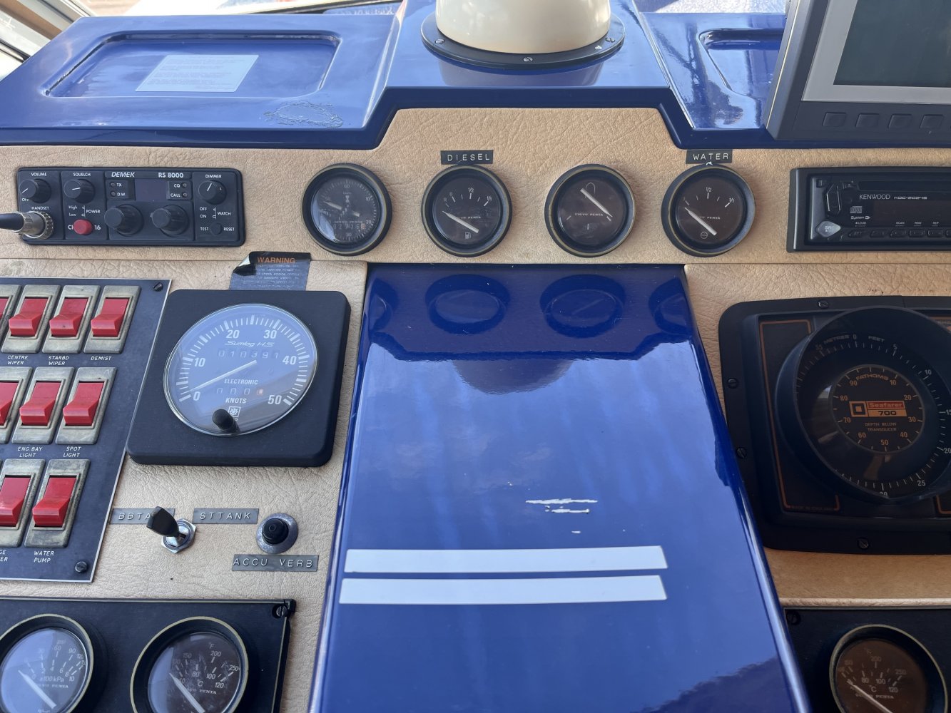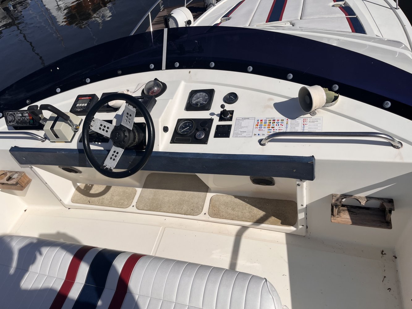 De FlyBridge. Bovenop voel je bijzonder goed het schip aan. Samen met de twee motoren en nog een boegschroef kun je zeer gemakkelijk manoeuvreren. Aanleggen /aanmeren is kinderspel. De twee grote zware krachtbronnen (Volvo's)  zijn zeer betrouwbaar en heel goed onderhouden. Gelukkig worden de motoren aangestuurd door alleen twee gashendels en niet door een extra set hendels voor de keerkoppeling. Op deze manier kunt u eenvoudig sturen met alleen de gashendels te gebruiken. Dit model heeft boven op de flybridge een mooie brede bestuurdersbank, extra speakers, en extra bekerhouders. Ook is er een extra zithoek uit te breiden tot lig/hoekbank aanwezig op de flybridge. Het dashboard van de flybridge is ruim, het stuur zit goed in het midden, en het geheel geeft u een goed overzicht over de gehele boot. De radarbeugel geeft de boot extra uitstraling. Er is een mooi zwaar gegalvaniseerd anker aanwezig met de elektrische voetschakelaars. De gehele opbouw is mooi voorzien van een stevige zeerailing en veel veiligheids handgrepen. Ook de zeerailing is overal nog mooi recht en niet verbogen. Het schip heeft ook nog een zoek licht. De anti-reflex zonnescherm rand van plexiglas is nog geheel intact en onbeschadigd. Er zijn nog diverse navigatiesystemen aanwezig.