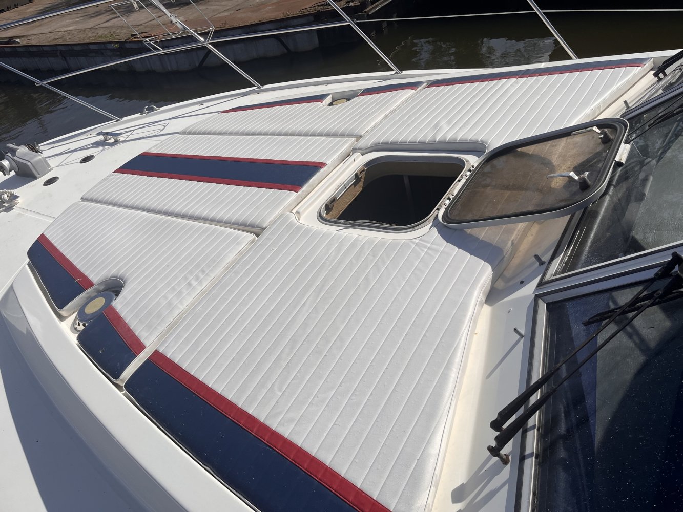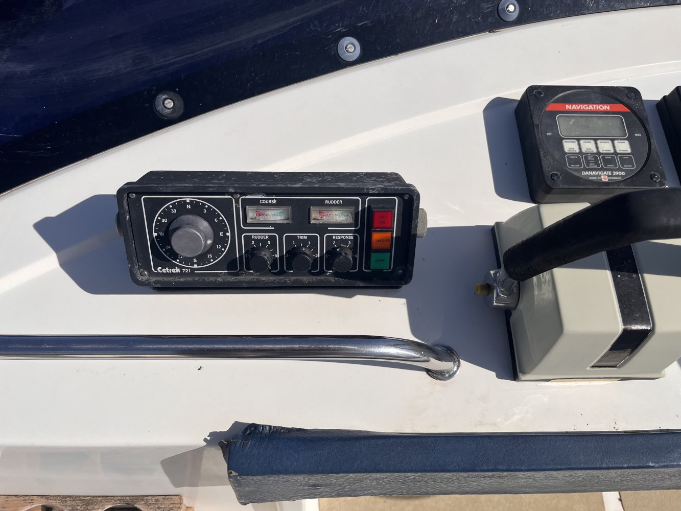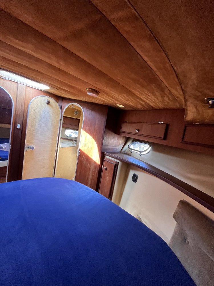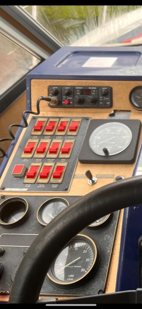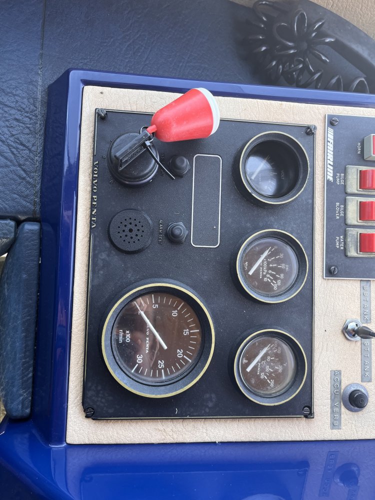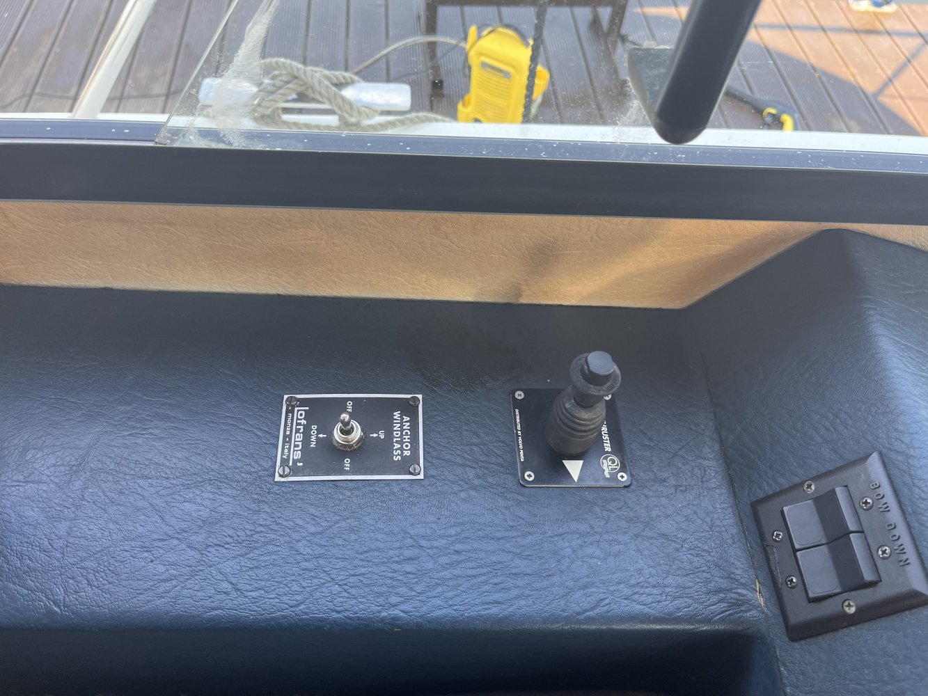 De FlyBridge. Bovenop voel je bijzonder goed het schip aan. Samen met de twee motoren en nog een boegschroef kun je zeer gemakkelijk manoeuvreren. Aanleggen /aanmeren is kinderspel. De twee grote zware krachtbronnen (Volvo's)  zijn zeer betrouwbaar en heel goed onderhouden. Gelukkig worden de motoren aangestuurd door alleen twee gashendels en niet door een extra set hendels voor de keerkoppeling. Op deze manier kunt u eenvoudig sturen met alleen de gashendels te gebruiken. Dit model heeft boven op de flybridge een mooie brede bestuurdersbank, extra speakers, en extra bekerhouders. Ook is er een extra zithoek uit te breiden tot lig/hoekbank aanwezig op de flybridge. Het dashboard van de flybridge is ruim, het stuur zit goed in het midden, en het geheel geeft u een goed overzicht over de gehele boot. De radarbeugel geeft de boot extra uitstraling. Er is een mooi zwaar gegalvaniseerd anker aanwezig met de elektrische voetschakelaars. De gehele opbouw is mooi voorzien van een stevige zeerailing en veel veiligheids handgrepen. Ook de zeerailing is overal nog mooi recht en niet verbogen. Het schip heeft ook nog een zoek licht. De anti-reflex zonnescherm rand van plexiglas is nog geheel intact en onbeschadigd. Er zijn nog diverse navigatiesystemen aanwezig.