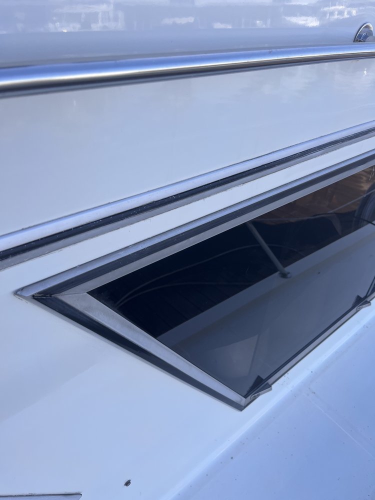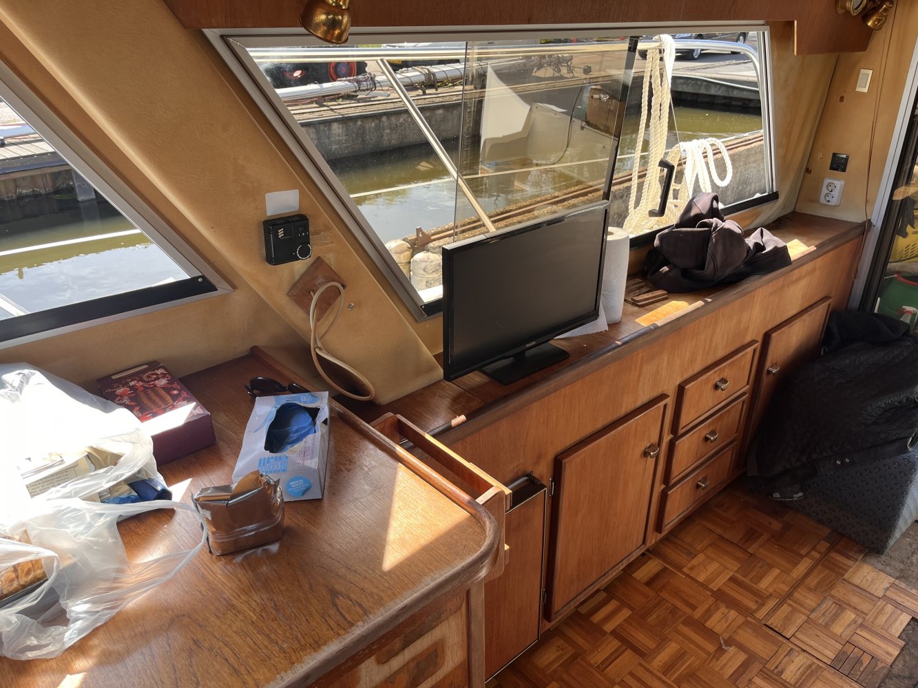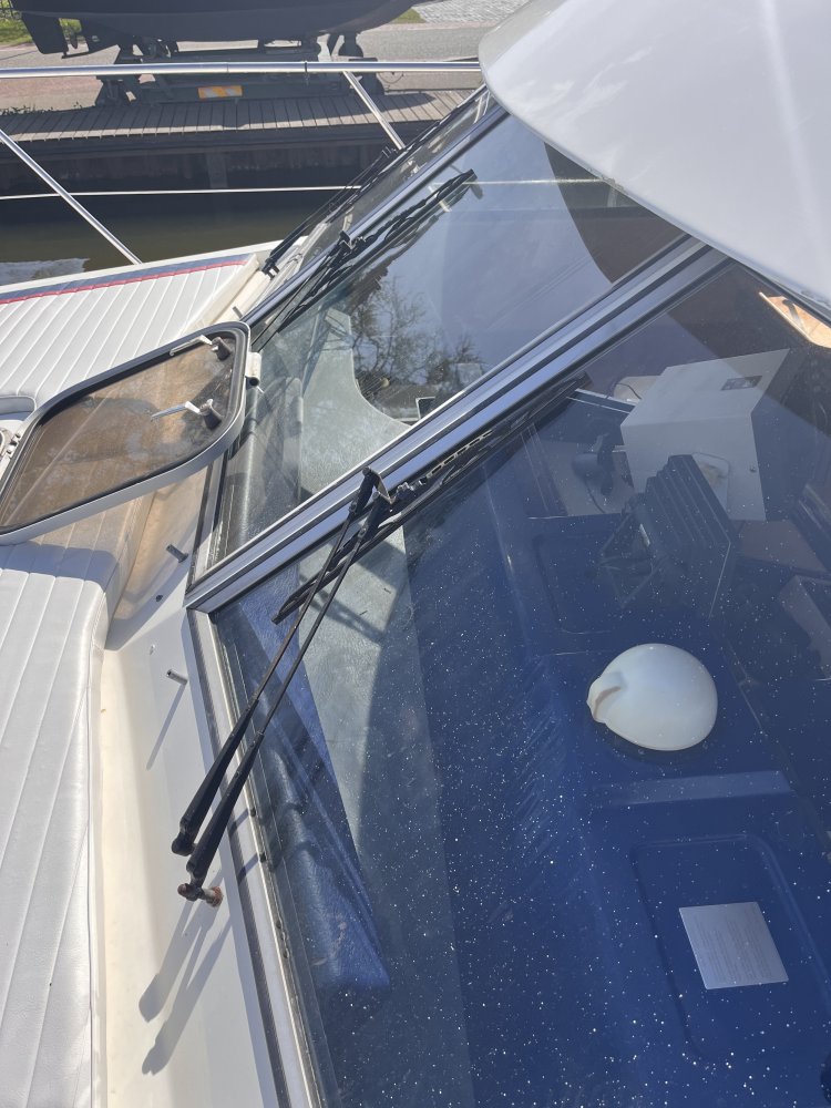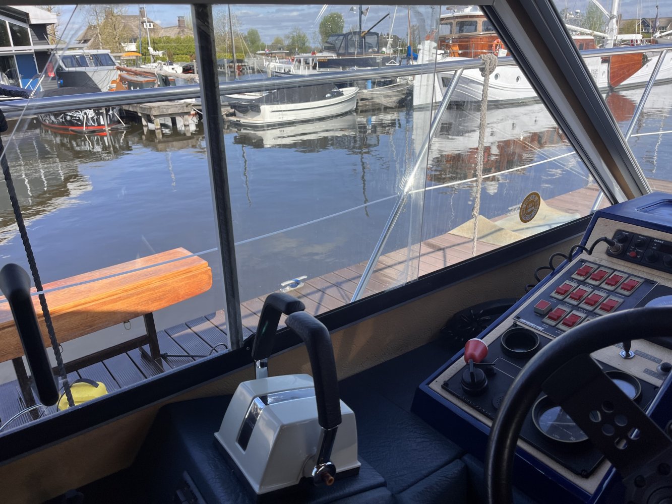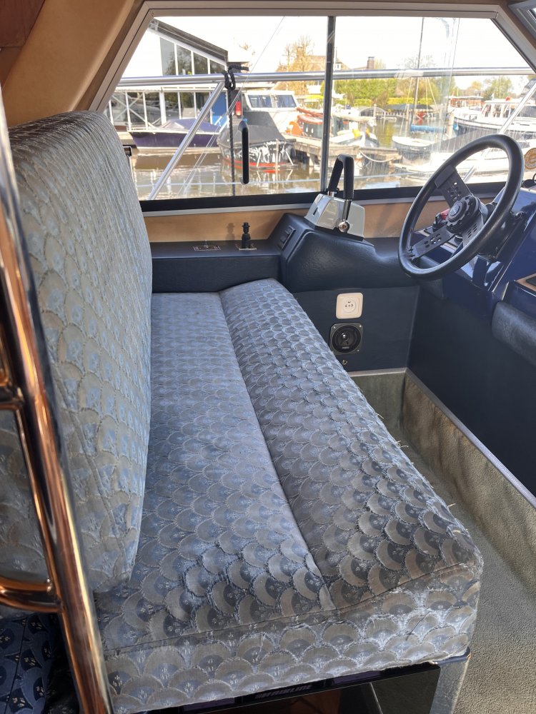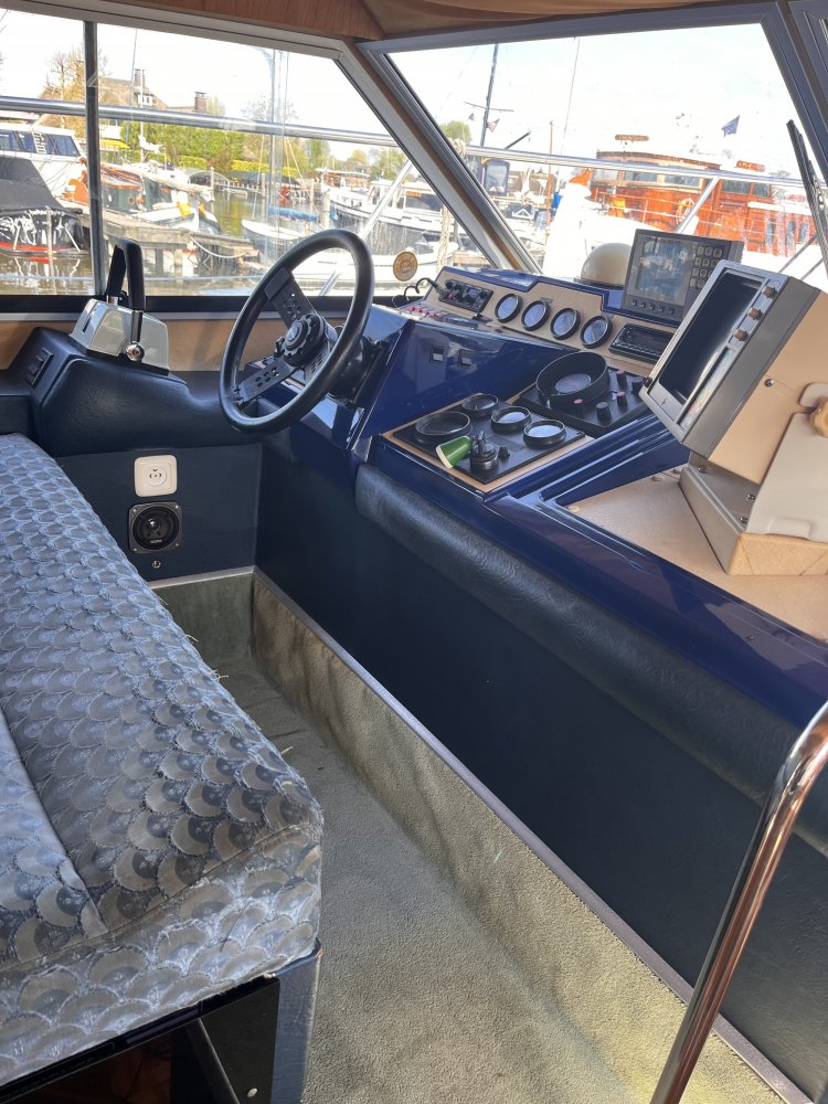 Alle aluminium ramen zijn nog in bijzonder goede staat en de rubbers zijn nog mooi en er zijn ook geen tekenen waterschade’s. Zowel op het voordek als op het zwemplateau zijn er mooie extra RVS fender houders geplaatst. Door de glazen schuifdeuren komt u binnen in de salon. Hier valt meteen de mooie breedte op van de boot. Er is een ruime salonbank in L vorm en een grote salontafel in deze salon. De stuurstand is dus zeer uitgebreid en biedt ook plaats voor medepassagiers, dus samen varen is in dit schip hartstikke leuk.