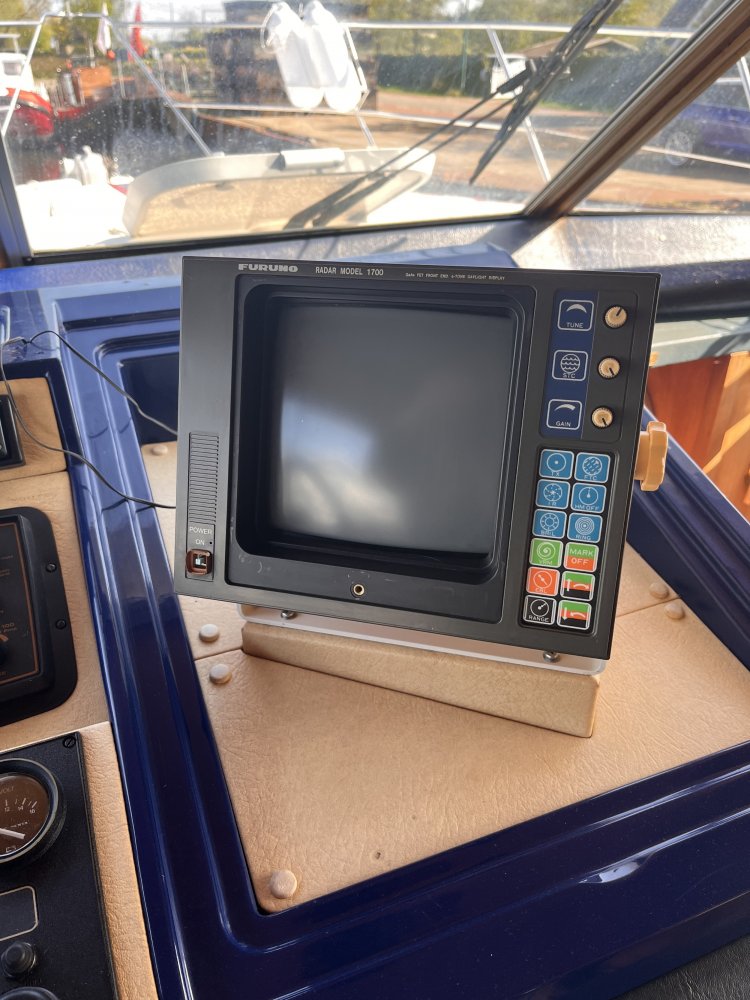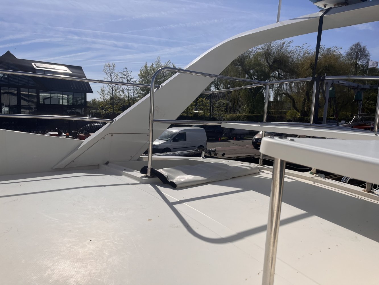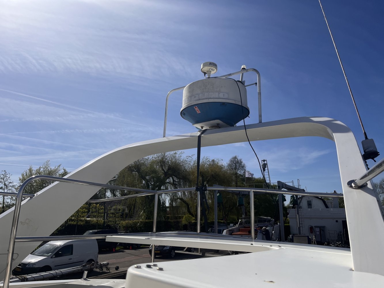 De gehele extra boven stuurstand hierboven is omringd door een mooie hoge RVS zeerailing. Dit geeft weer een extra veilig gevoel. Er is ook een RVS hekwerkje gemaakt om bijvoorbeeld het naar beneden gaan te vergemakkelijken. De raderbeugel is neerklapbaar en de radardoom/beschermkap is extra beschermd met een extra RVS beugel. Het geheel kan afgedekt worden met een extra afdektent. Deze is ook aanwezig en nog  in goede staat.