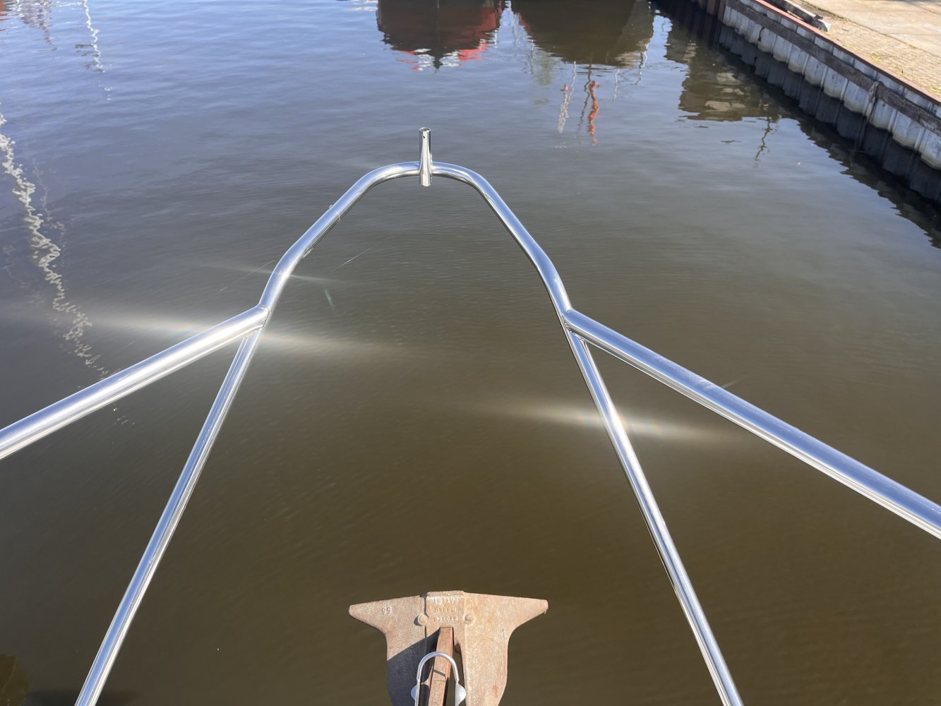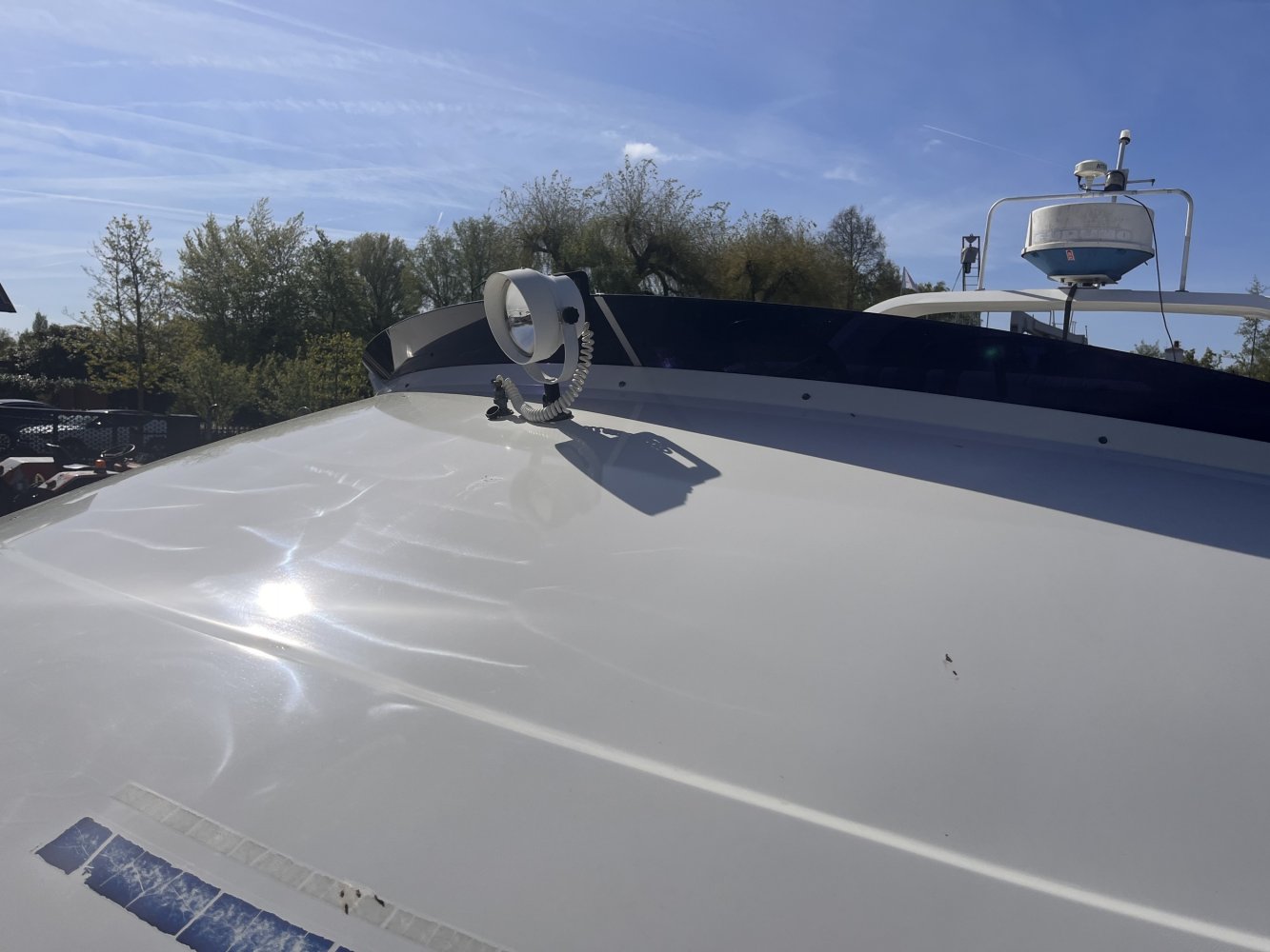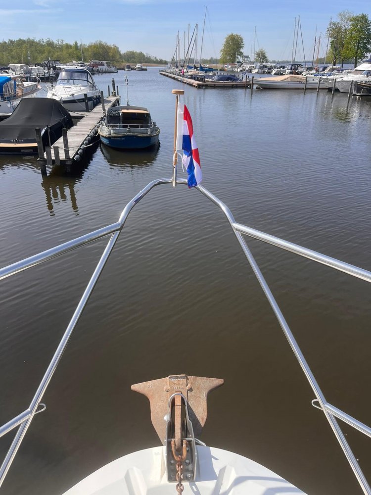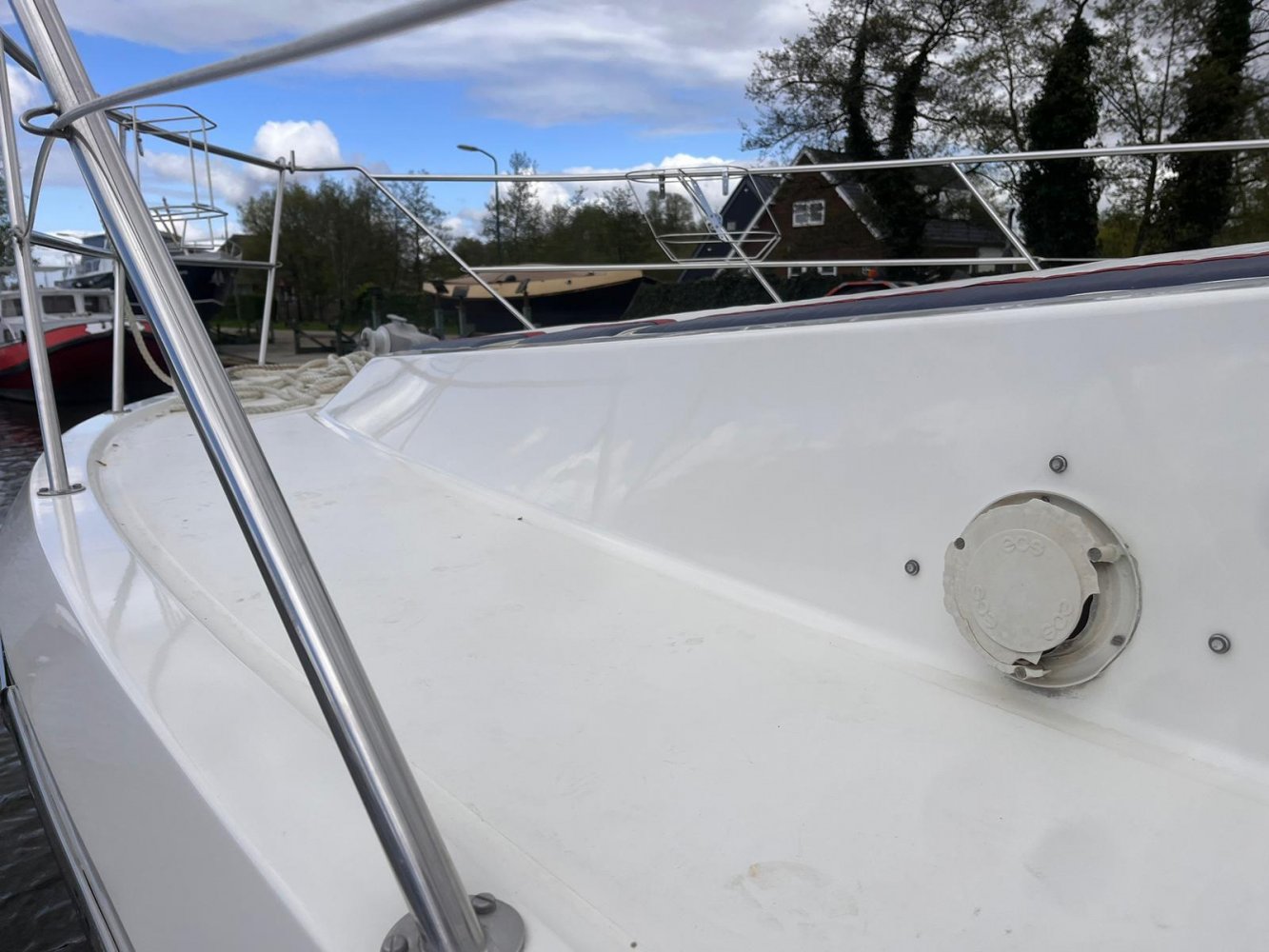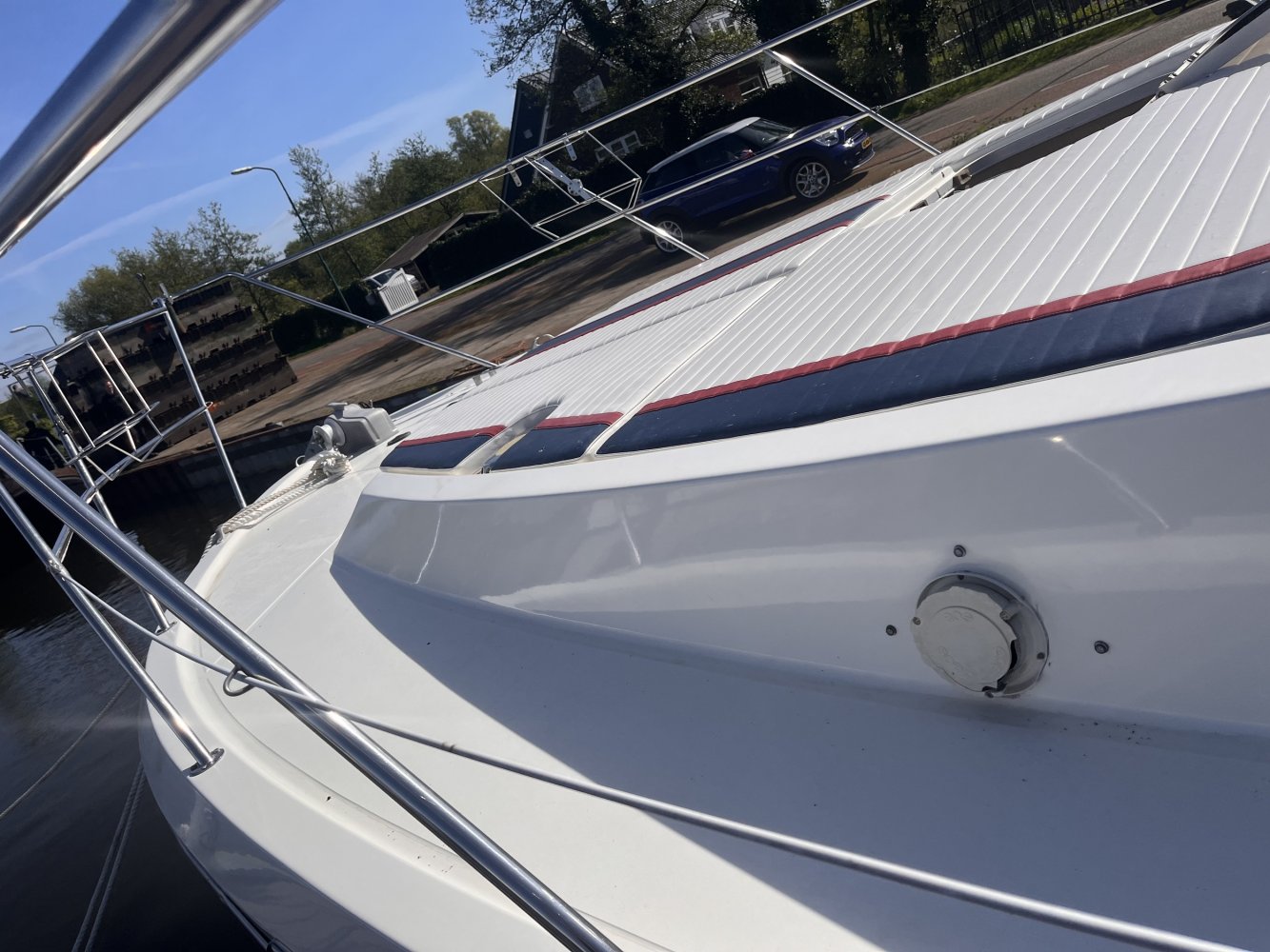 Het schip heeft nieuwe fenders, nieuwe vlag en zelfs een nieuw geuzen vlaggetje. Dit model heeft prachtige RVS patrijspoorten. Op het voordek is een geweldig mooi zonnedek gebouwd met 5 heerlijke kussens die er nog hartstikke goed uitzien. Er is een mooi ruim en goed toegankelijk zwem plateau met een RVS zwemtrap aanwezig. Dus u neemt altijd uw eigen zwembad mee. Er zijn ook nog twee Davids/boot kraantjes op het achterdek gemaakt voor het liften van een klein volgbootje.De tent van het achterdek de achterkuip is nog goed.