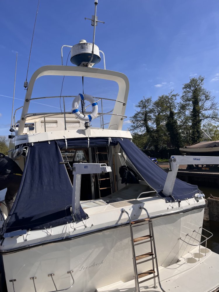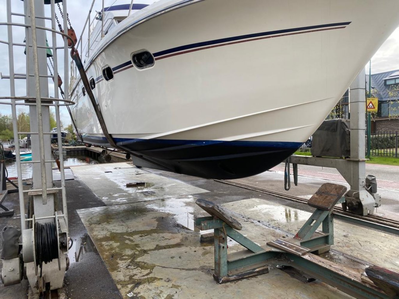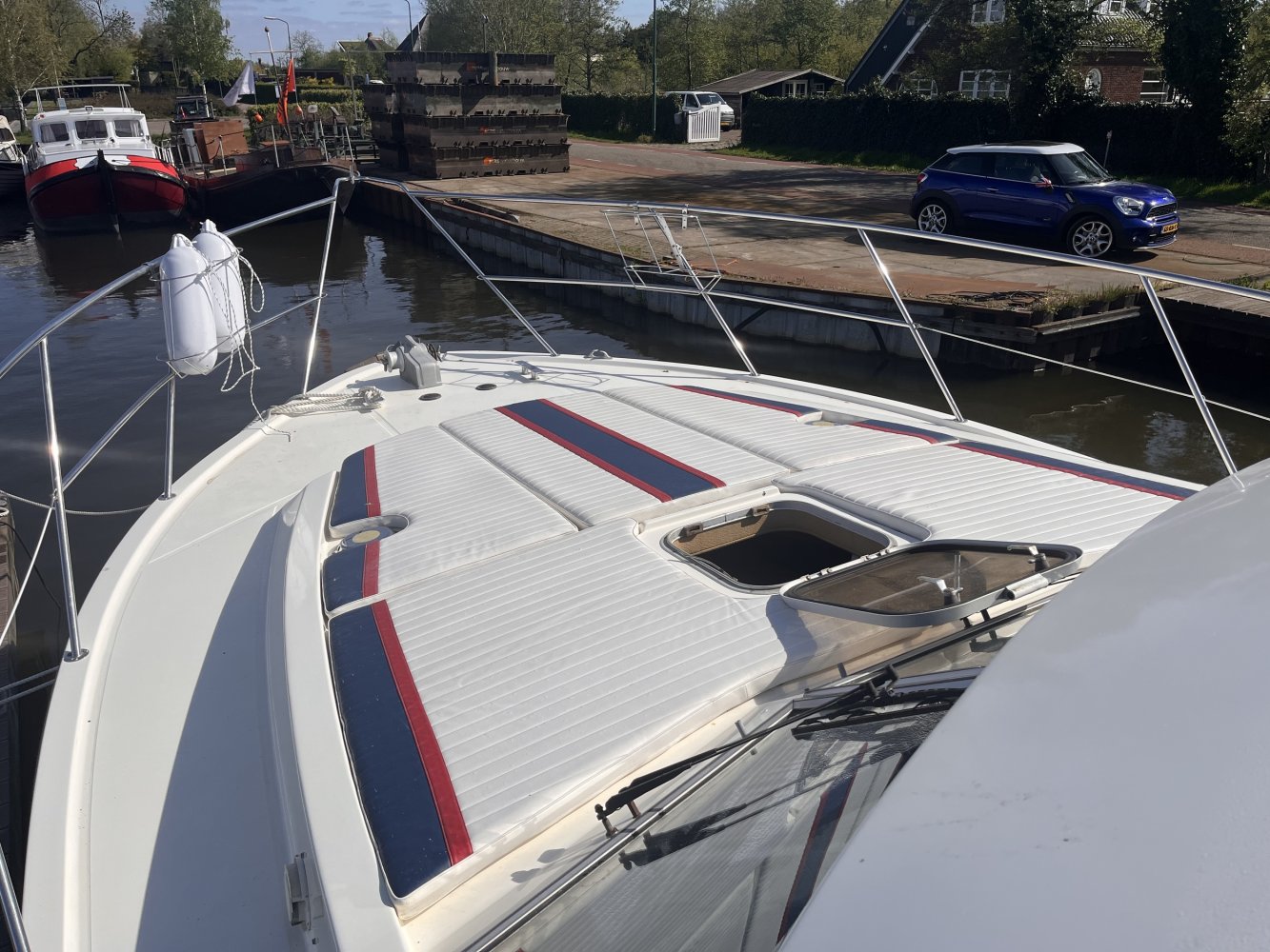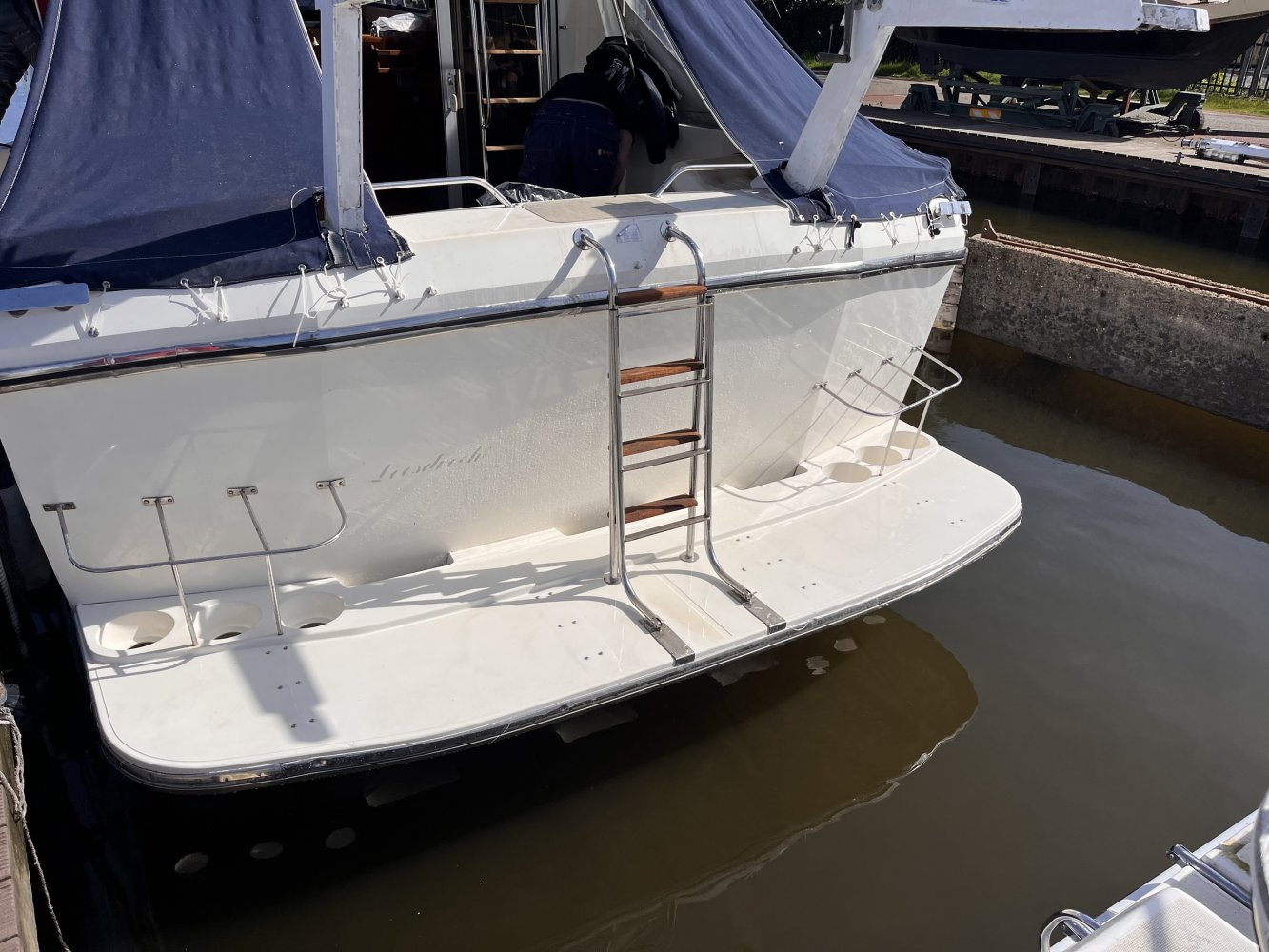 Het schip heeft nieuwe fenders, nieuwe vlag en zelfs een nieuw geuzen vlaggetje. Dit model heeft prachtige RVS patrijspoorten. Op het voordek is een geweldig mooi zonnedek gebouwd met 5 heerlijke kussens die er nog hartstikke goed uitzien. Er is een mooi ruim en goed toegankelijk zwem plateau met een RVS zwemtrap aanwezig. Dus u neemt altijd uw eigen zwembad mee. Er zijn ook nog twee Davids/boot kraantjes op het achterdek gemaakt voor het liften van een klein volgbootje.De tent van het achterdek de achterkuip is nog goed.
